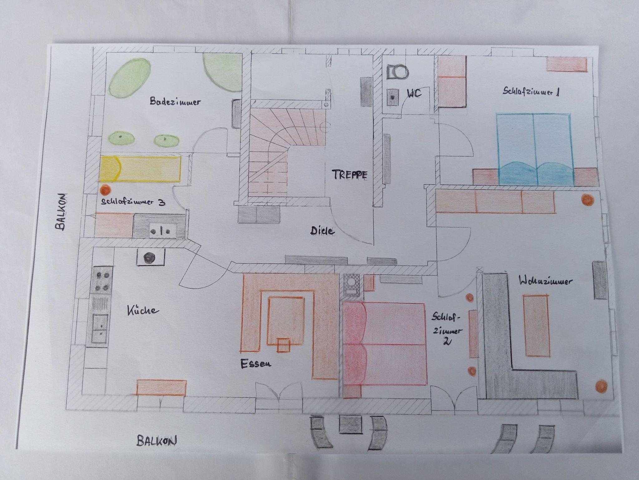 Die gemütlich eingerichtete, sonnige OG - Wohnung ist mit 29 qm Süd-West-Balkon umgeben.
