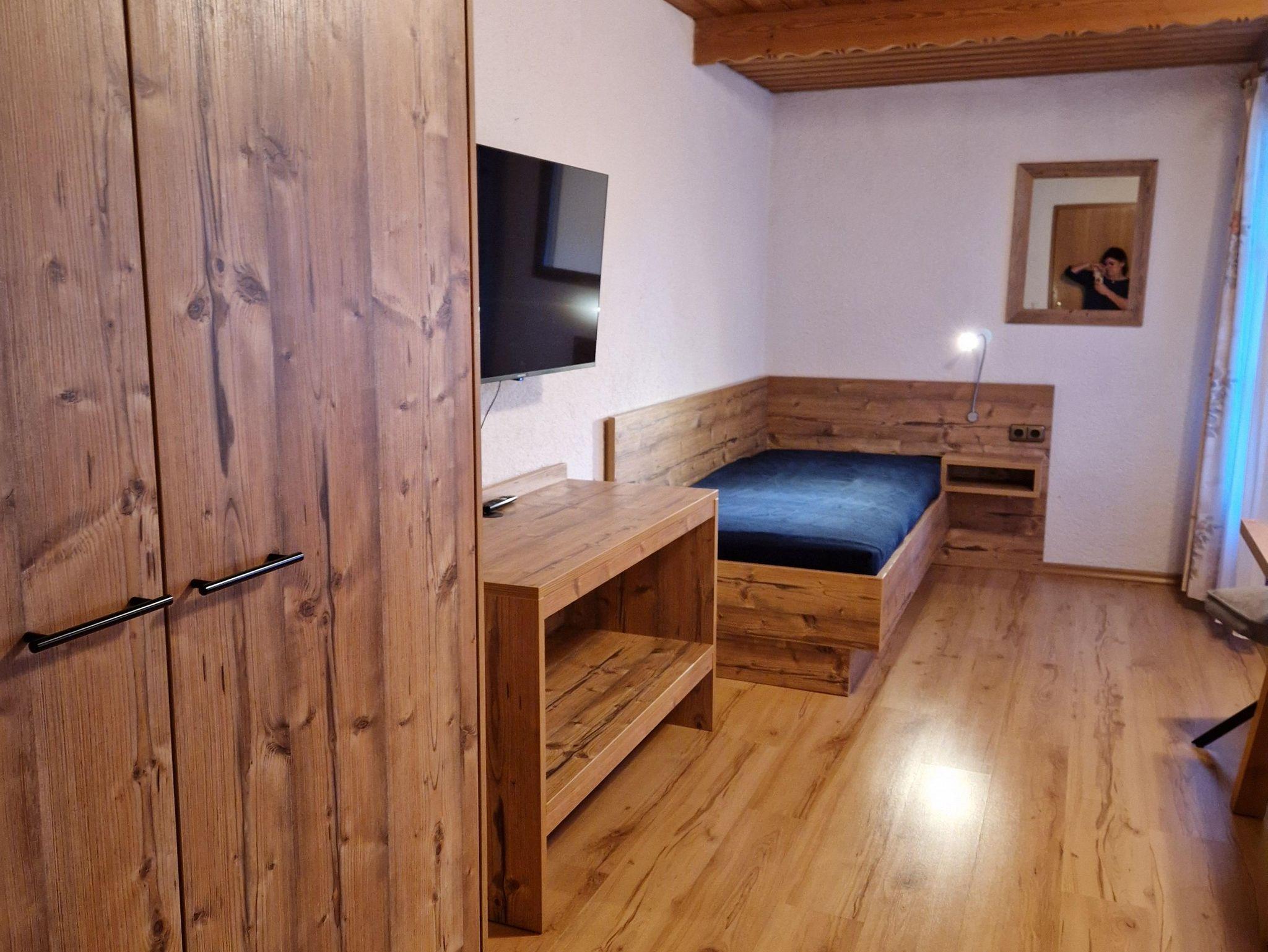 Geräumiges Dreibettzimmer mit Balkon, Bad und WC. Kabel-TV und Gästekühlschrank sind vorhanden. Föhn auf Anfrage. Gemütlicher Aufenthaltsraum mit Teeküche und WLAN-Empfang steht zur freien Verfügung.
