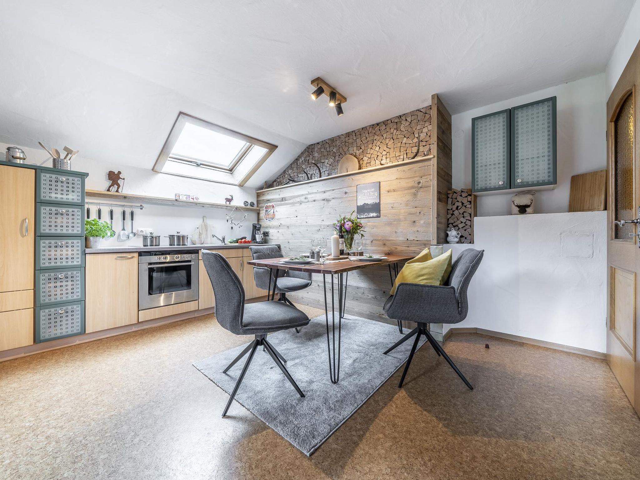 Eine komplett ausgestattete Wohnküche mit Esstisch.