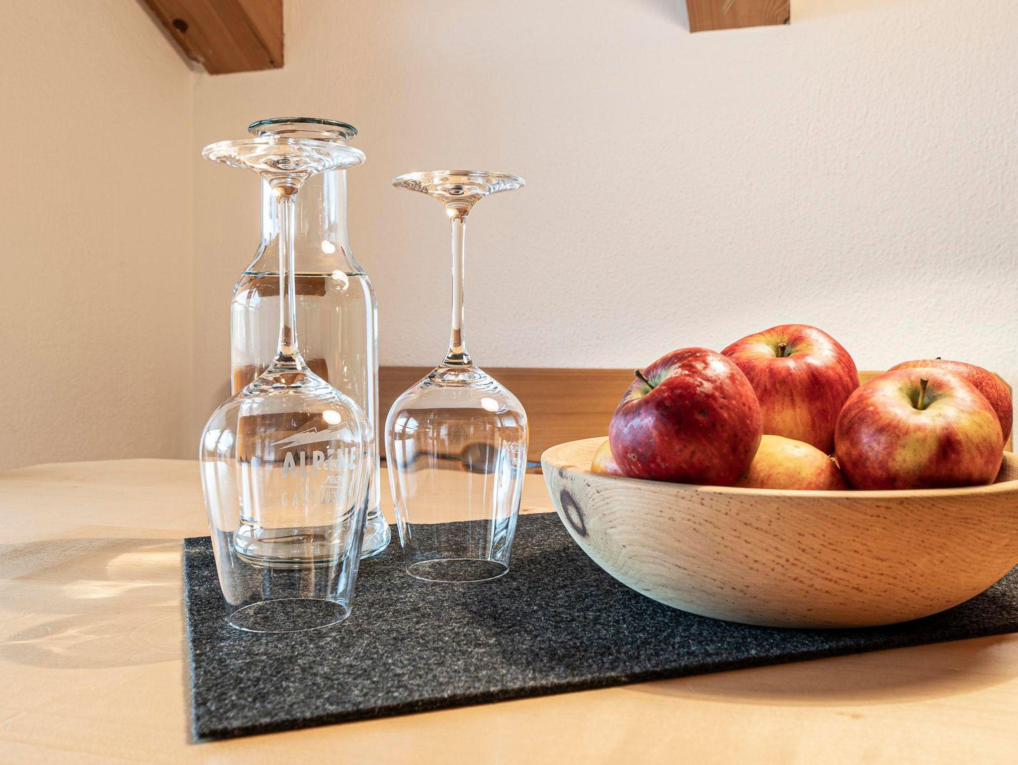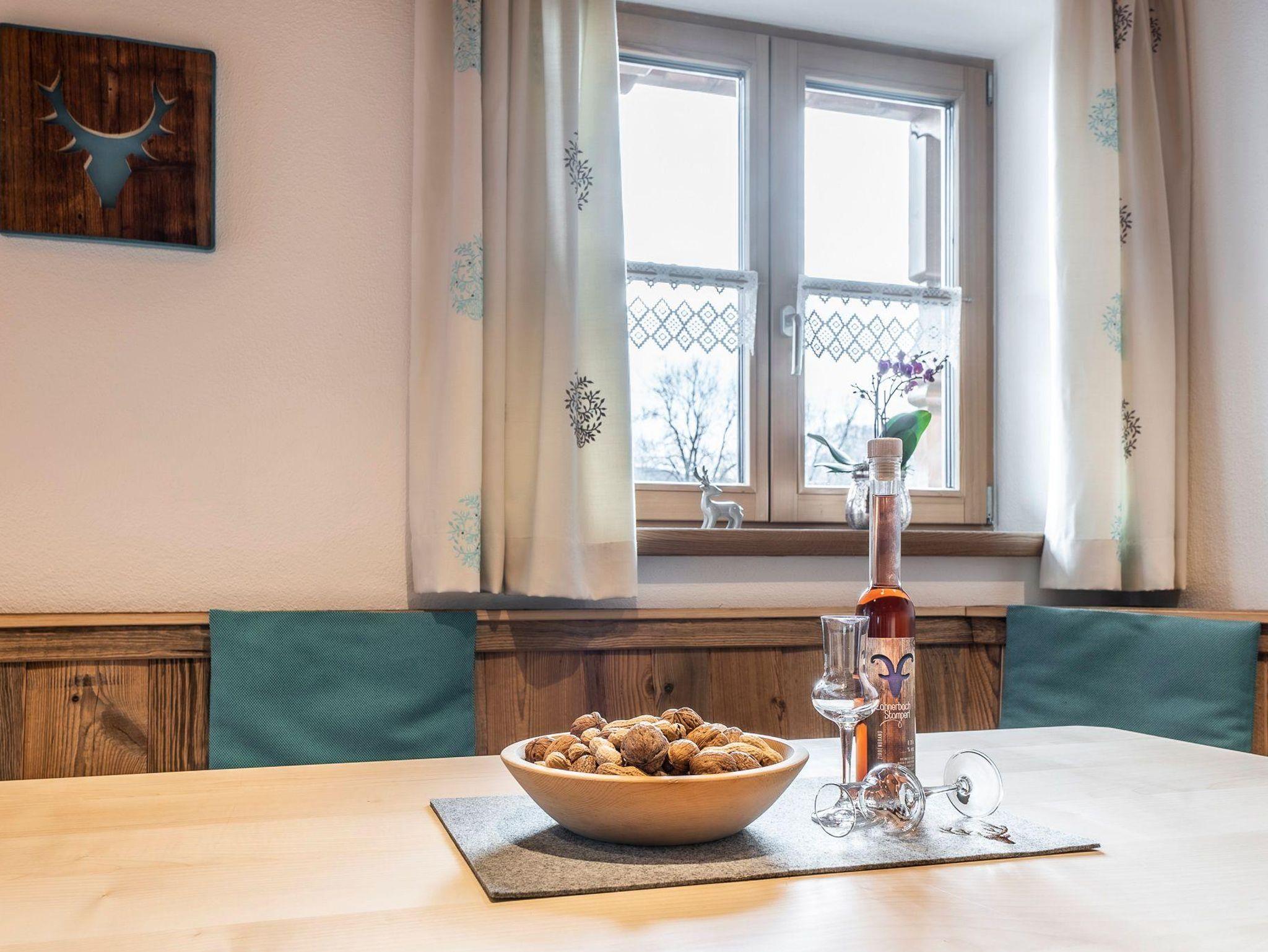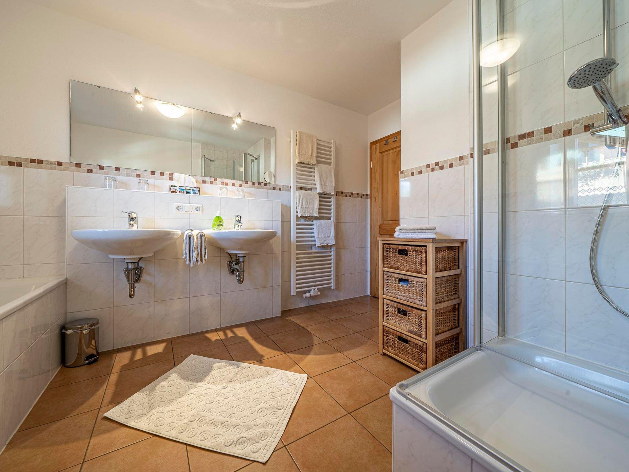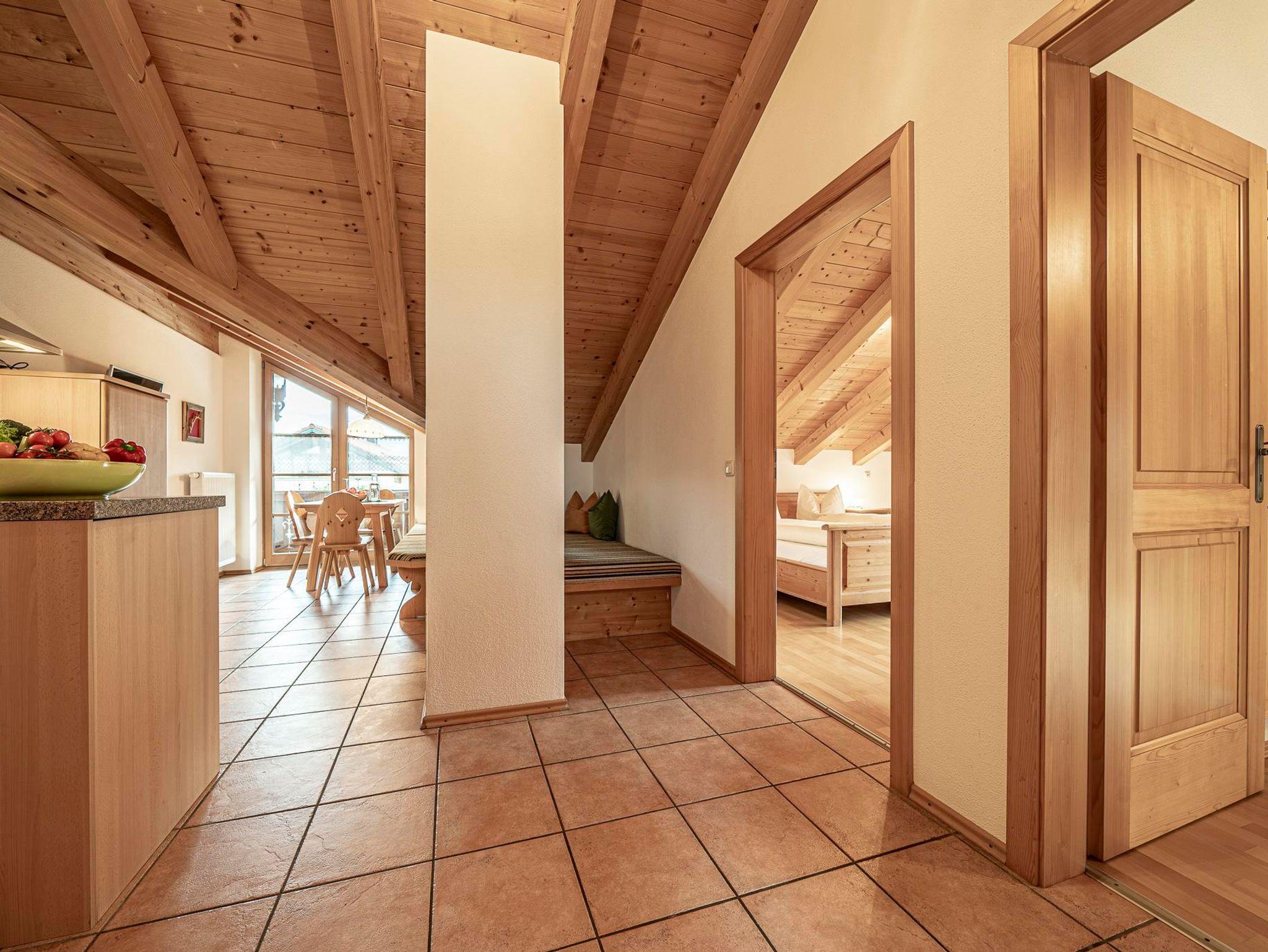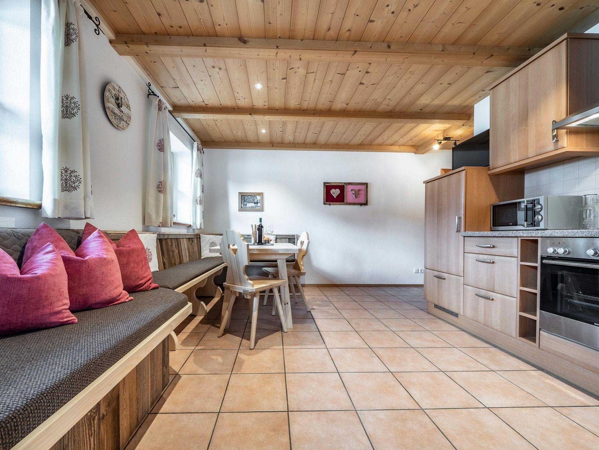 **** Ferienwohnung im 1. Stock, mit zwei handgefertigten Schlafzimmern aus Eichen- und Zirbenholz, einer komplett ausgestatteten Wohnküche mit Spülmaschine, Backofen, Mikrowelle, Kaffeemaschine und Flachbildfernseher. Das Bad ist mit Badewanne und Dusche/WC, Hand- und Badetücher, Handtuchtrockner, Kosmetikartikel und Fön. Großer möblierter Balkon mit unverbauter Bergsicht.