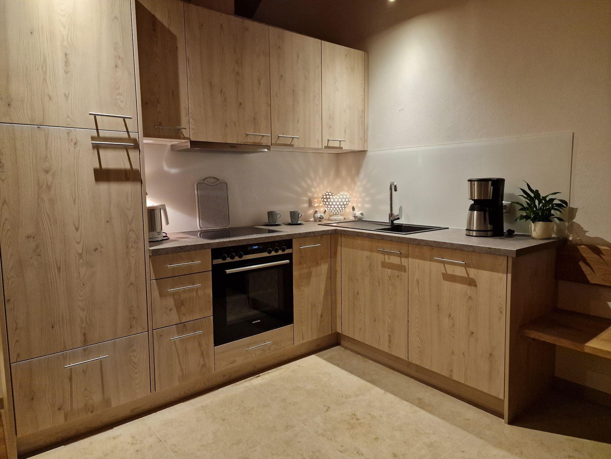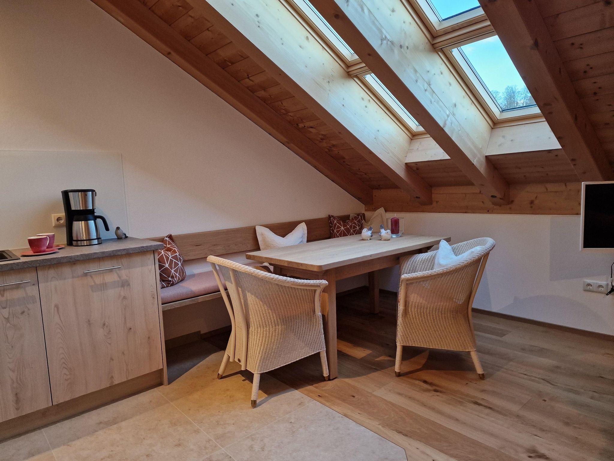 Ganz oben im Dachgeschoss erwartet Sie das „Spatzennest“ – eine helle, liebevoll eingerichtete Ferienwohnung für zwei bis drei Personen. Auf rund 40 m² bietet sie zwei gut geschnittene Zimmer mit hochwertigem Holzboden und klarer Raumaufteilung. Drei große Dachfenster lassen viel Tageslicht herein und bieten einen freien Blick in den Himmel, was für ein angenehmes, luftiges Wohnklima sorgt. Die moderne Küchenzeile ist mit Spülmaschine, Kaffeefiltermaschine, Herd-Backofen, Wasserkocher und Toaster ausgestattet. Direkt angrenzend befindet sich die gemütliche Essecke. Das separate Schlafzimmer sorgt für erholsame Nächte. Ein Bad mit Dusche, WC und Haarföhn sowie Flachbild-TV und WLAN runden das Angebot ab. Bettwäsche sowie Hand- und Geschirrtücher sind vorhanden (Wechsel ab der 2. Woche).