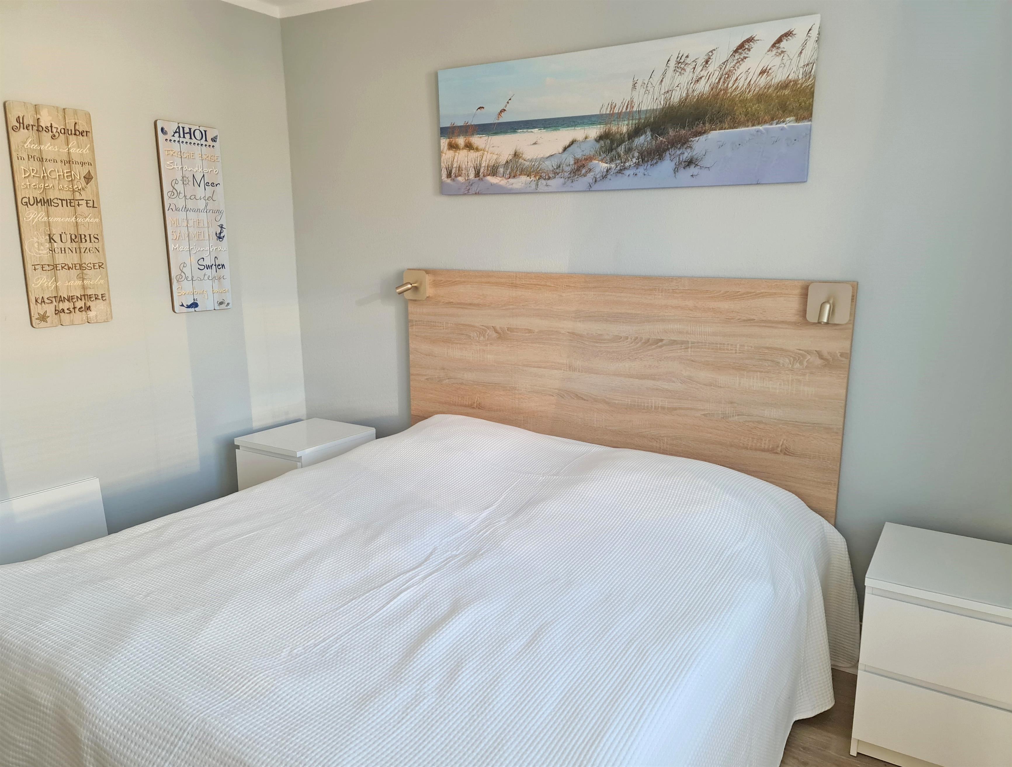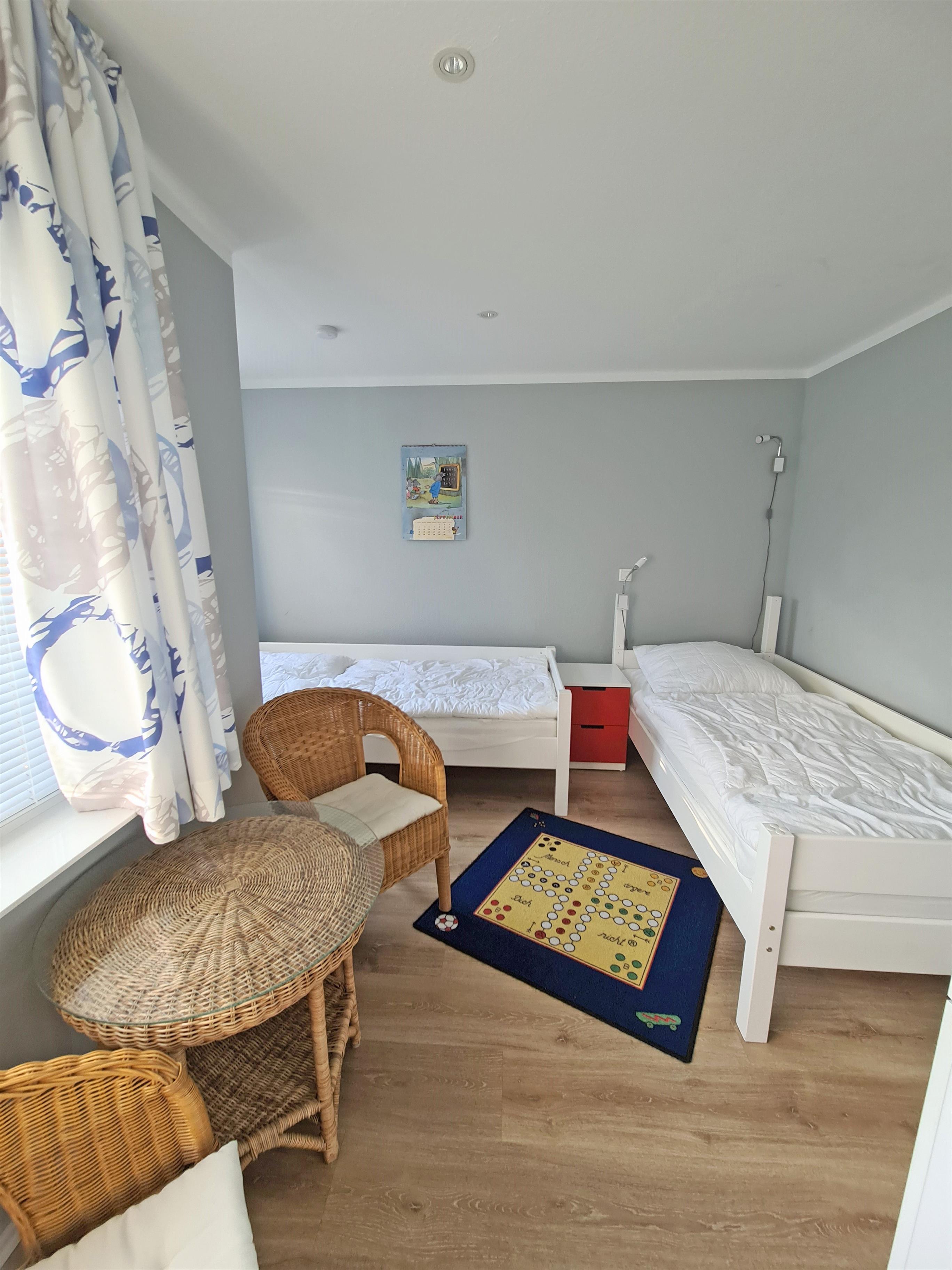 Durch das Elternschlafzimmer, ausgestattet mit einem Doppelbett (90x200) und einem geräumigen Einbaukleiderschrank, gelangen Sie zum Duschbad und den Flur entlang zum 2. Schlafzimmer. Hier stehen Ihnen zwei Einzelbetten (90x200) zur Verfügung.