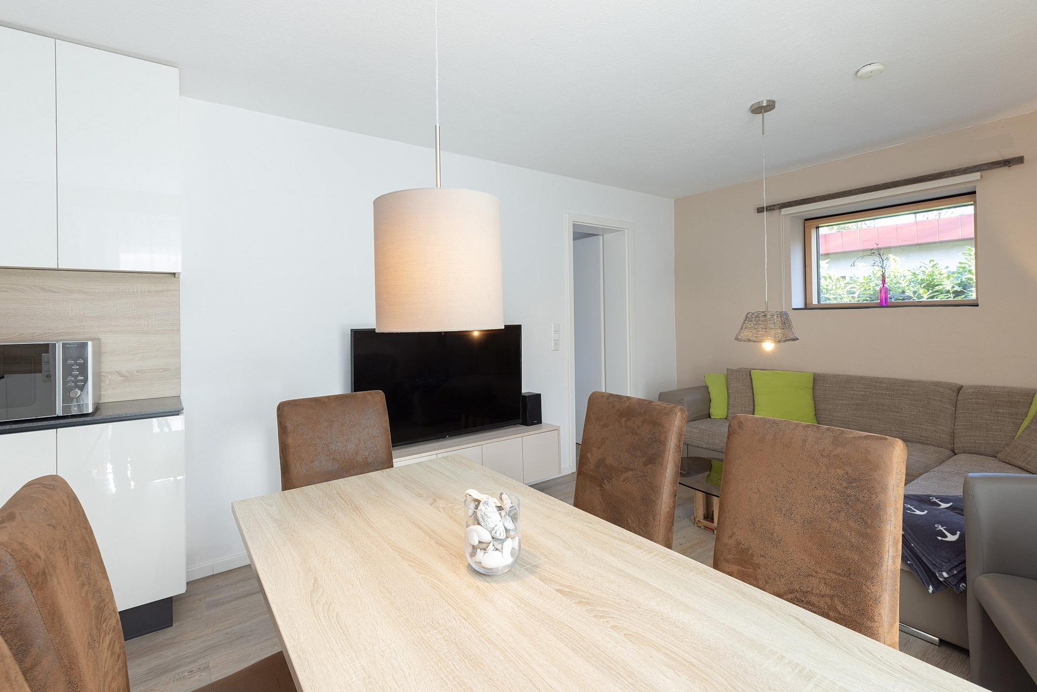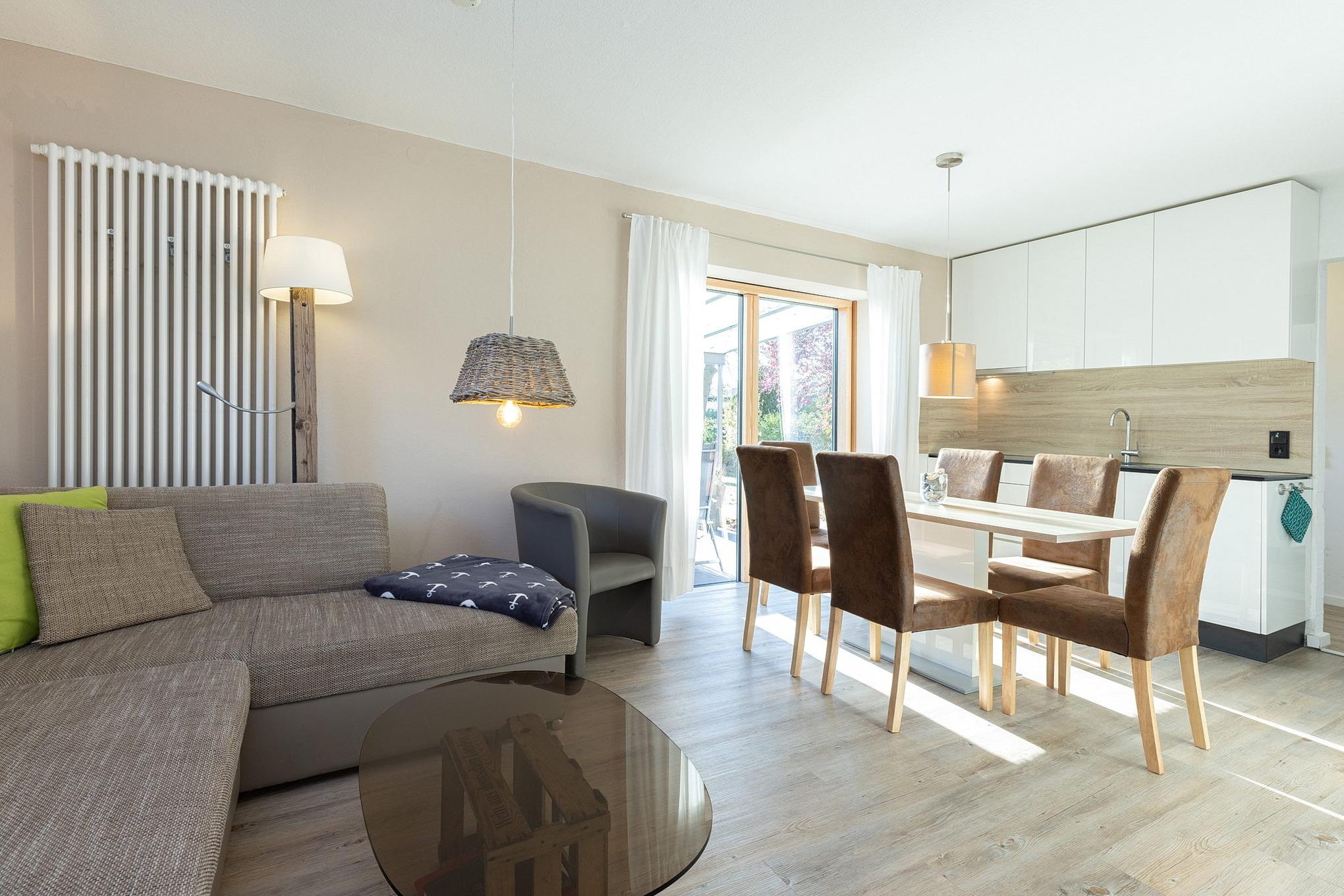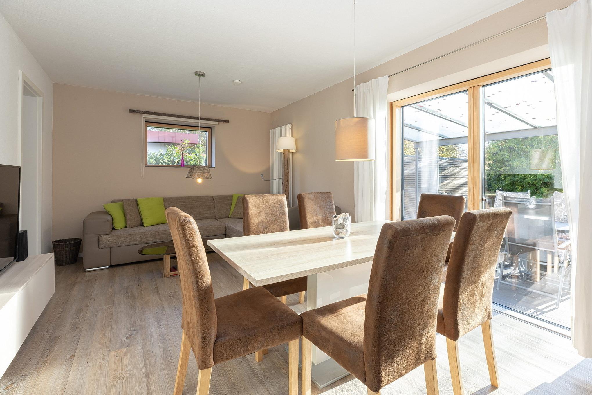Helles, freundliches, modern eingerichtetes Wohn- und Esszimmer mit direktem Zugang zur Terrasse. Das Wohn- und Esszimmer ist mit einem Essplatz für 6 Personen, einer Eckcouch mit Schlaffunktion (140x195cm), einem Couchtisch und einem Sideboard ausgestattet. Zur Unterhaltung stehen ein Flachbildschirm und eine Mini-Stereoanlage mit CD-Player zur Verfügung.