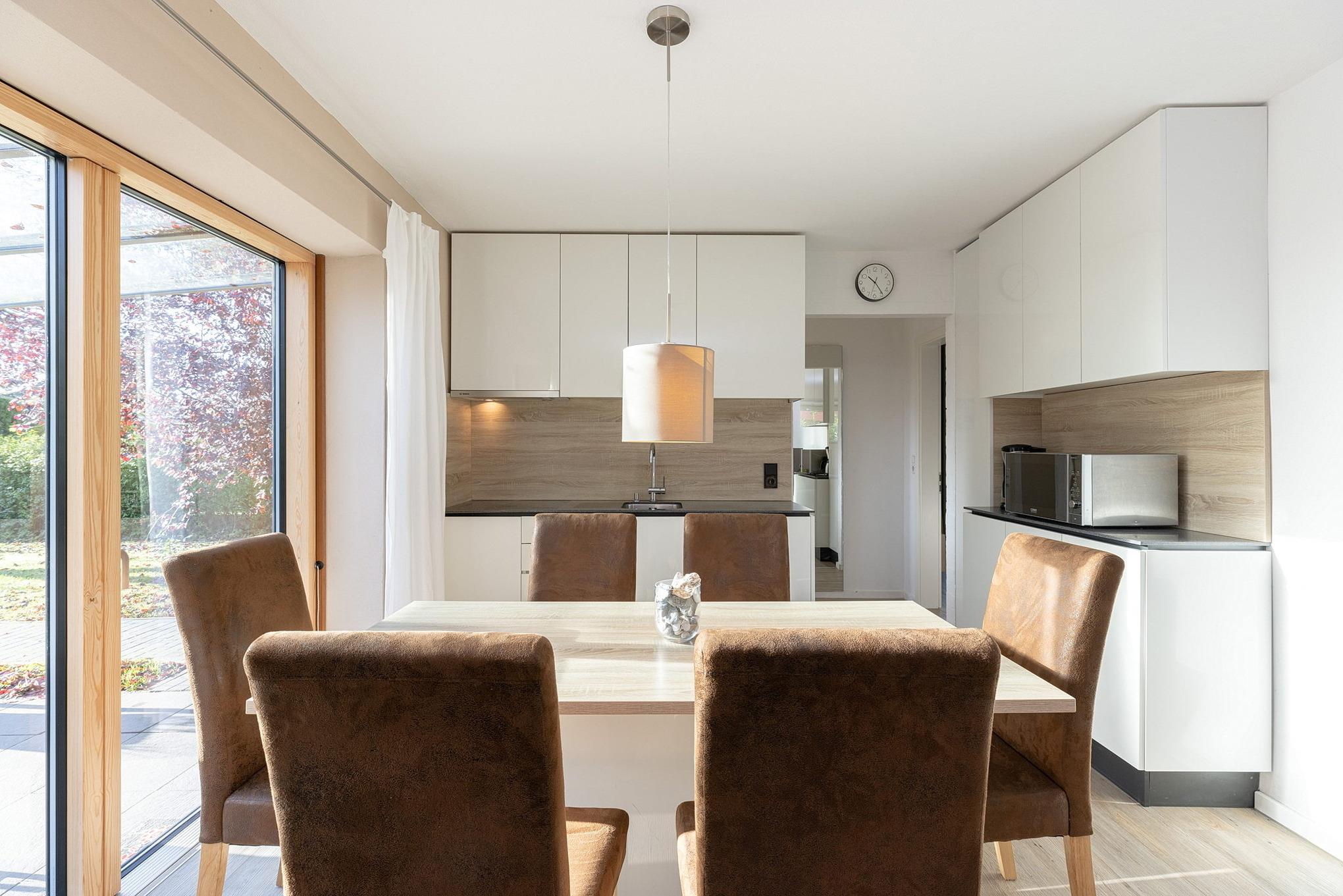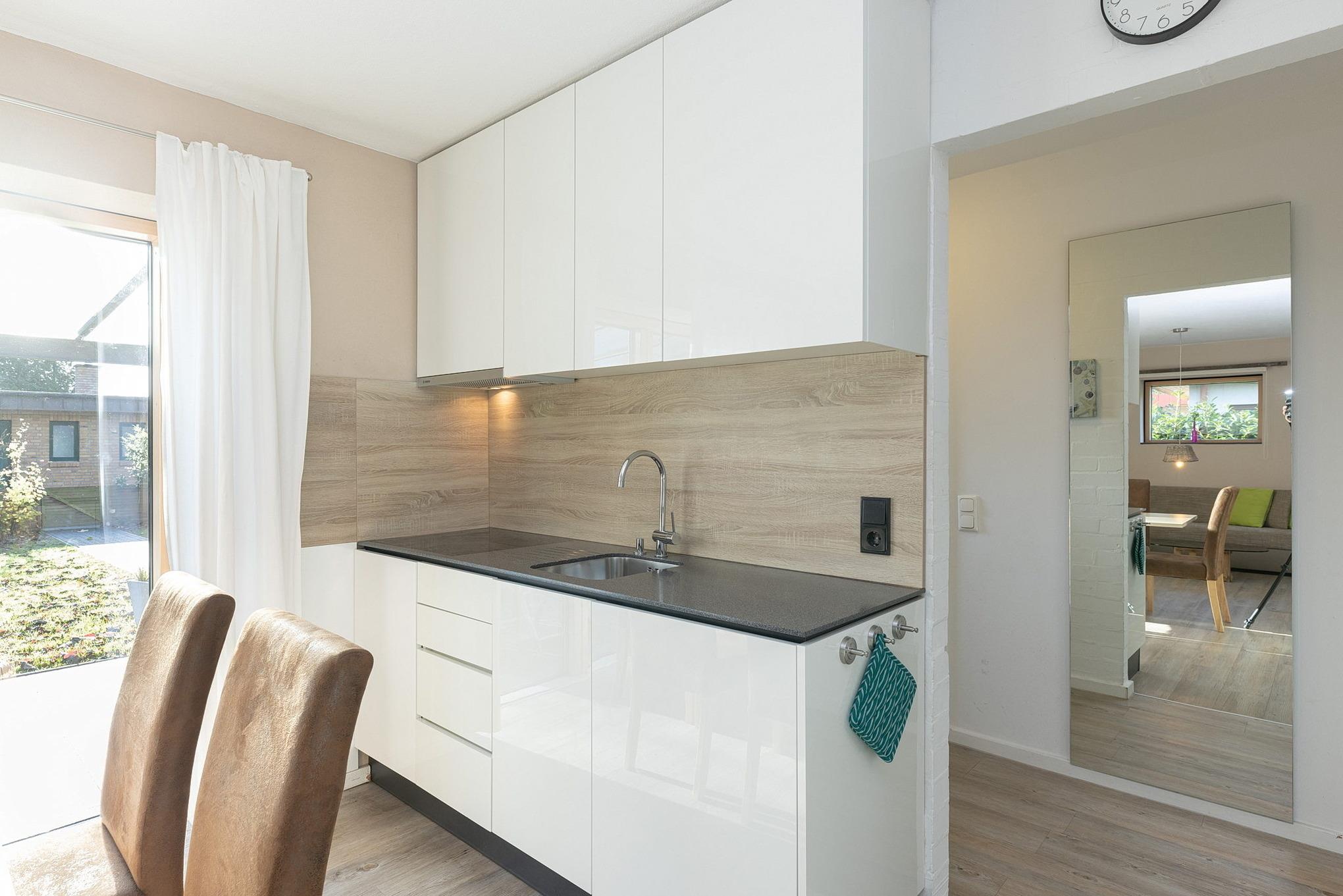 Moderne, komplett ausgestattete, zum Wohn- und Esszimmer offene Küche mit 4-Platten Cerankochfeld (Induktionsherd), Mikrowelle mit Backofenfunktion, Spülmaschine, Kühlschrank mit Gefrierfach, Kaffeemaschine, Toaster, Wasserkocher und Mixer.