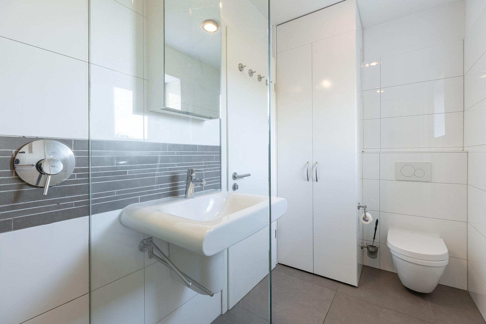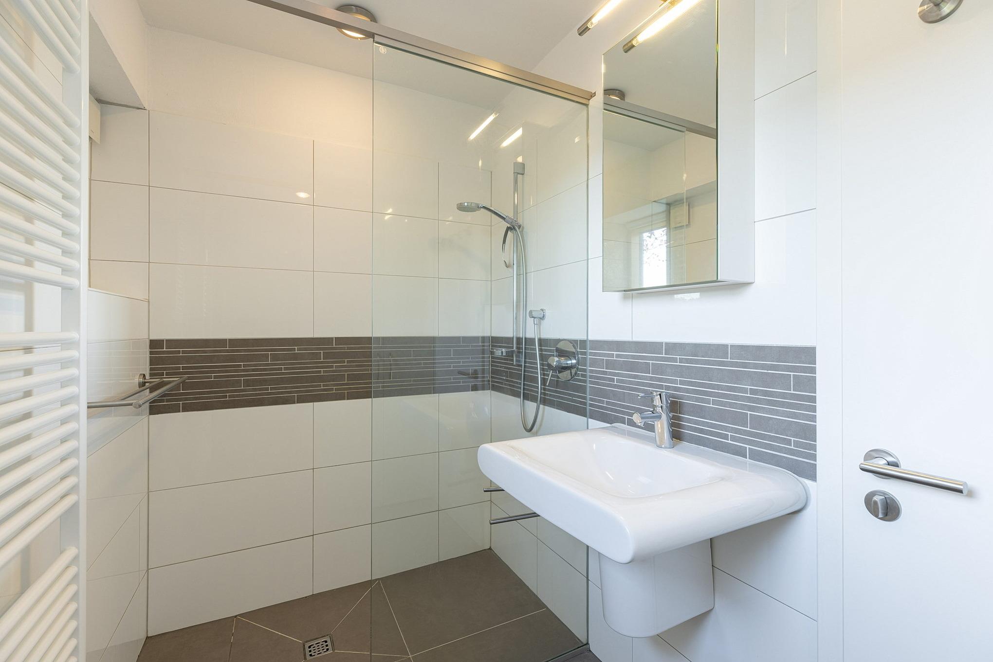 Modernes, hell gefliestes Tageslichtbad mit ebenerdiger Dusche, WC und Waschbecken.