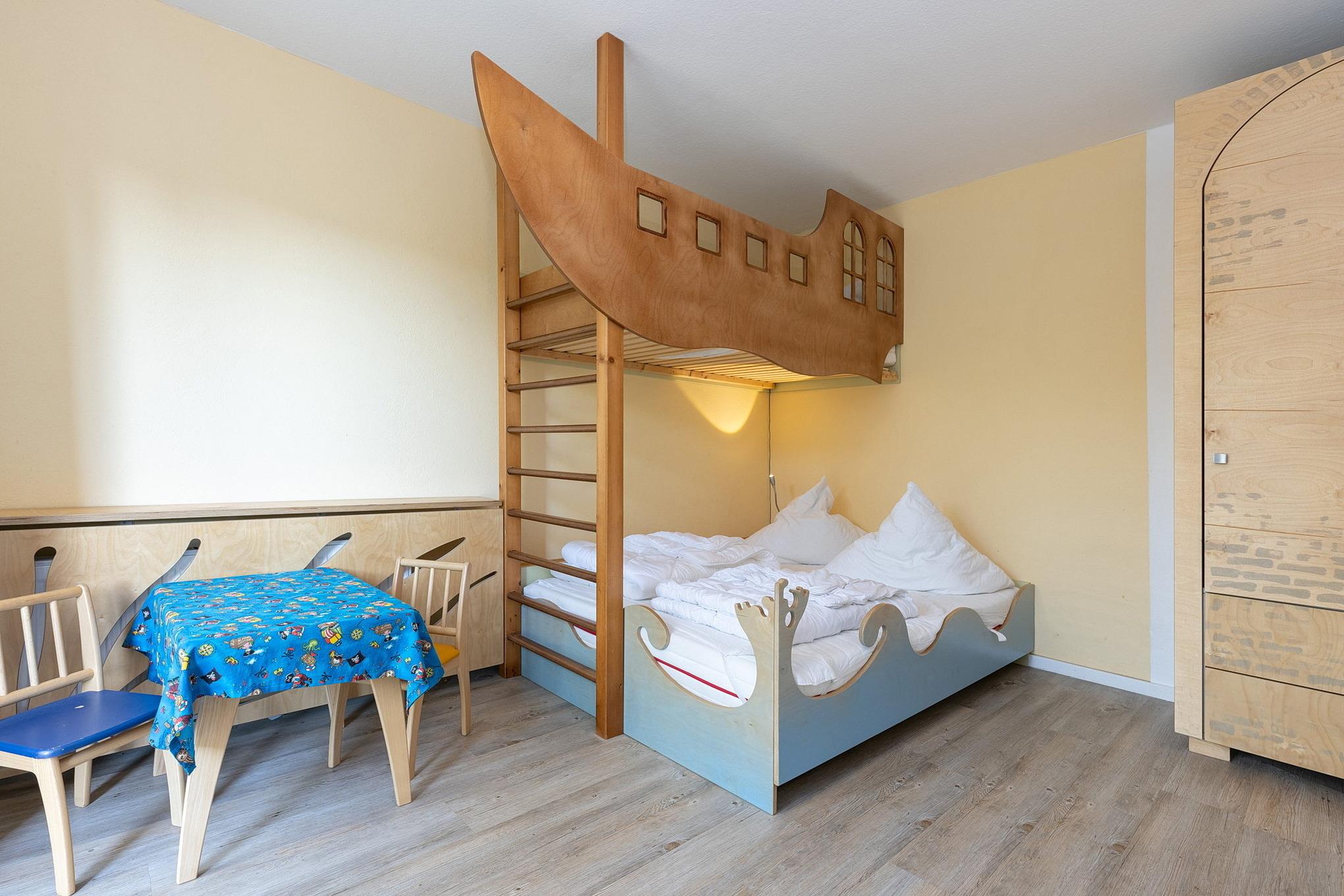 Separates Kinderzimmer mit einem Hochbett in Form eines Schiffes. Die Liegefläche beträgt unten 1,40 m x 2 m und oben 0,9 m x 2 m. Es bietet einen Raum, in den Kinder sich gern zwischendurch zum Spielen zurückziehen. Vom Kinderzimmer aus hat man direkten Zugang auf eine, kleine, nach Westen gelegene Terrasse. Die Terrassentür verfügt über einen Verdunklungsvorhang.