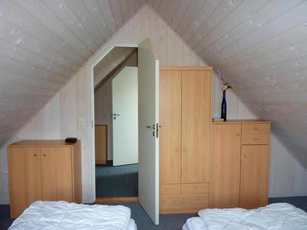 Dort befinden sich zwei weitere Schlafzimmer. Eins mit einem 1,80 x 2,00 m großen Bett, das andere mit zwei Betten von je ca. 0,90 x 2,00 m (zusammenschiebbar), sowie das Gäste WC.