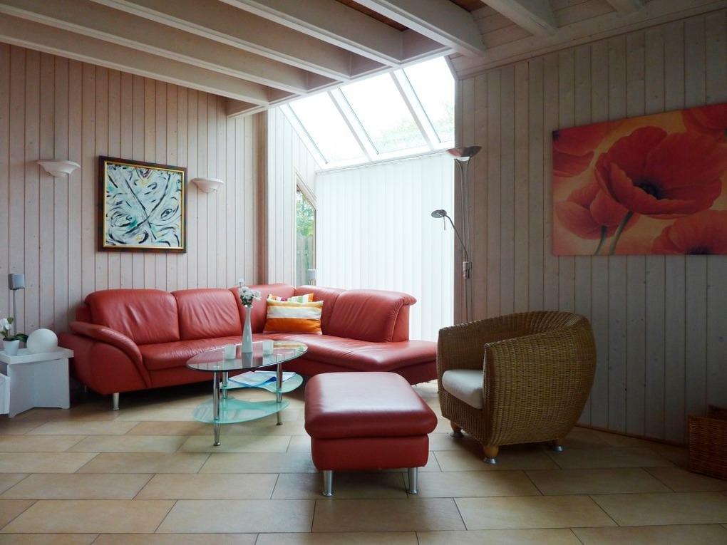 Das Zentrum des Hauses ist das helle, lichtdurchflutete Wohnzimmer mit seinem - einem Wintergarten gleichenden - Glaserker.