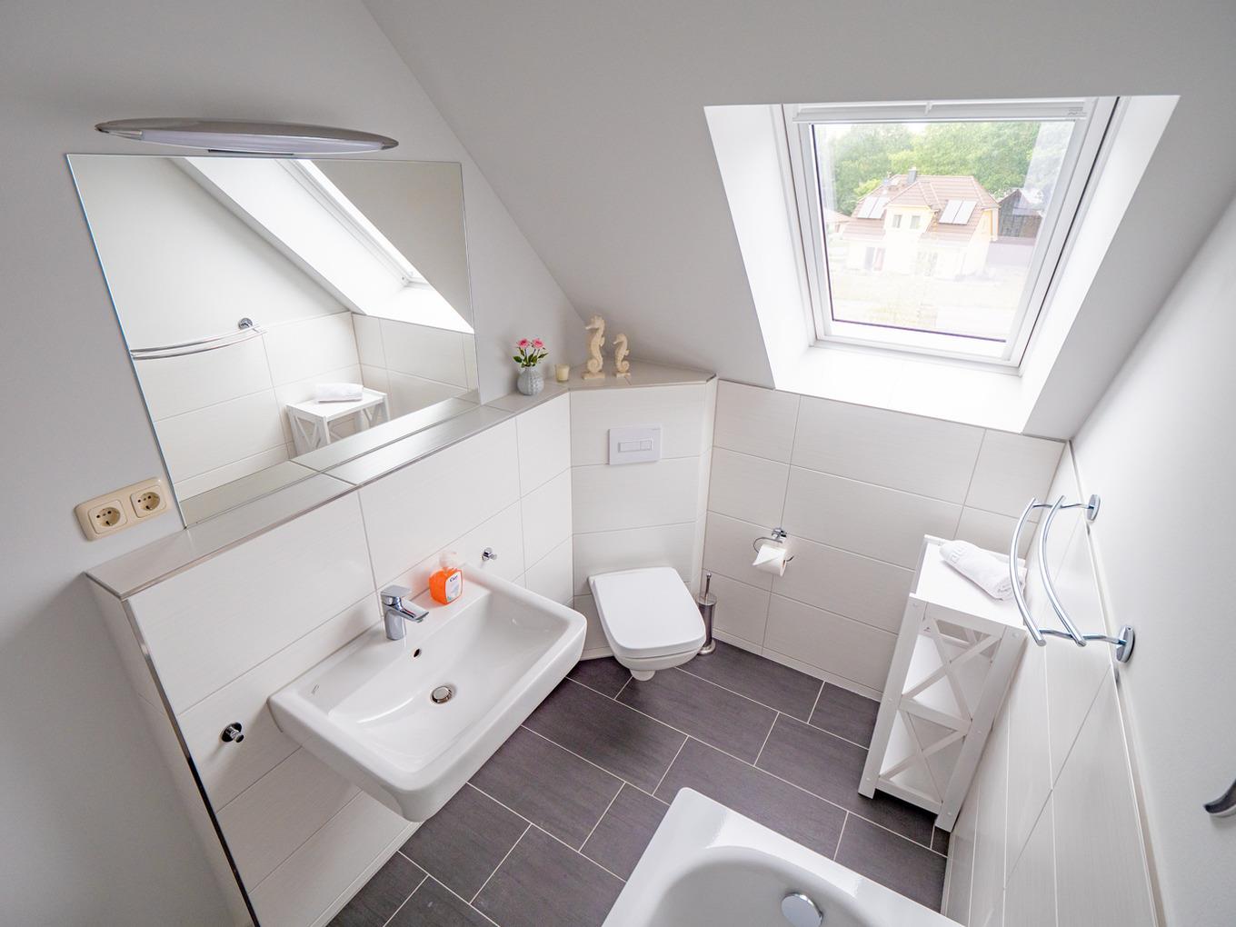 Die Schlafzimmer und das zweite Badezimmer mit Wannenbad liegen im zweiten Stock.