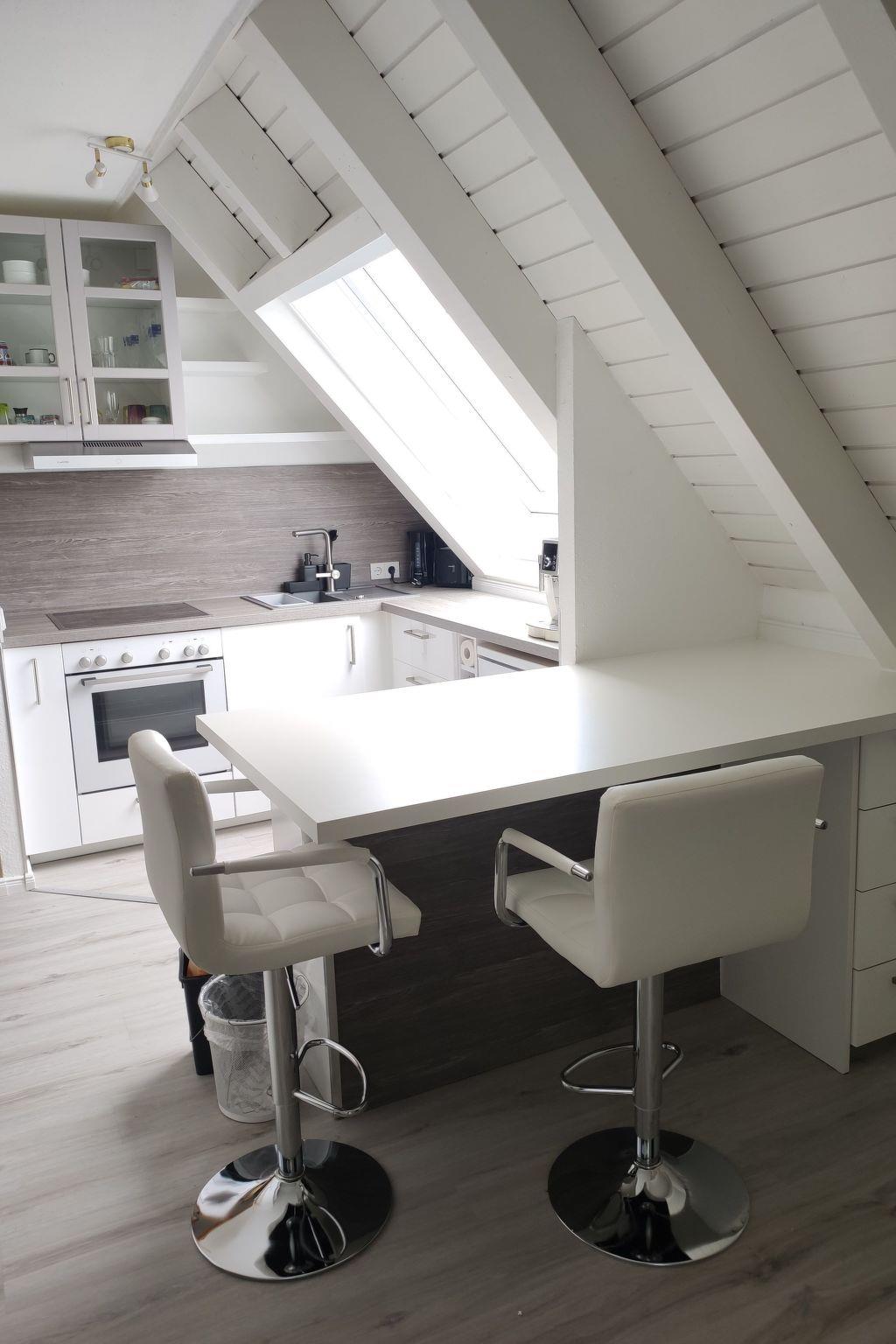 A dining counter with two beautiful white bar stools is the ideal place for breakfast, eating, cosy get-togethers or games.