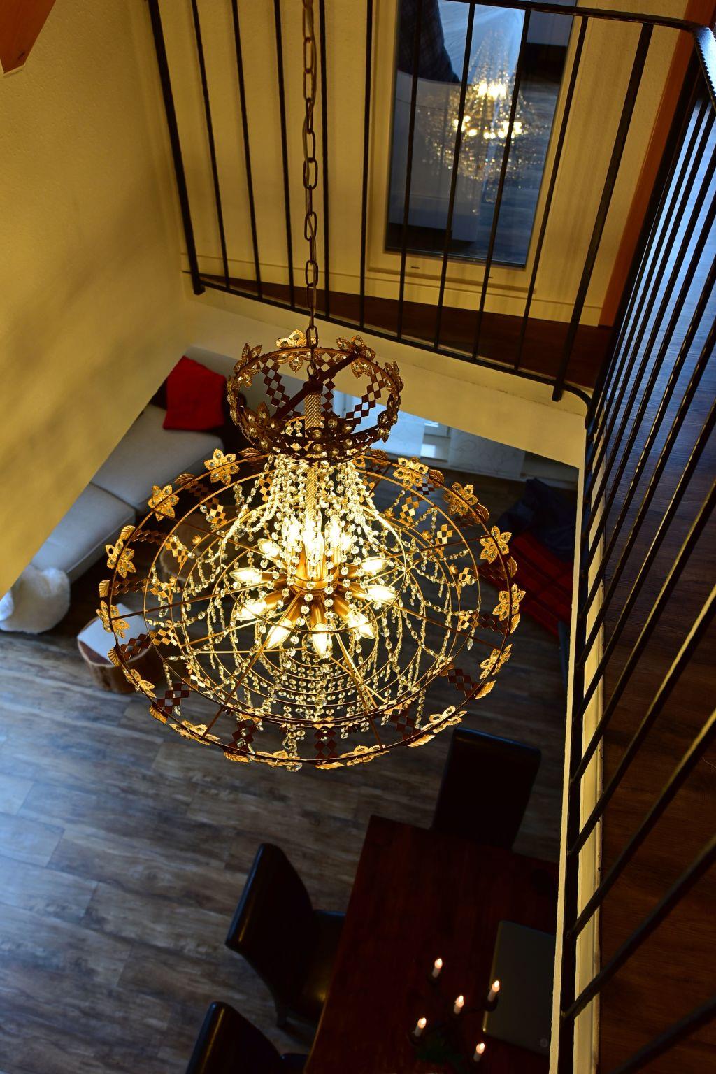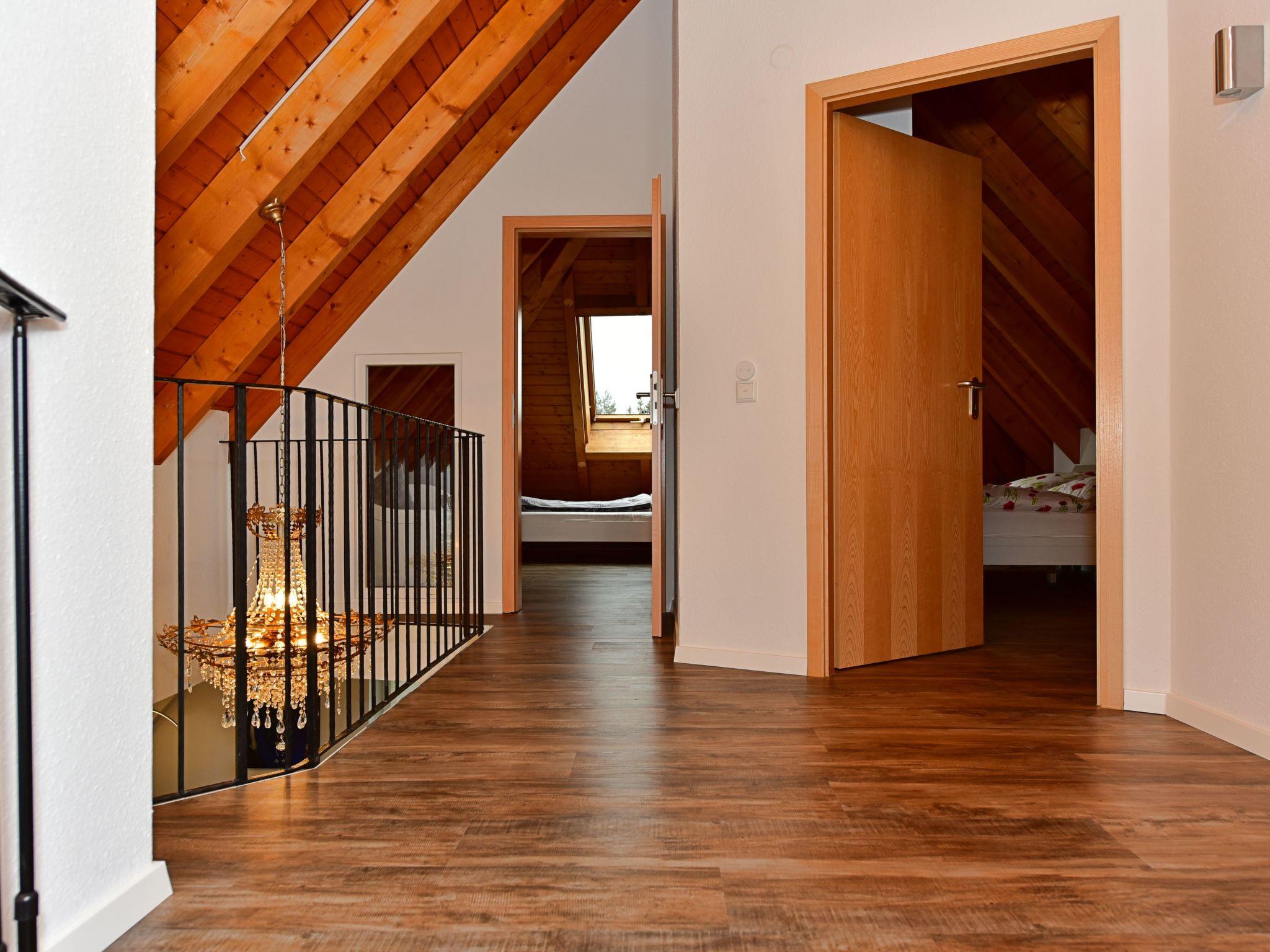 A spiral staircase leads to the upper floor with gallery and view into the living room. From the gallery you reach the three separate bedrooms.