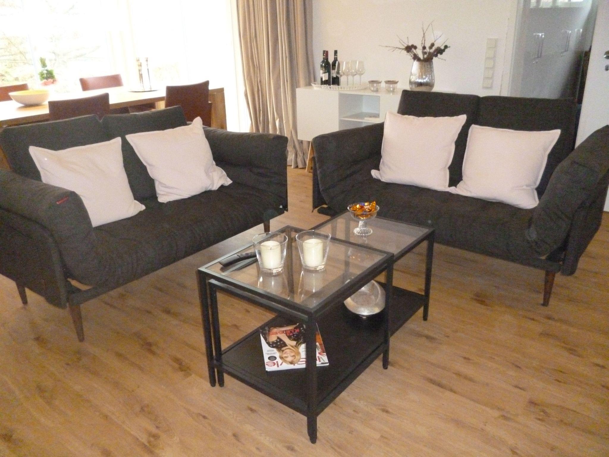 The living / dining area with entertainment - 34 sqm: The spacious living room is both luxurious and cosy and guarantees you relaxing evenings after your excursions or relaxing entertaining time in bad weather. The comfortable sofa set with 3 sofa beds offers you the perfect place to chill out. 6 people will find a comfortable seat here. You will feel right at home here in front of the elegant white display cabinet wall and the exclusive Smart TV/Home Cinema entertainment equipment (55" SAMSUNG TV / BOSE soundbar / Playstation PS 4 / NETFLIX) and enjoy your holiday. A sideboard with beautiful decorations also adorns the room. A Fritz!Fon telephone with babyphone function is available here. The dining area with a solid country-style oak table seats up to 6 people. Here you will find a cosy place for sociable evenings with family and friends.