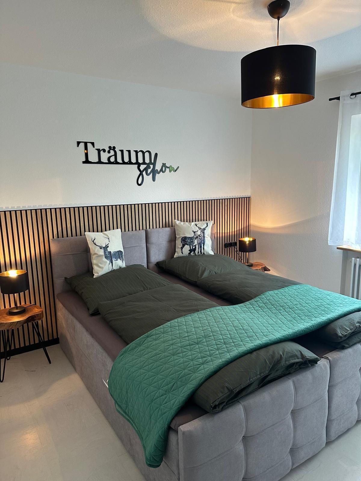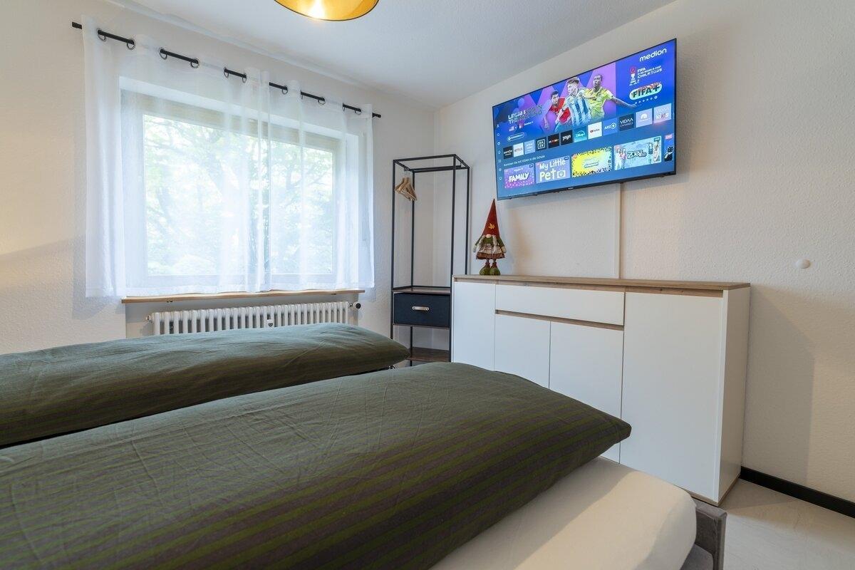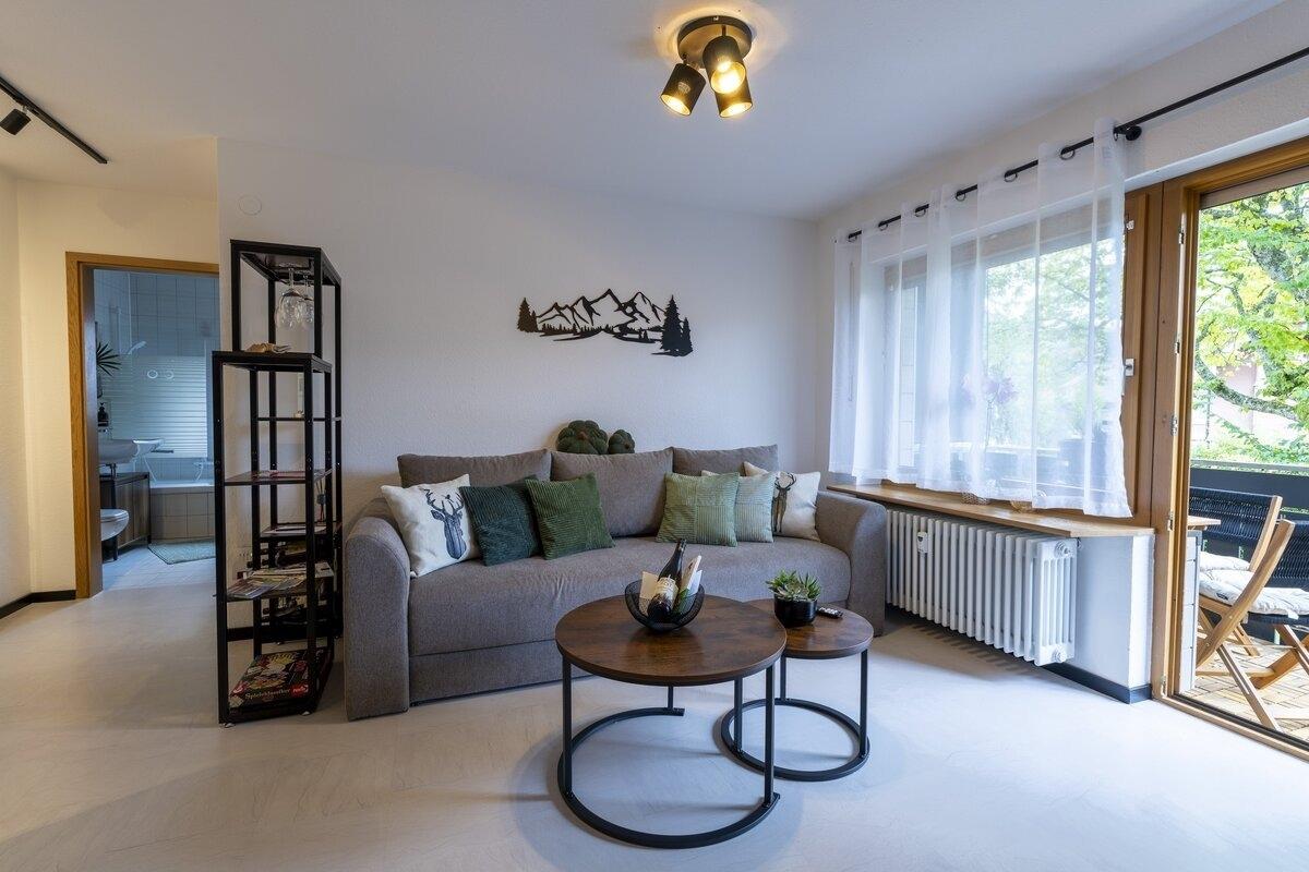 Die moderne Wohnung verwöhnt mit einer voll ausgestatteten Küche, einem Badezimmer mit einladender Badewanne und einem sonnigen Ost-Balkon, der mit Wiesenblick zum Frühstück in der Morgensonne einlädt. Im gemütlichen Wohnzimmer erwartet Sie eine stilvolle Schlafcouch, die sich in ein vollwertiges Boxspringbett verwandelt und Hotelkomfort verspricht. Der einladende Essbereich ist perfekt für gemeinsame Mahlzeiten. Im Schlafzimmer sorgt ein flexibles Boxspringbett für erholsamen Schlaf – wahlweise als Doppelbett oder zwei Einzelbetten. WLAN und zwei Fernseher runden das Wohlfühlpaket ab.