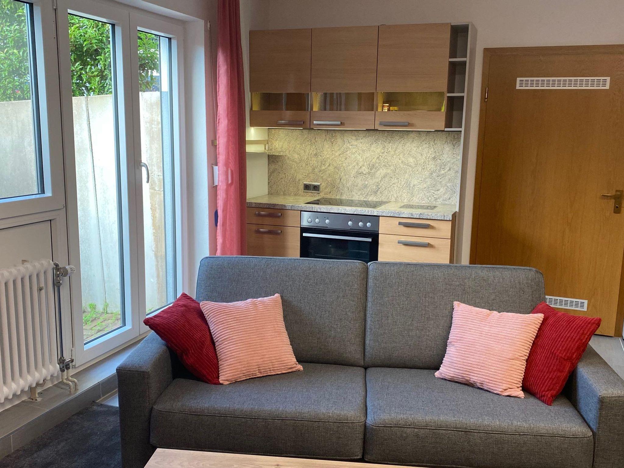 Das Appartement mit Lichthof liegt im Gartengeschoss. Im Preis enthalten sind: Reinigung, Bettwäsche/Handtücher, TV, Internet/WLAN, Kopierer/Scanner/Drucker, Waschmaschine, Wäschetrockner, Kaffeemaschine, Haarfön, Wasserkocher, Schreibtisch mit Bürostuhl und Stellplatz.