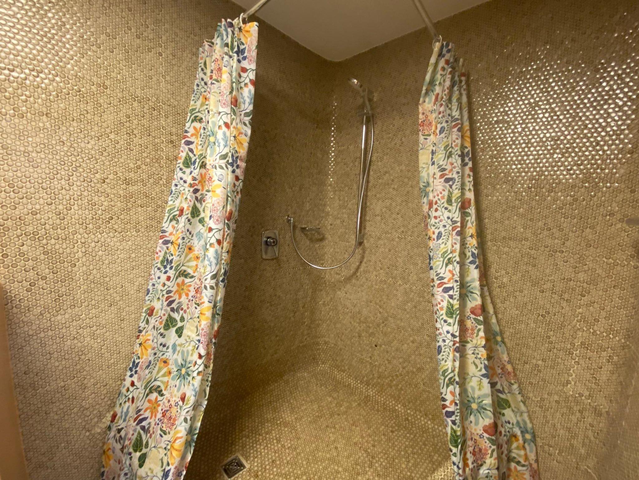 Das Wohn-/ Esszimmer enthält eine voll ausgestattete Küche mit Elektrogeräten (Kochfeld, Backofen, Kühlschrank, Geschirrspülmaschine, Mikrowelle,Kaffeemaschine, Wasserkocher). Spüle und Dusche liegen im angrenzenden Raum. Das WC mit Waschbecken, Waschmaschine und Wäschetrockner ist über einen kurzen Flur erreichbar.