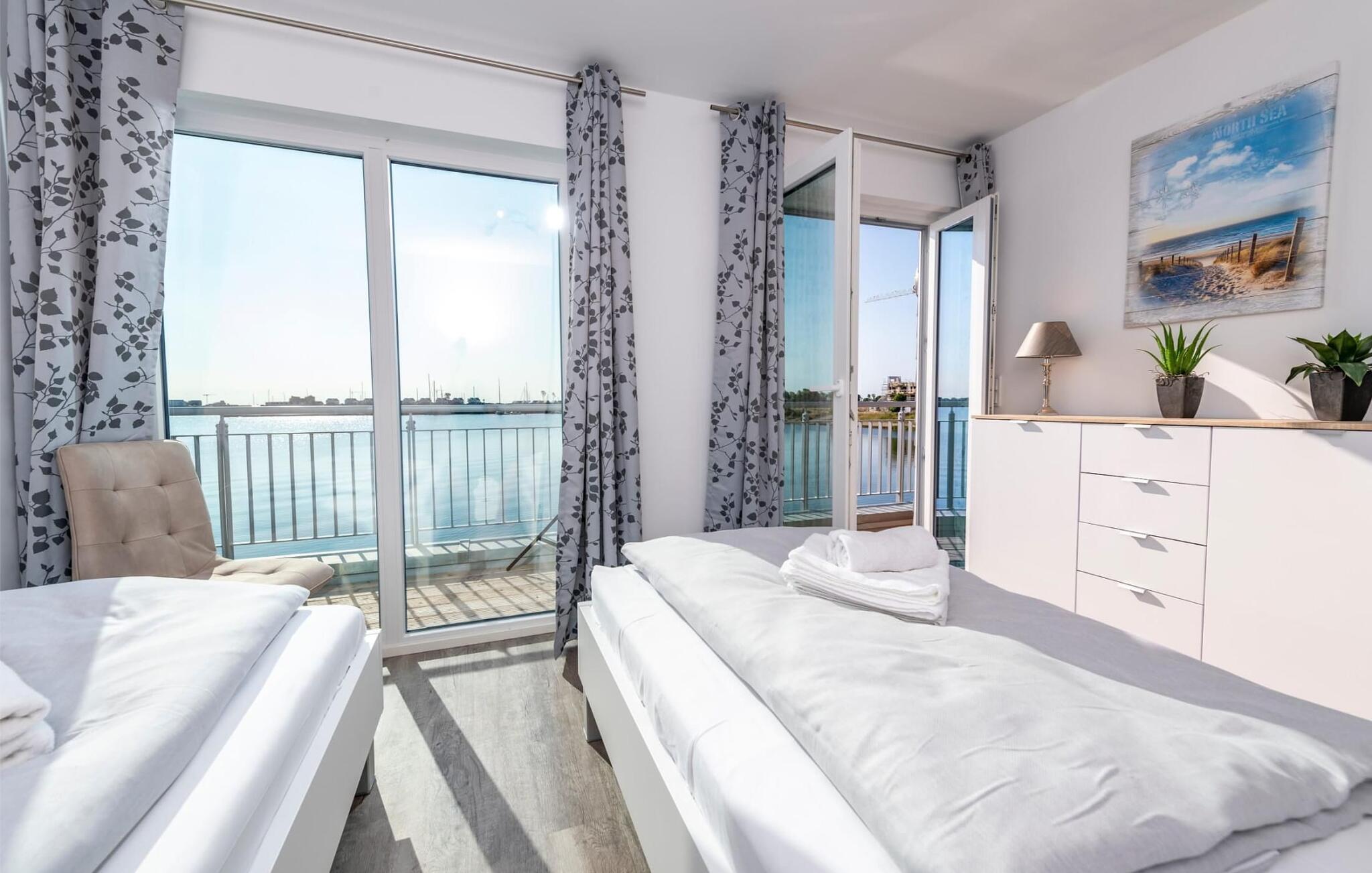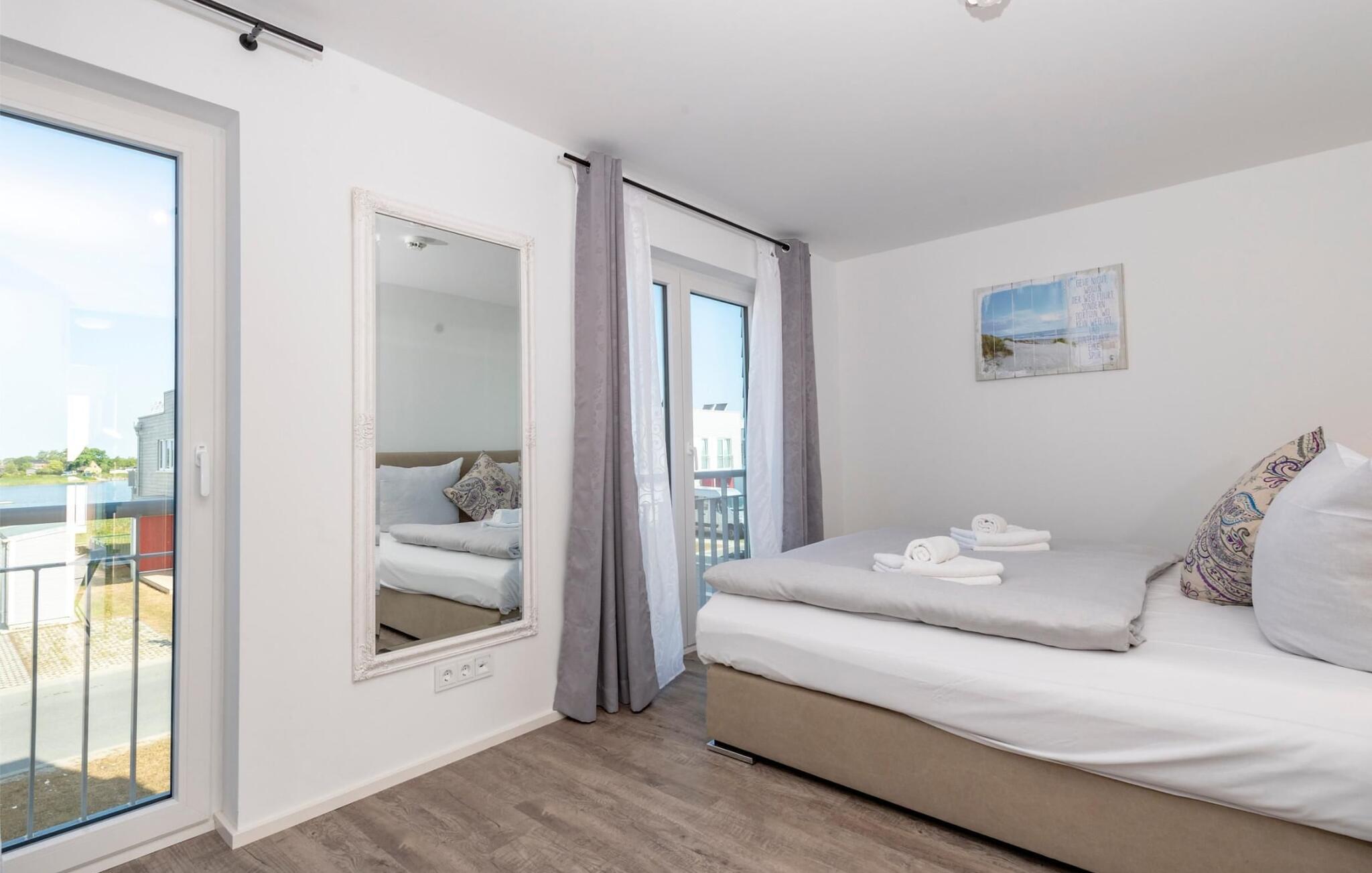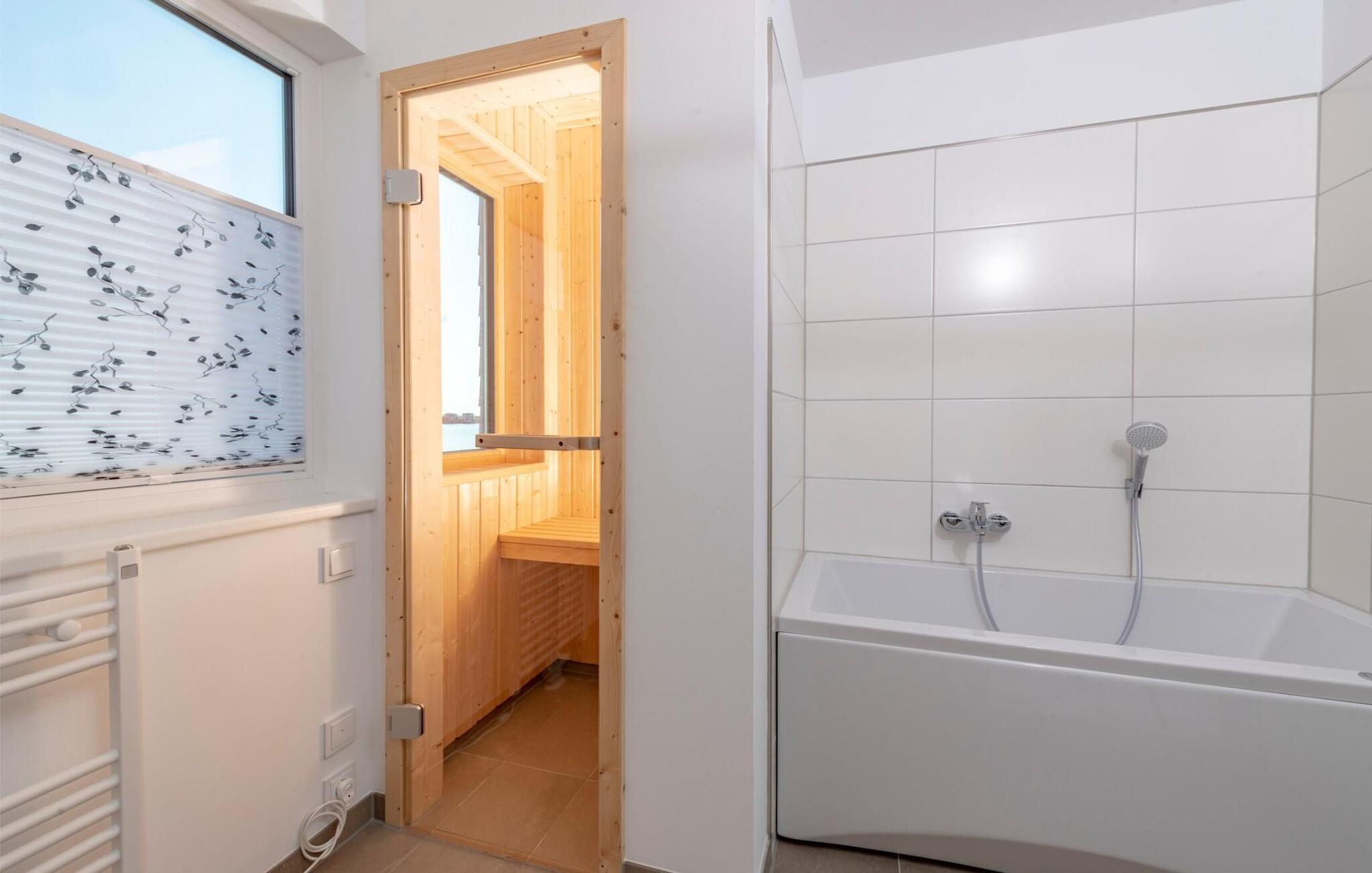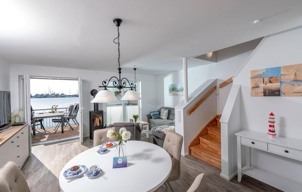 Med sejl- og sportsbådshavnen i Baltic Sea Resort Olpenitz på den ene side og østersøfjorden Slien på den anden side, imponerer dette feriehus med sin all-round beliggenhed ved vandet på et smalt næs omgivet af vand. Den hvide sandstrand ved OstseeResort Olpenitz og sandstranden Weidefelder ligger kun få minutters gang væk. Udsigten falder gennem gulv-til-loft panoramavinduesfronter på den smukke vandkulisse. Feriehuset har terrasse med udsigt over havnen på hver etage. Højdepunktet: den store 360° tagterrasse med sol hele dagen lang. Og hvis I leder efter en wellness-ferie, finder I den her en finsk sauna og et afslappende spabad sikrer afslapning efter en lang gåtur på stranden. Den lyse stue og spisestue i åbent plan ligger i stueetagen af ferieejendommen. Herfra har I adgang til den tilstødende terrasse med en nordisk strandstol. Morgenmad i morgensolen eller grillaften sammen, havnebiograf er garanteret. Køkkenet lader intet tilbage at ønske og er fuldt udstyret til at give fuld feriekomfort. Hele huset er udstyret med gulvvarme. Finsk sauna, spabad og pejs lover komfort i hver sæson og gør dette feriehus rigtig hyggeligt, selv på dårlige nordiske vejrdage. Smart TV med Telekom Home Entertainment-programmet giver ekstra underholdning. Feriehusets afslapningsområde er på første sal. Gæsterne kan falde i søvn i to soveværelser og vågne op til udsigten over vandet. Med en morgenkaffe kan I se sejlskibe sejle på den tilstødende terrasse i soveværelset med udsigt over havnen. Også på dette niveau er det fuldt udstyret badeværelse med udsigt over vandet. Et gæstetoilet i stueetagen giver ekstra komfort. Der er parkeringsplads og cykelskur lige foran huset. Vores yndlingssted: terrassehop, en morgenkaffe på soveværelsesterrassen, solbadning på tagterrassen og efter en lang gåtur på stranden grille sammen på vandterrassen i stueetagen - det er ferie. Feriehuset Leuchtturm er den ene halvdel af et hus. Bemærk venligst: OstseeResort Olpenitz er meget populært, og der bygges fortsat i parken. Ikke desto mindre kan I se frem til en 5-stjernet standard og et førsteklasses ophold. Byggeaktiviteterne kommer ikke til at forstyrre jer på ferien, og derfor gives der ikke yderligere afslag i prisen.