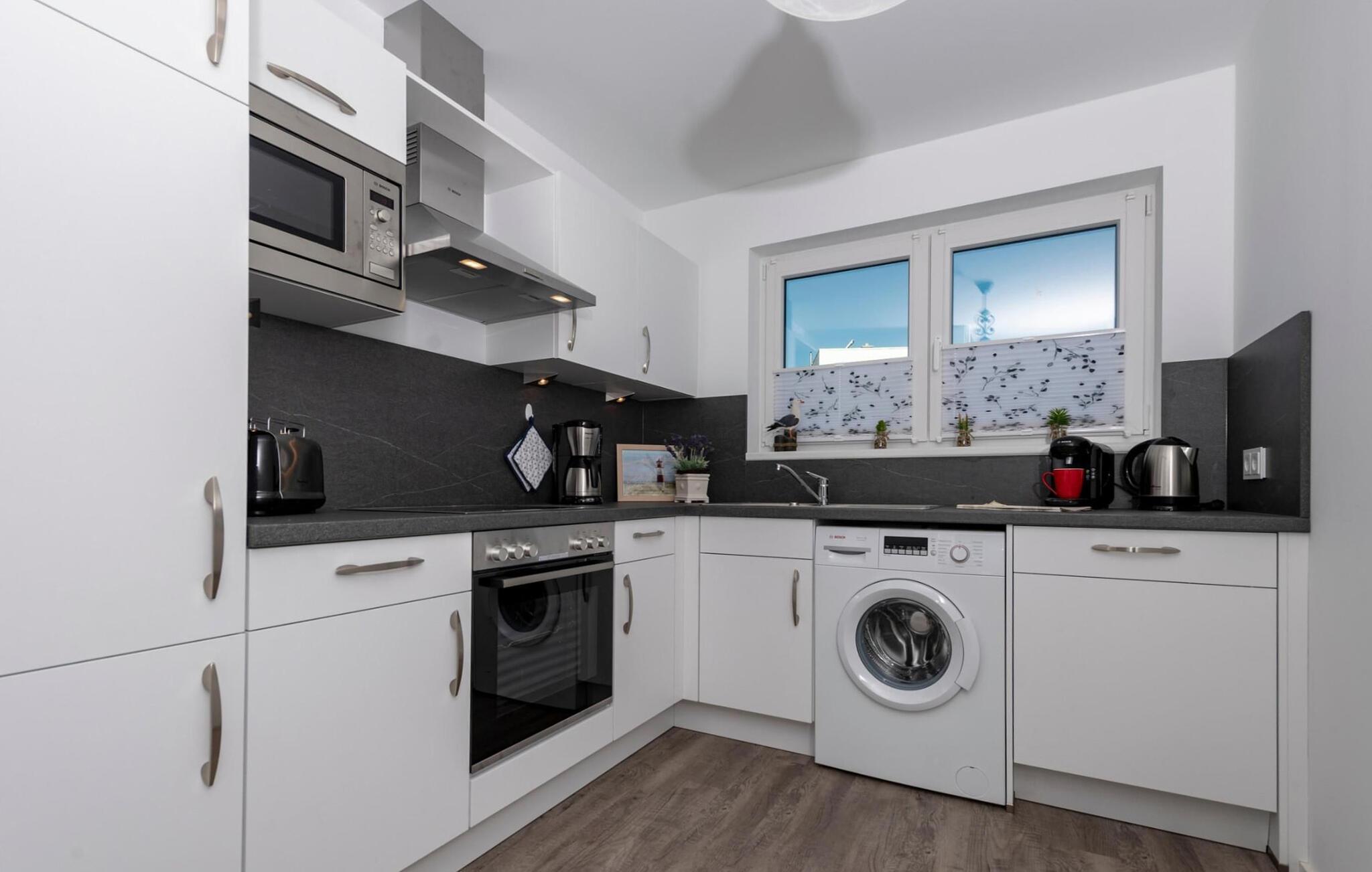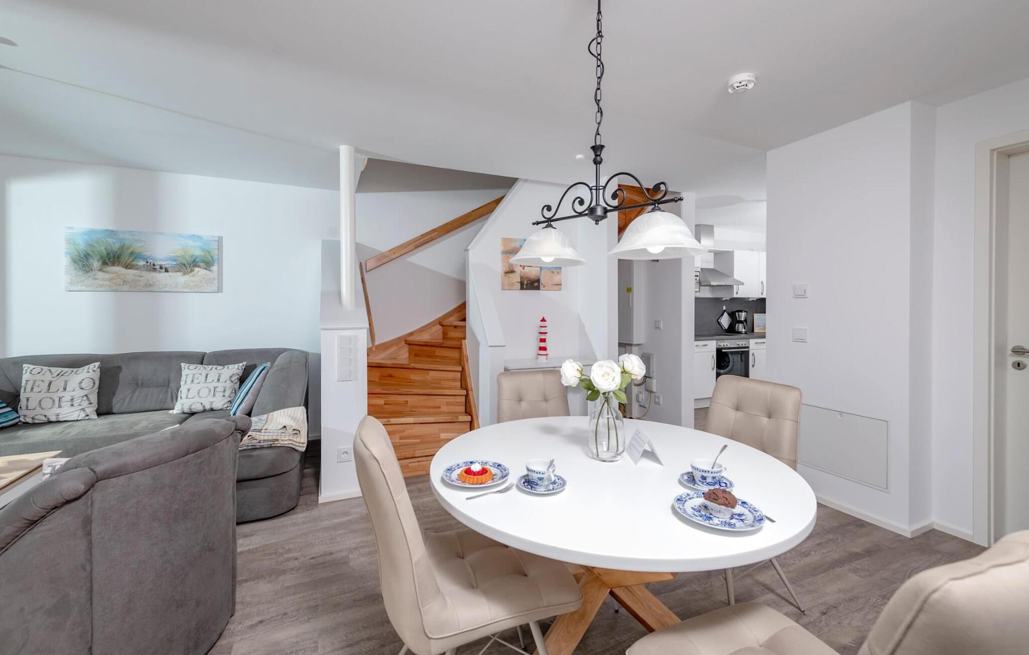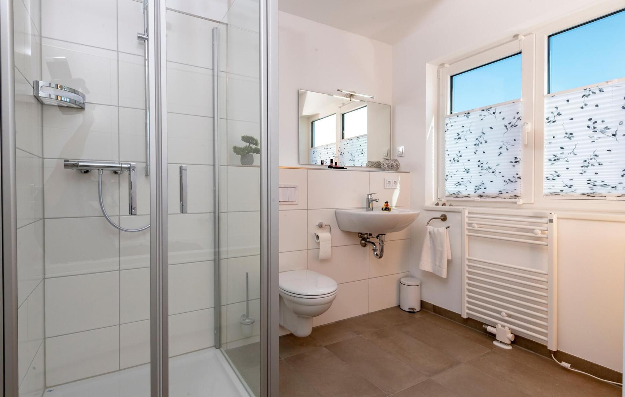 Med sejl- og sportsbådshavnen i Baltic Sea Resort Olpenitz på den ene side og østersøfjorden Slien på den anden side, imponerer dette feriehus med sin all-round beliggenhed ved vandet på et smalt næs omgivet af vand. Den hvide sandstrand ved OstseeResort Olpenitz og sandstranden Weidefelder ligger kun få minutters gang væk. Udsigten falder gennem gulv-til-loft panoramavinduesfronter på den smukke vandkulisse. Feriehuset har terrasse med udsigt over havnen på hver etage. Højdepunktet: den store 360° tagterrasse med sol hele dagen lang. Og hvis I leder efter en wellness-ferie, finder I den her en finsk sauna og et afslappende spabad sikrer afslapning efter en lang gåtur på stranden. Den lyse stue og spisestue i åbent plan ligger i stueetagen af ferieejendommen. Herfra har I adgang til den tilstødende terrasse med en nordisk strandstol. Morgenmad i morgensolen eller grillaften sammen, havnebiograf er garanteret. Køkkenet lader intet tilbage at ønske og er fuldt udstyret til at give fuld feriekomfort. Hele huset er udstyret med gulvvarme. Finsk sauna, spabad og pejs lover komfort i hver sæson og gør dette feriehus rigtig hyggeligt, selv på dårlige nordiske vejrdage. Smart TV med Telekom Home Entertainment-programmet giver ekstra underholdning. Feriehusets afslapningsområde er på første sal. Gæsterne kan falde i søvn i to soveværelser og vågne op til udsigten over vandet. Med en morgenkaffe kan I se sejlskibe sejle på den tilstødende terrasse i soveværelset med udsigt over havnen. Også på dette niveau er det fuldt udstyret badeværelse med udsigt over vandet. Et gæstetoilet i stueetagen giver ekstra komfort. Der er parkeringsplads og cykelskur lige foran huset. Vores yndlingssted: terrassehop, en morgenkaffe på soveværelsesterrassen, solbadning på tagterrassen og efter en lang gåtur på stranden grille sammen på vandterrassen i stueetagen - det er ferie. Feriehuset Leuchtturm er den ene halvdel af et hus. Bemærk venligst: OstseeResort Olpenitz er meget populært, og der bygges fortsat i parken. Ikke desto mindre kan I se frem til en 5-stjernet standard og et førsteklasses ophold. Byggeaktiviteterne kommer ikke til at forstyrre jer på ferien, og derfor gives der ikke yderligere afslag i prisen.