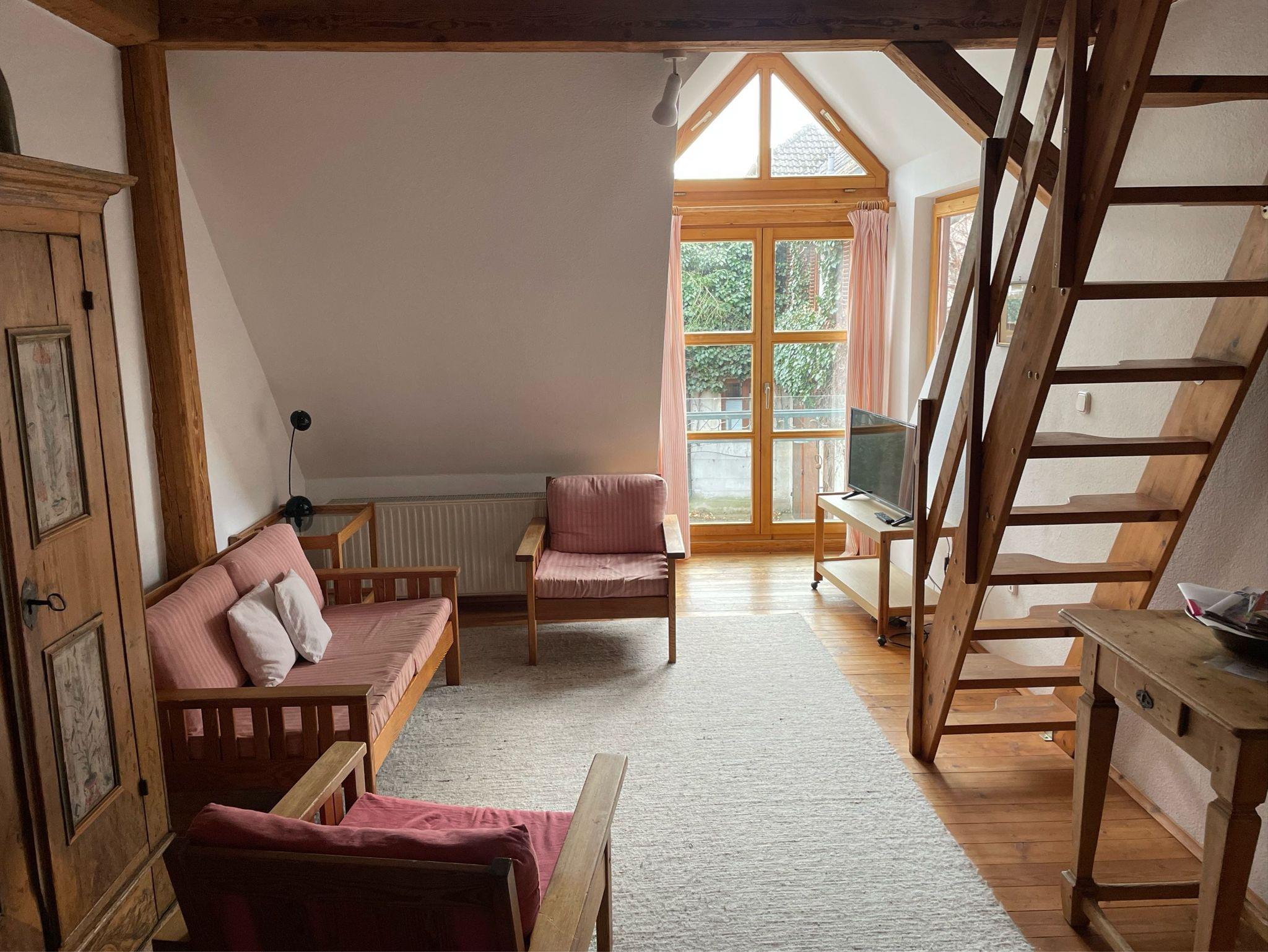 Eine Art Galerie-Wohnung, d. h. zum Schlafen gehts über eine Treppe nach oben. 2 separate Schlafzimmer, großzügiger Wohnraum, Einbau-Küche, Bad/Dusche, separates WC.