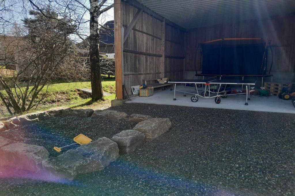 Die Ferienwohnung Weide im 1.OG hat 2 Schlafzimmer, Bad mit Badewanne und Dusche, extra WC mit Pissoir und einen großen Wohn- Essbereich mit Küche. 4 Betten und eine Couch (121x195m) finden Sie in den Schlafzimmern. Ein Babybett findet selbstverständlich auch im Schlafzimmer Platz. Der möblierte Balkon mit Tisch, 4 Stühlen und einem Sonnenschirm lädt zu gemütlichen Stunden im Freien ein. Trampolin, Tischtennisplatte, Schaukeln und diverse Fahrzeuge für Kinder finden Sie im Außenbereich. Bei schlechtem Wetter steht ein Tischkicker im Keller.