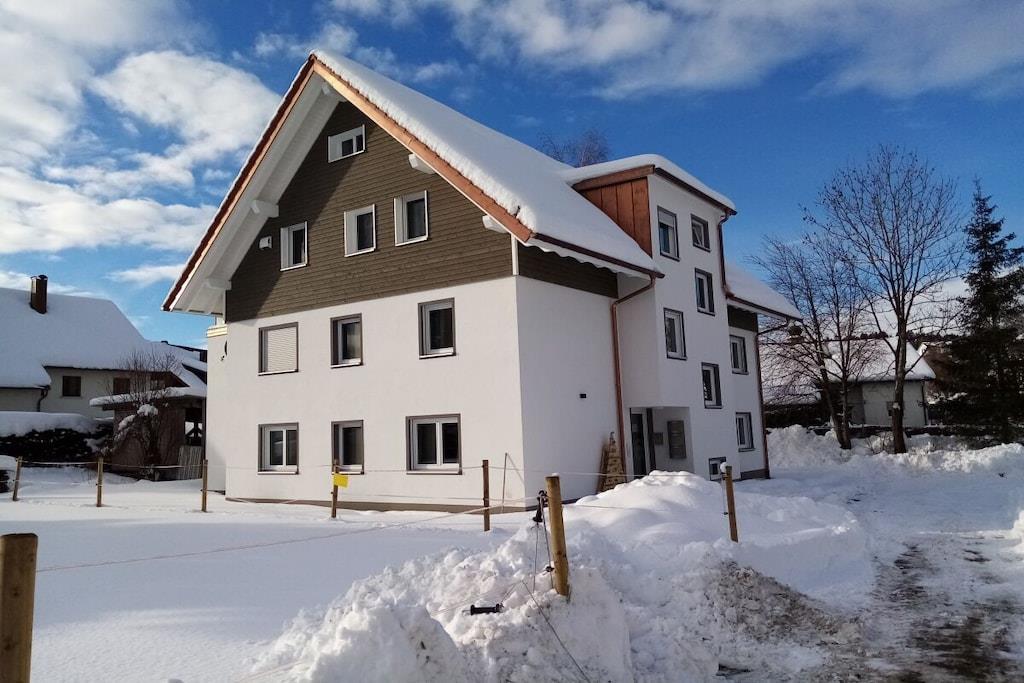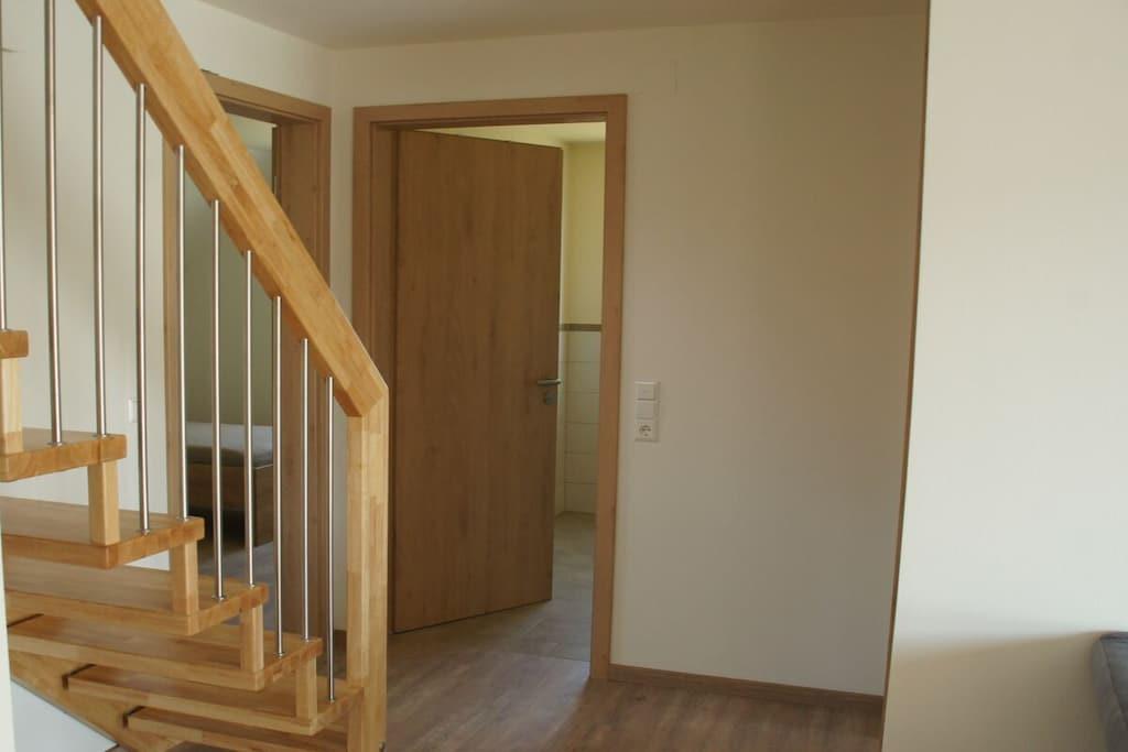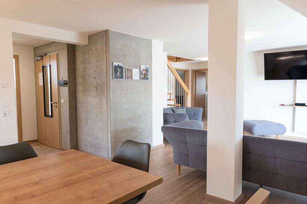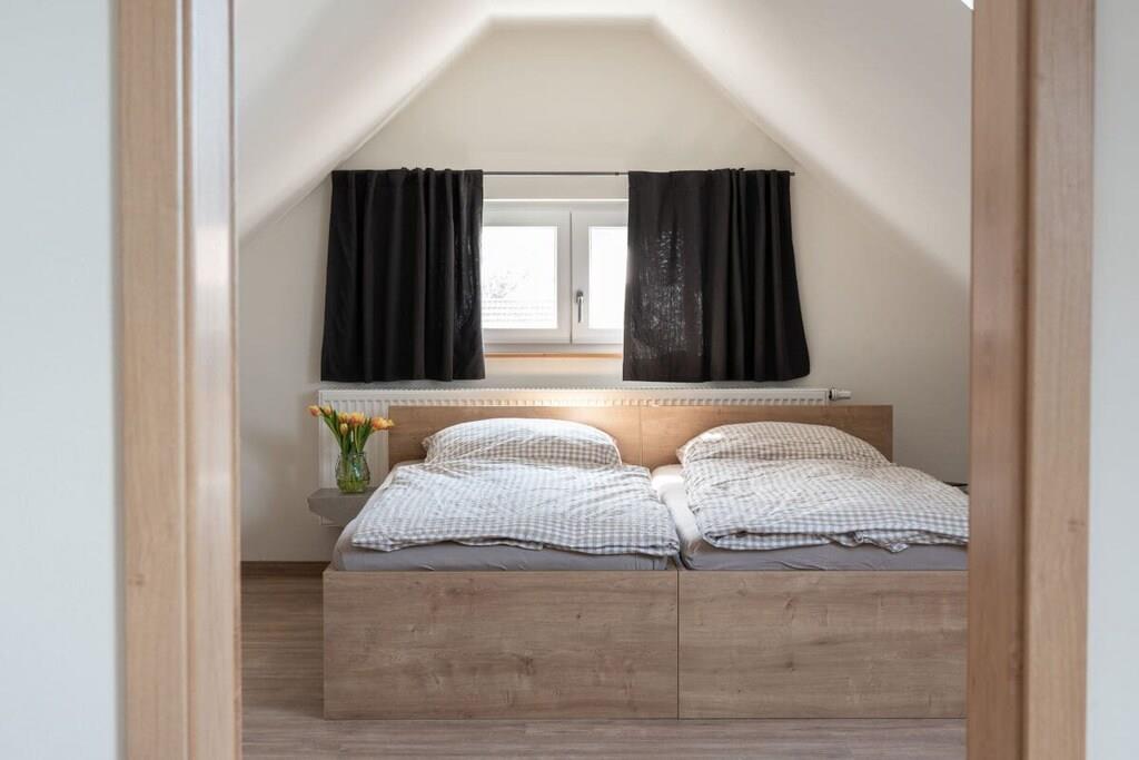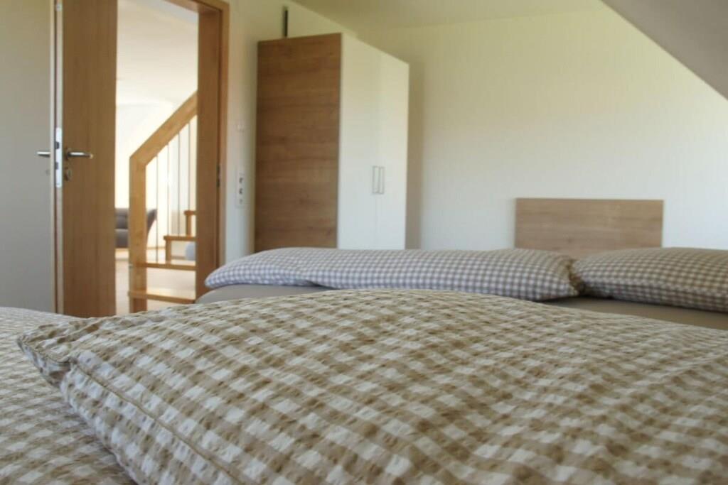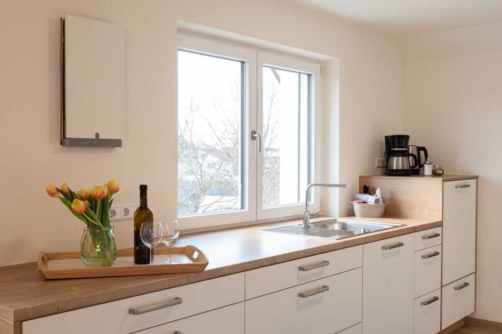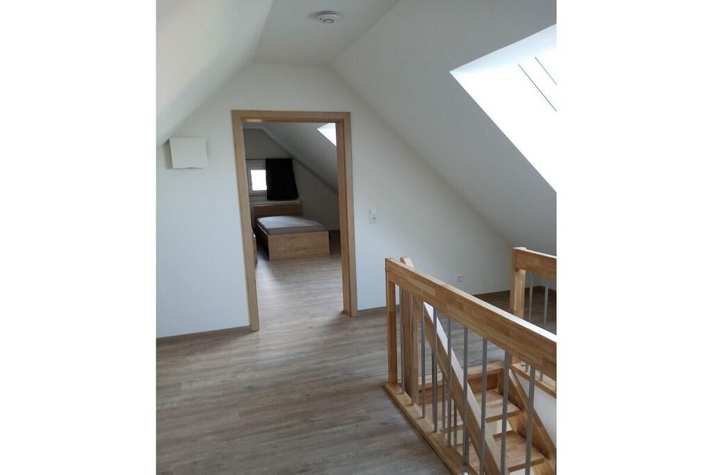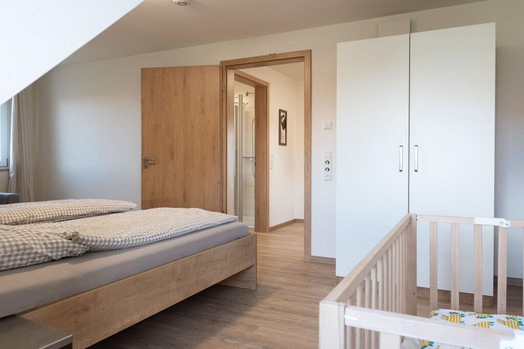 Unser Ferienhaus wurde 2019/2020 komplett neu erbaut und bietet in der Wohnung "Eiche" Platz für 8 Personen plus Babybetten. Die Wohnung ist im 2.OG, hat 4 Schlafzimmer (verteilt auf 2 Etagen), 2 Bäder, einen Wohn- Essbereich mit EBK sowie eine schöne Dachterrasse. Ein großer Parkplatz steht zur Verfügung. Ebenso ein Trampolin, eine Tischtennisplatte, Schaukeln und diverse Fahrzeuge für Kinder. Im Keller steht ein Tischkicker. Trockner und Waschmaschine im Keller gegen Gebühr (3EURO jeweils)
