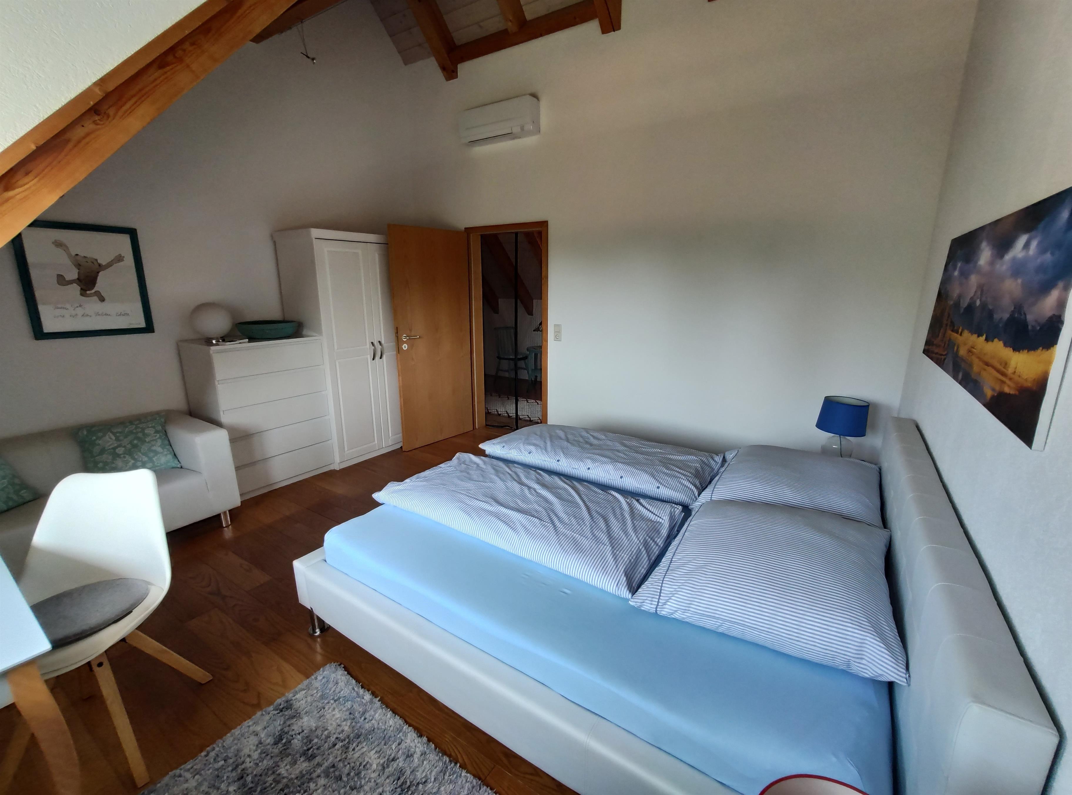 • Zimmer 1 (Blaues Zimmer) Mit einem Doppelbett 180x200cm, großem Kleiderschrank, Schubladenschrank und einem Schreibtisch