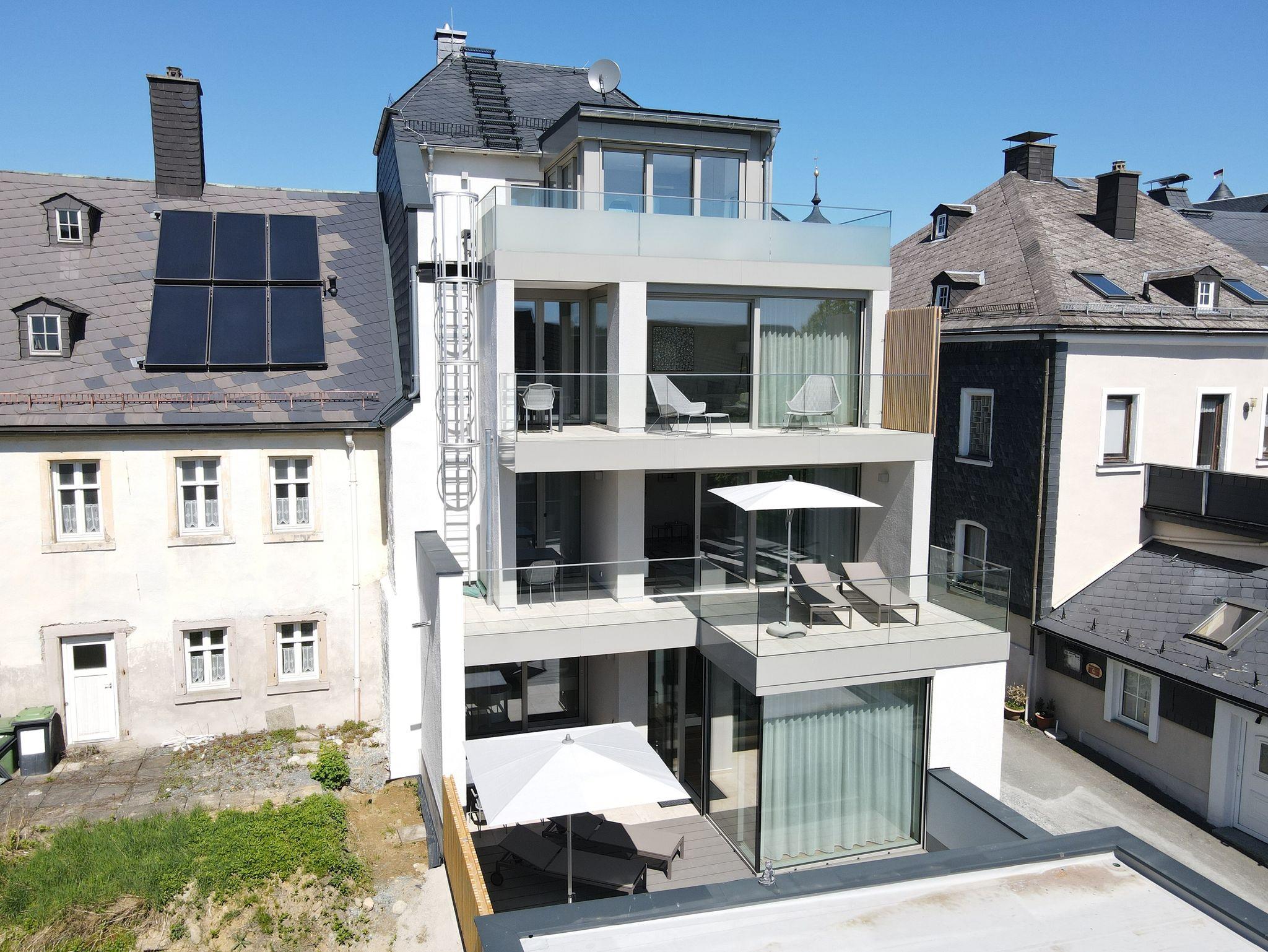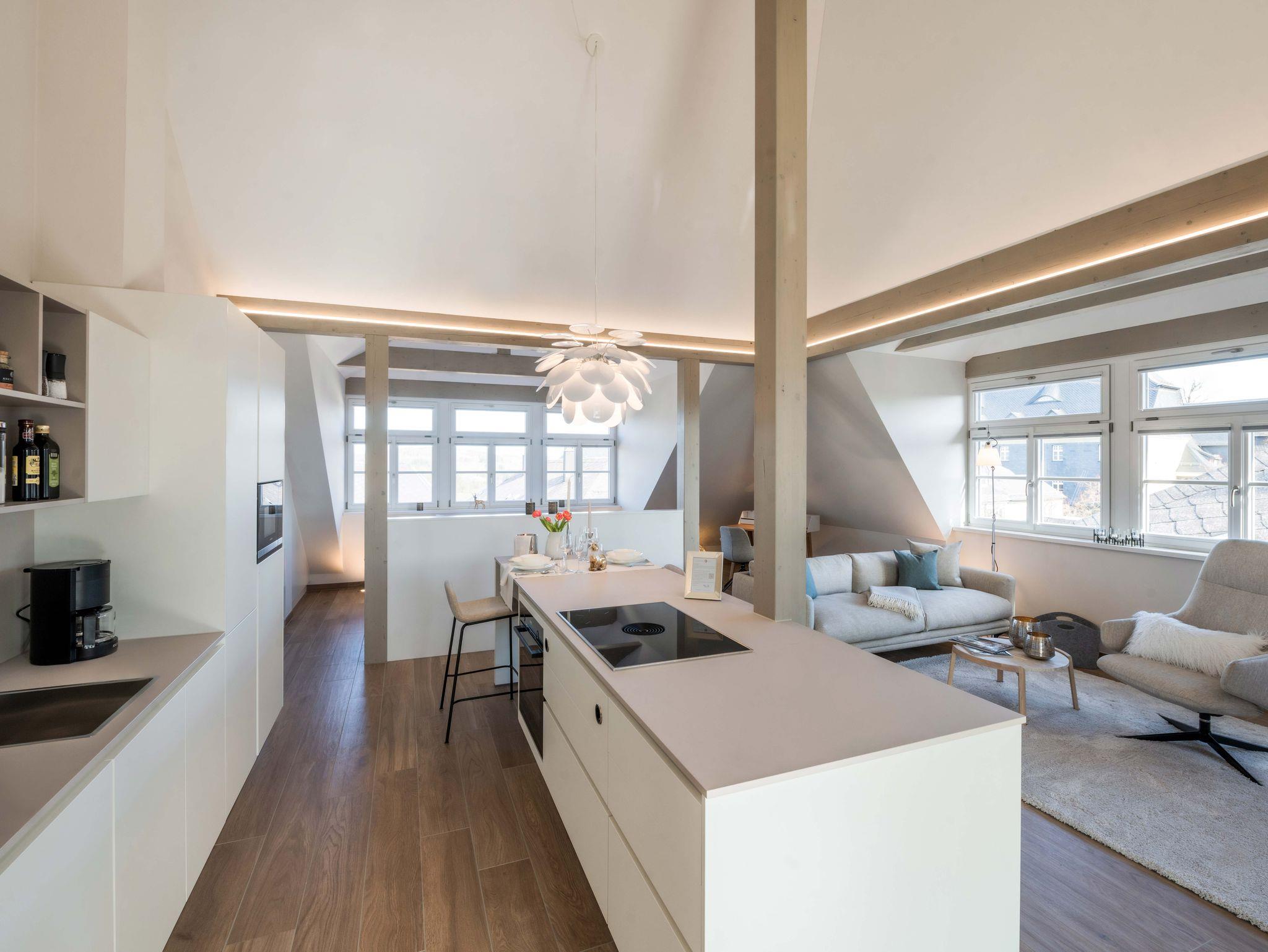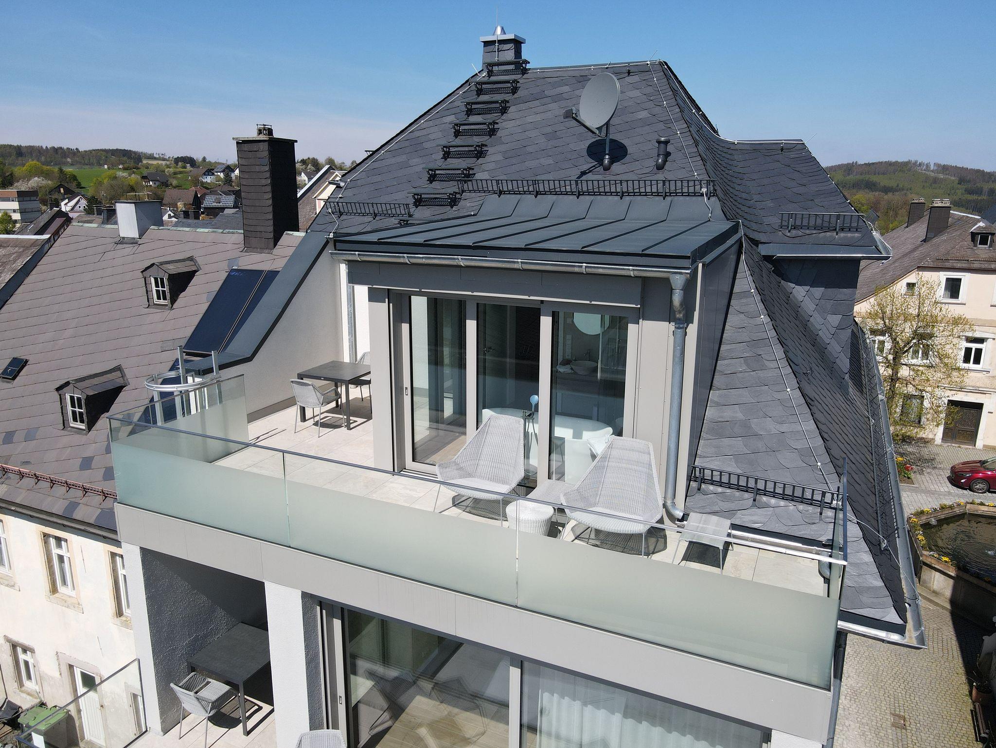 Moderner, offener Wohnungszuschnitt mit bis zu 5 m hoher Decke, zwei großzügig geschnittenen Giebeln, vollausgestatteter Küche mit Kochinsel, en suite-Boxspring-Bett, luxuriösem Design-Bad mit freistehender Badewanne, der wohl höchstgelegenen Sonnenterrasse in Lichtenberg mit unvergleichlichen Ausblicken über die Altstadtmauer auf den Frankenwald oder auf den Marktplatz