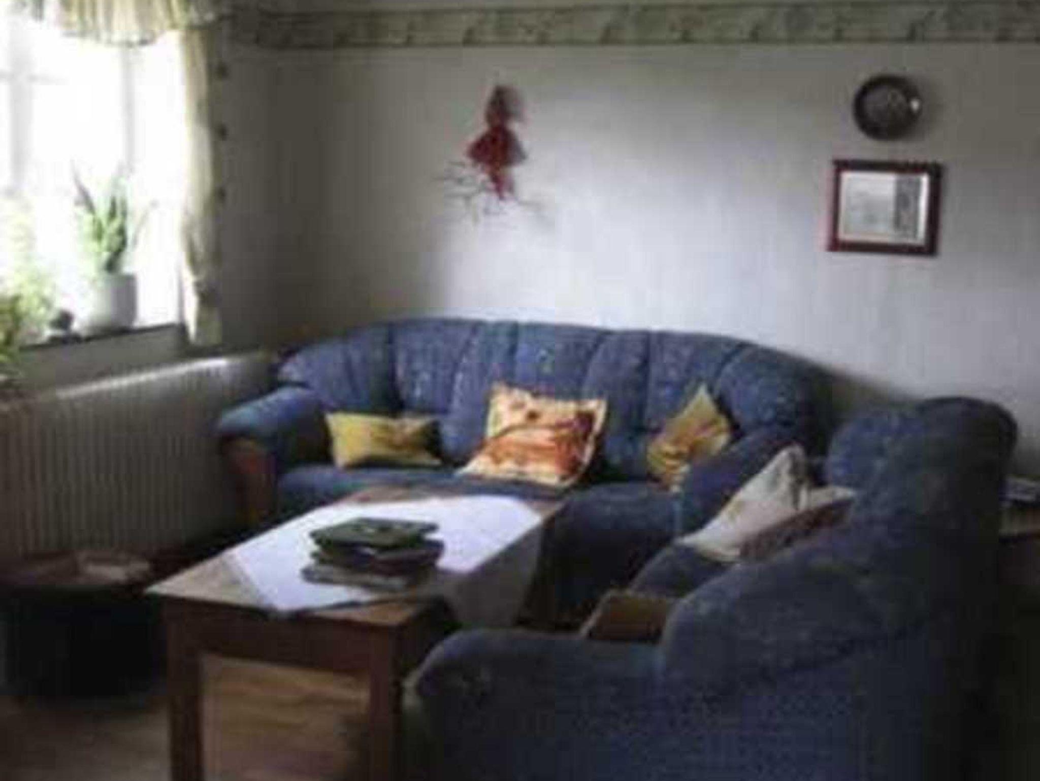 Sie finden einen behaglich eingerichteten Wohnraum mit großem Schlafsofa, Sessel und Fernseher. In der Essecke können Sie sich die in der kleinen Küche zubereiteten Mahlzeiten schmecken lassen.