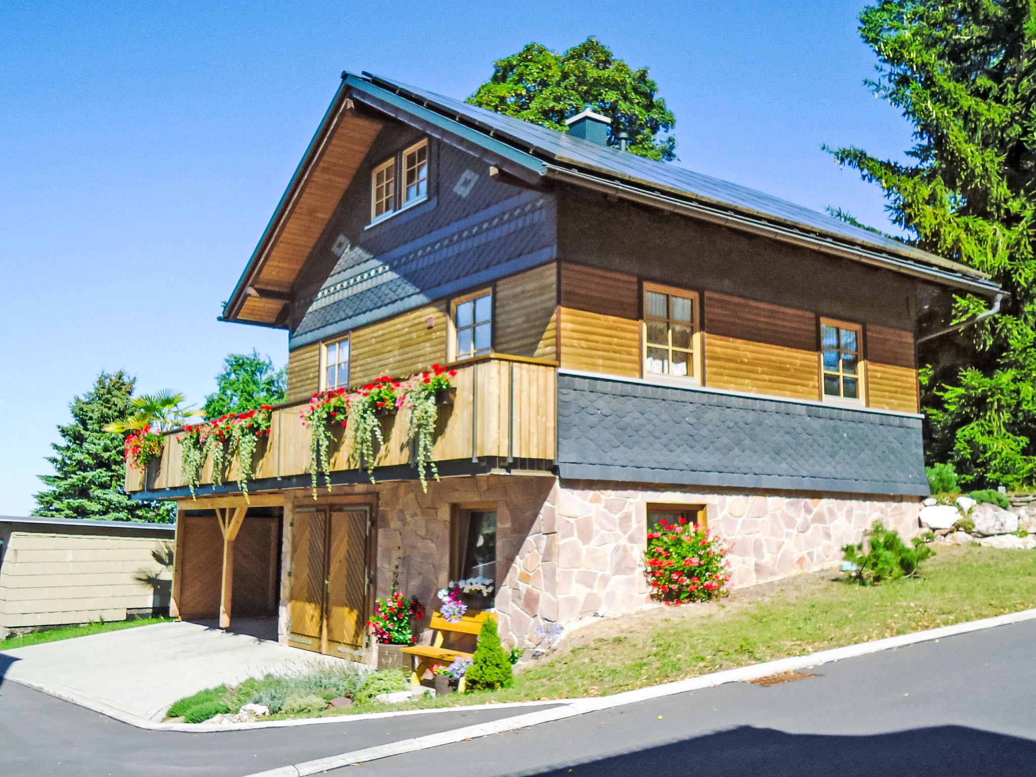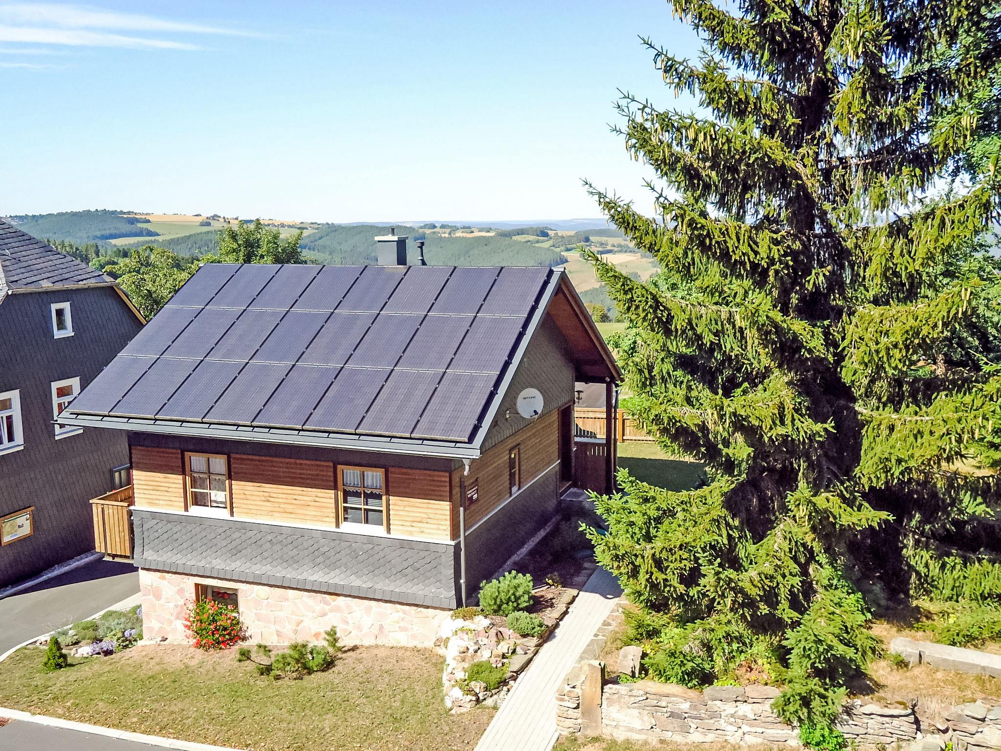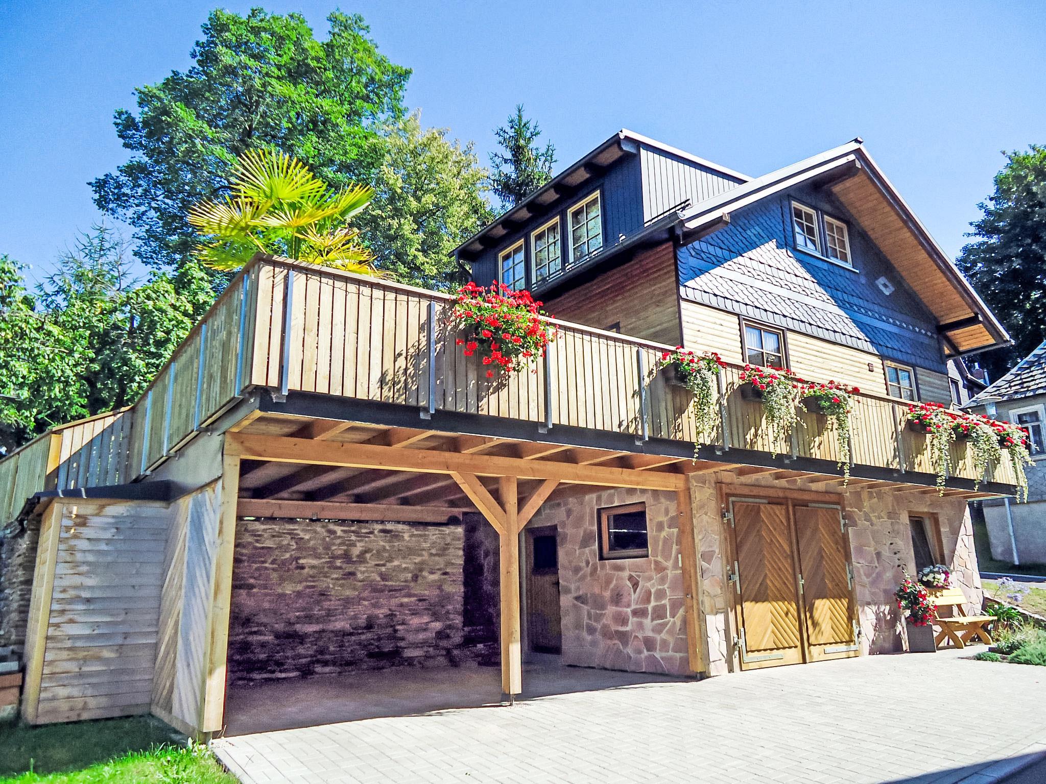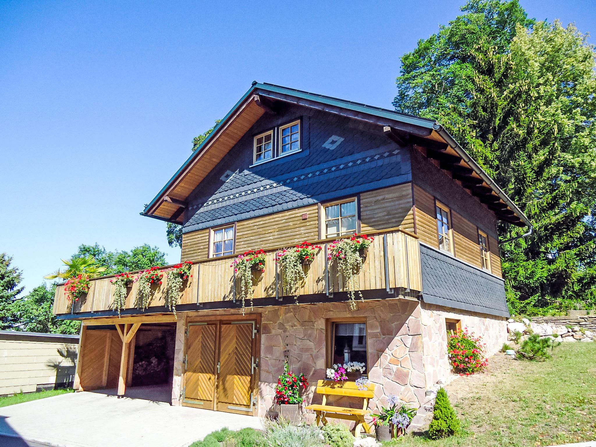Timber house "Weitsicht". In the resort 2 km from the centre of Oberweissbach, in a quiet, sunny position on a slope, in the countryside. Private: small garden 25 m2 with lawn. Available: bicycles (3) (extra). E-charging station. Shop 2 km, grocery 2 km, supermarket 2 km, restaurant 100 m, bus stop 2 km, railway station "Bergbahn" 300 m, outdoor swimming pool 2 km, indoor swimming pool 10 km. Riding stable 3 km, walking paths from the house 100 m, ski lift 3 km, ski school 5 km, cross country ski track 3 km, children's playground 150 m. Nearby attractions: Thüringer Bergbahn 300 m. Well-known ski regions can easily be reached: Skiarena Silbersattel in Steinach 24 km, Oberhof 50 km. Hiking paths: Rennsteig 12 km. Access to the house on the ground floor (access from the car park via 15 steps). On request and after consulting the sauna for 2 person in the owner's house 20m can be used (5 € / person).