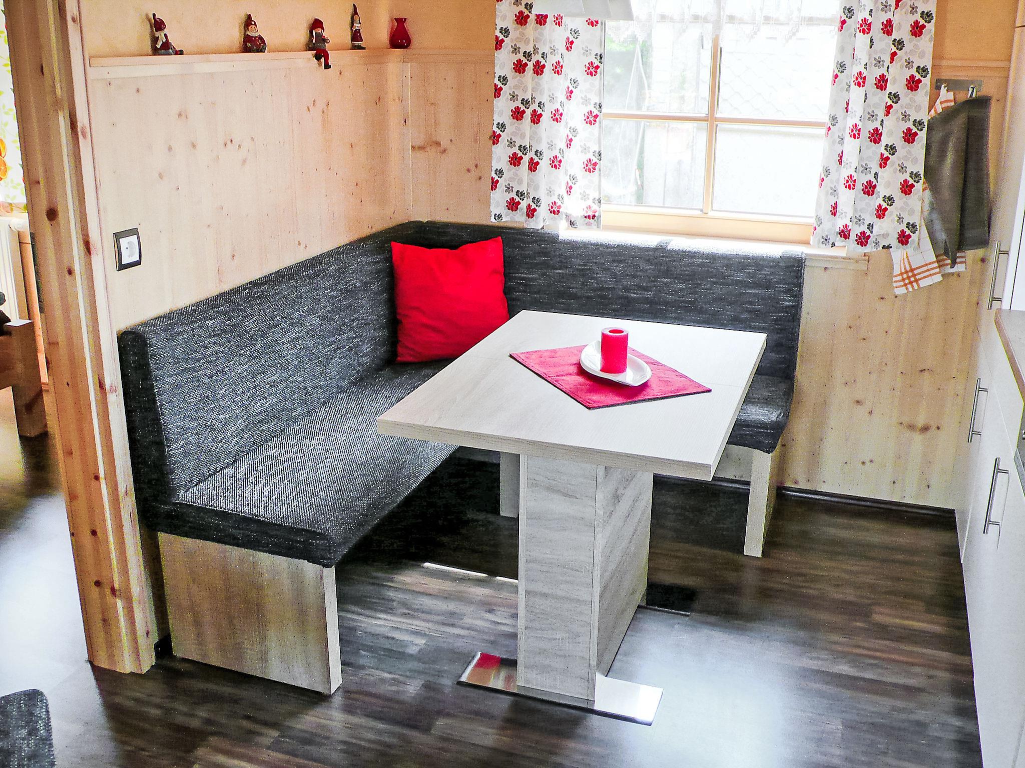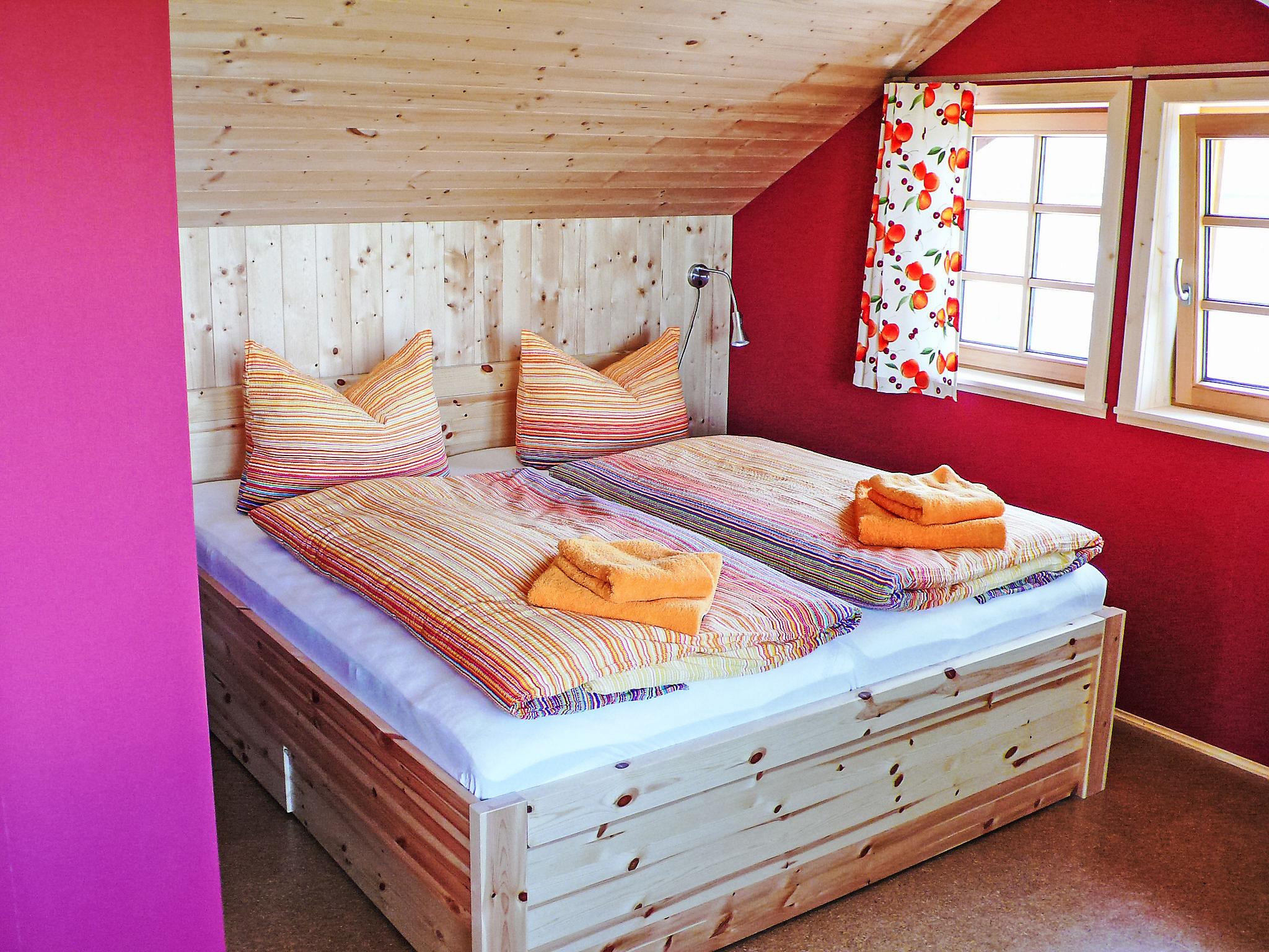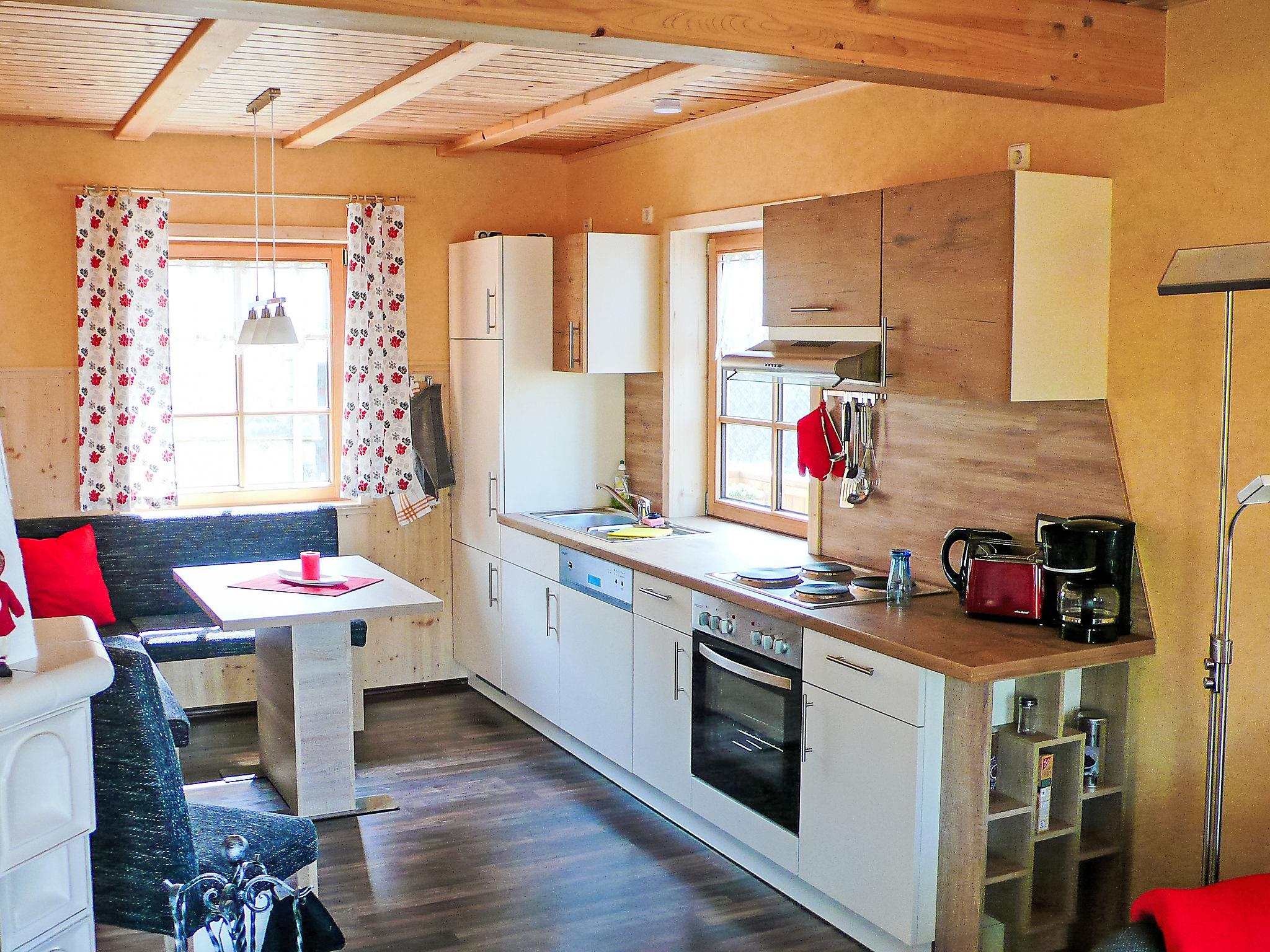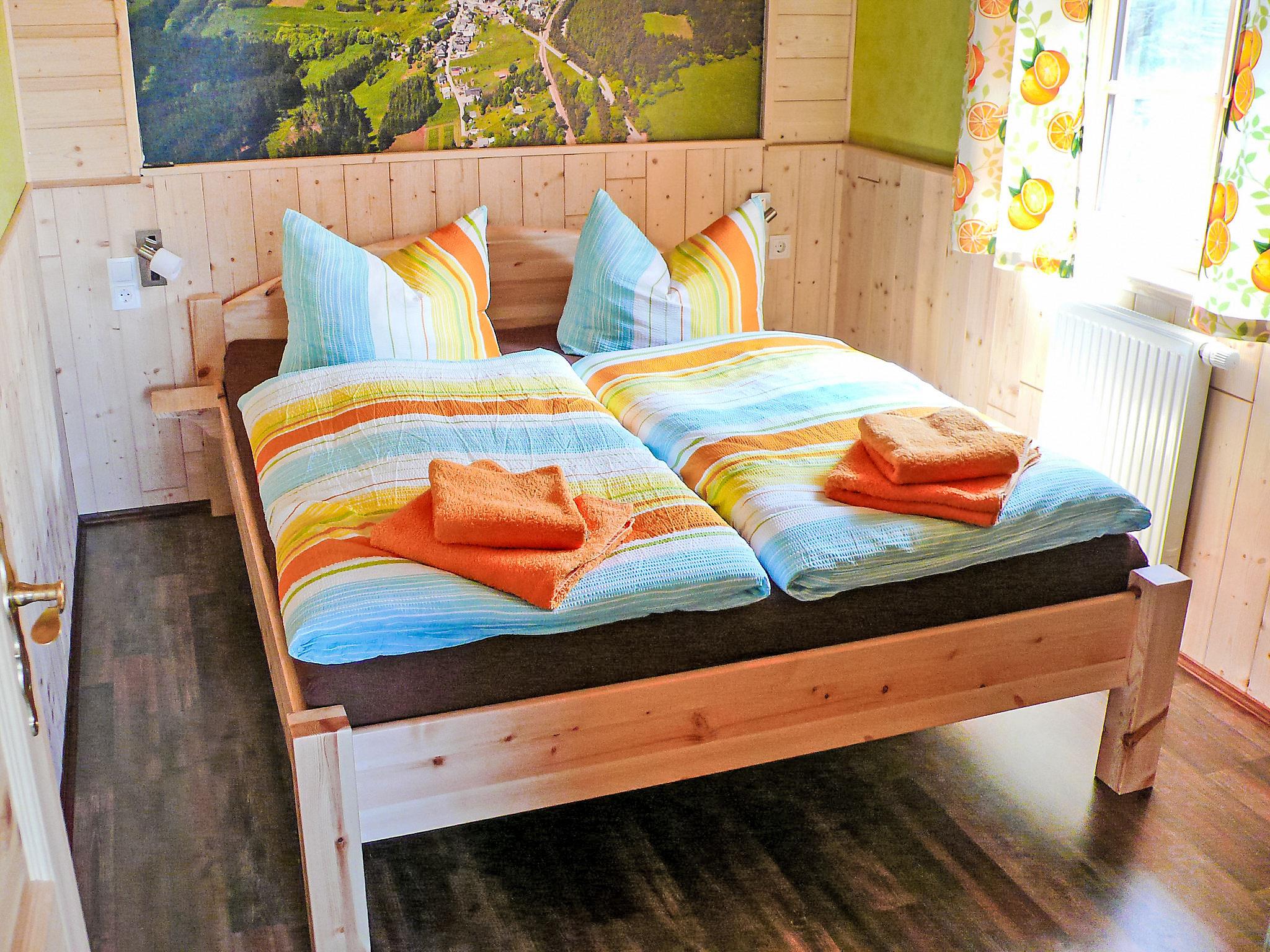 3-room house 72 m2 on 2 levels, on the ground floor. Cosy and wooden furniture furnishings: living/dining room with open-hearth fireplace and satellite TV (flat screen), hi-fi system. Exit to the garden, to the terrace. 1 double bedroom. Kitchenette (4 hot plates, oven, dishwasher, electric coffee machine). Shower/WC. Top floor: (steep stair), 1 double bedroom with sloping ceilings. Shower/WC. Solar energy heating. Solar power. Large terrace 36 m2. Terrace furniture, barbecue. Facilities: washing machine, children's high chair, logs (free). Internet (WiFi, free). Parking (roofed, 2 cars) at the house. Please note: non-smoking house. Smoke alarm, fire extinguisher. The bathroom is at the ground floor with underfloor heating. The bedroom is in the attic with a place to sit and a beautiful view of the surrounding mountains and Schwarzatal. Bookings accepted for holiday purposes only.