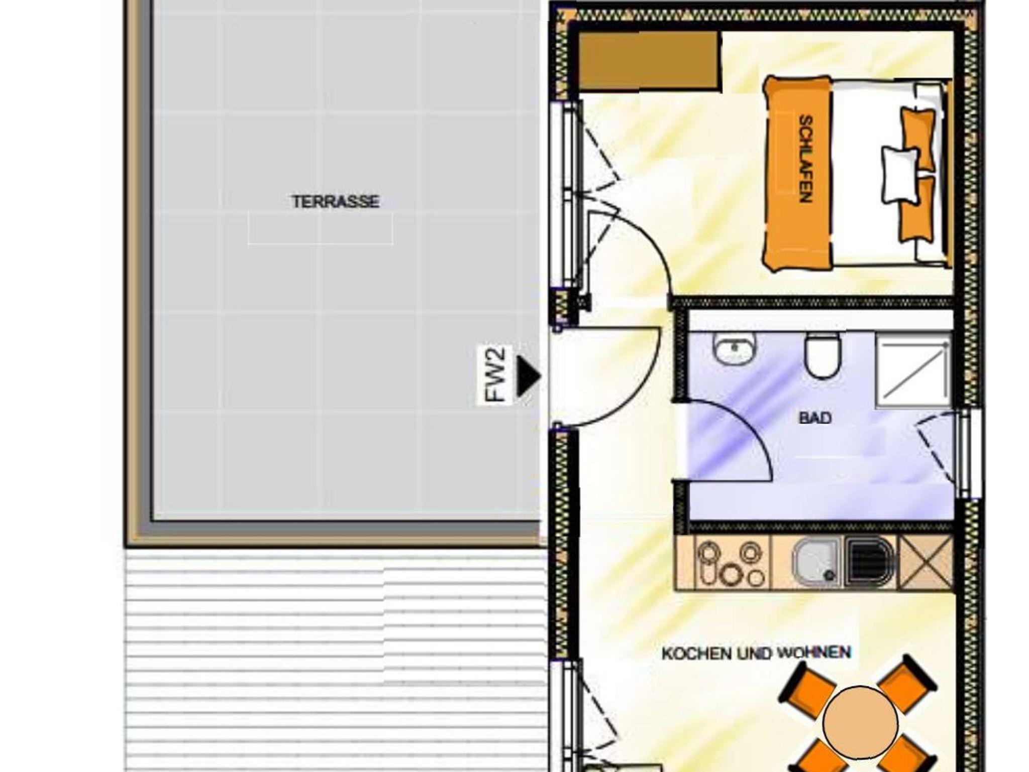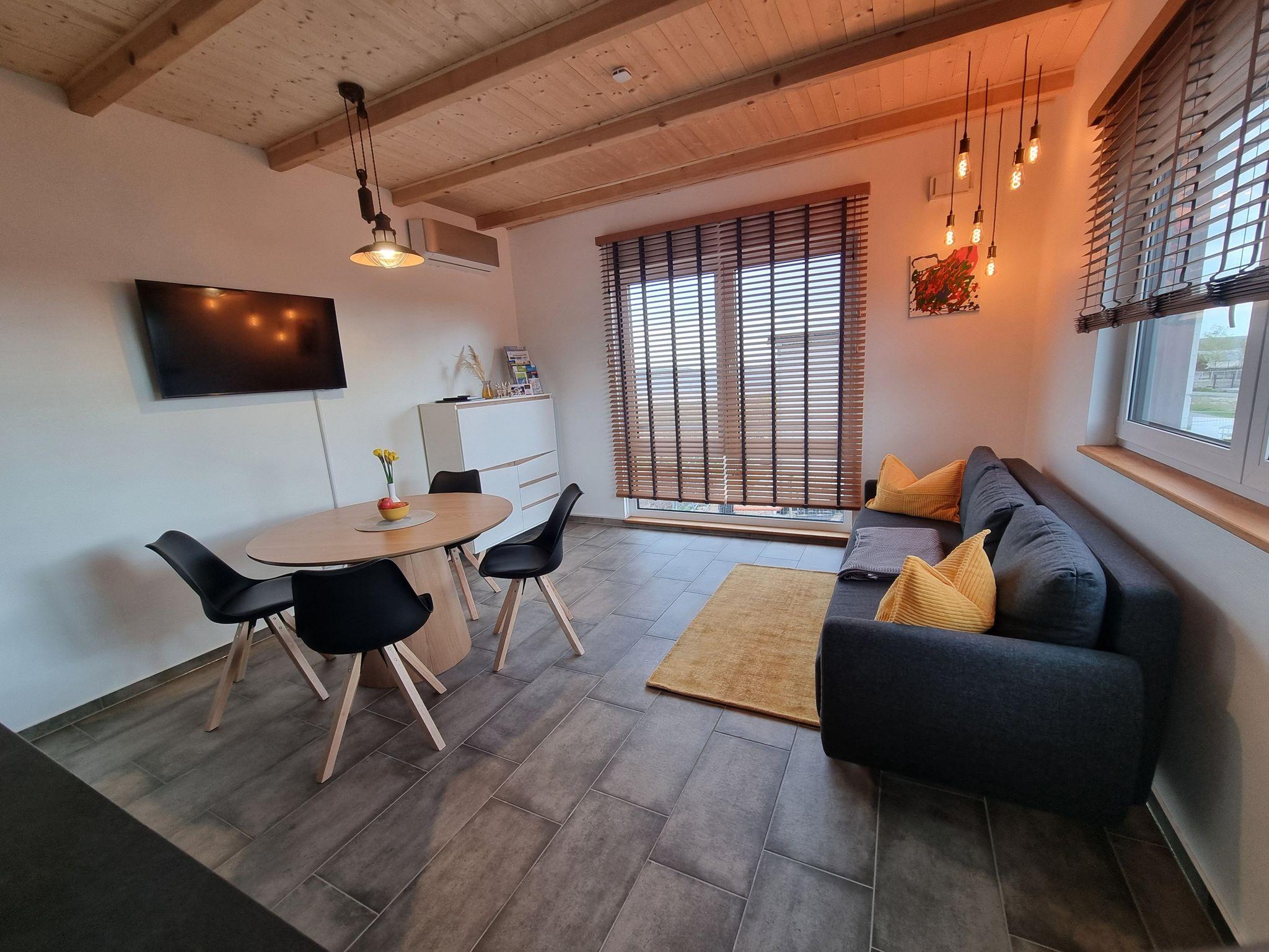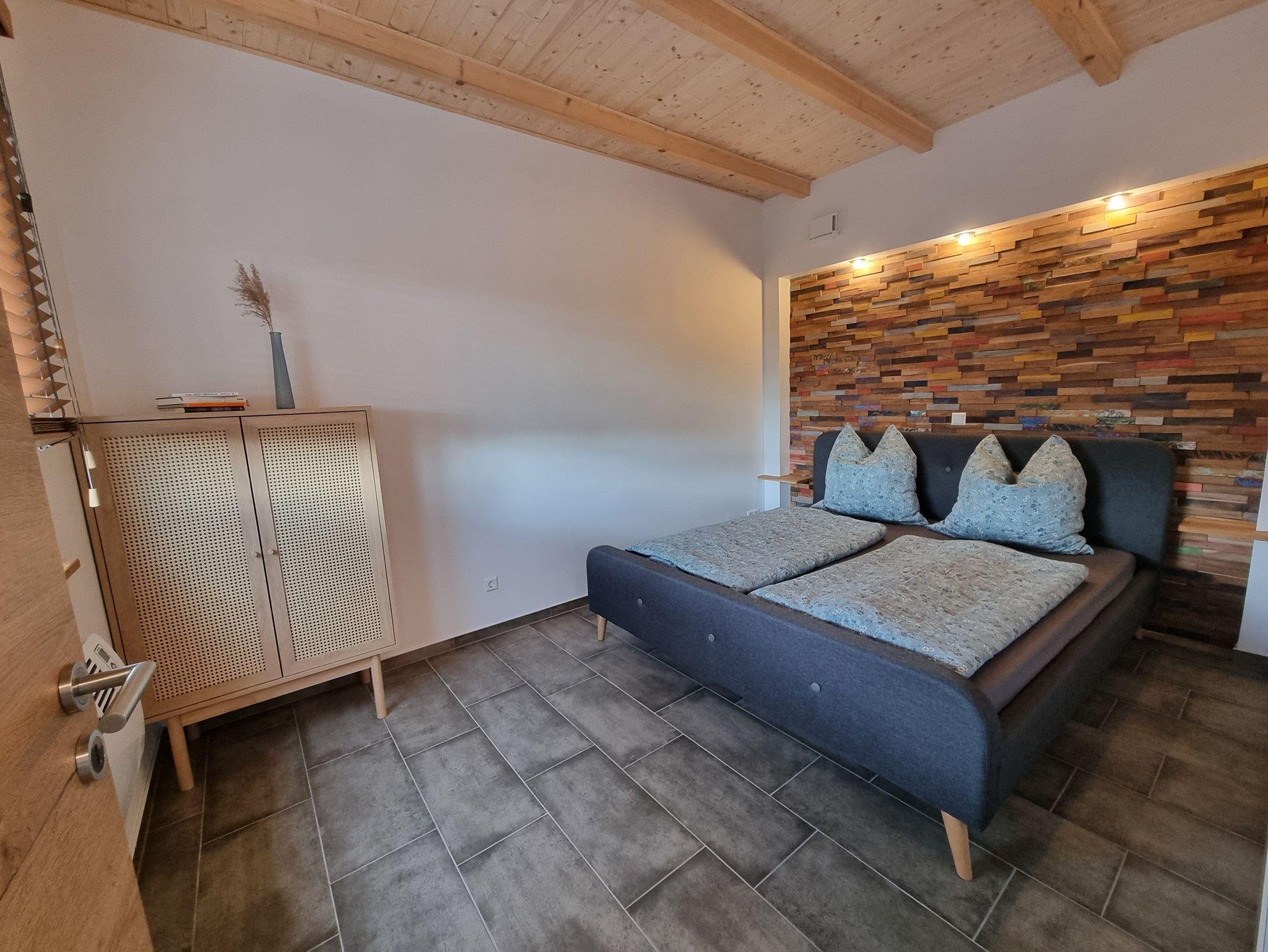 Die 40 m² große Ferienwohnung Haspel befindet sich im Obergeschoss. Sie verfügt über ein Schlafzimmer, eine Wohnküche mit zusätzlicher Schlafcouch (1,30 x 1,90 m) und ein Bad. Highlight ist die große Dachterrasse mit Blick auf die F60 und den Bergheider See.