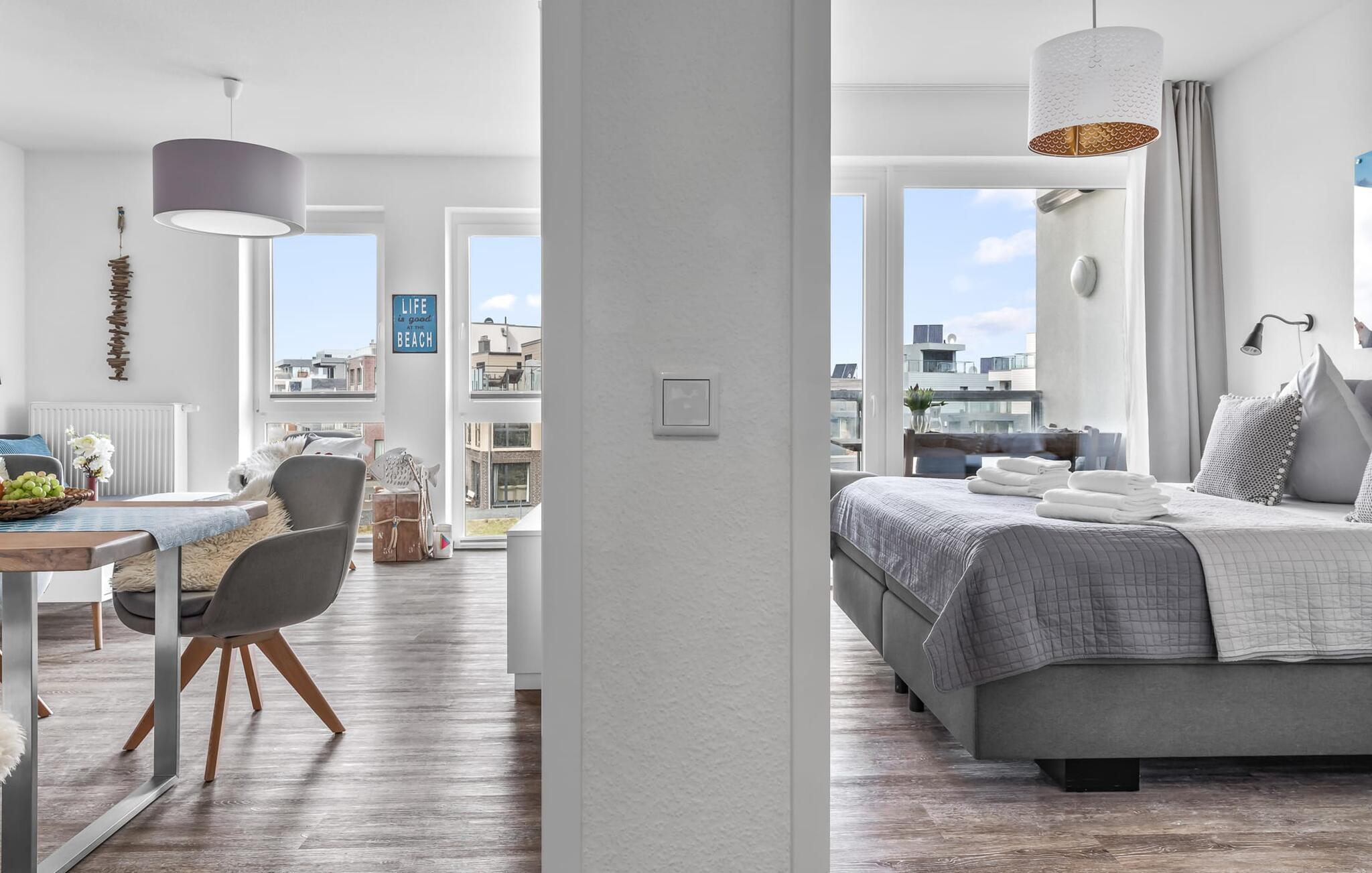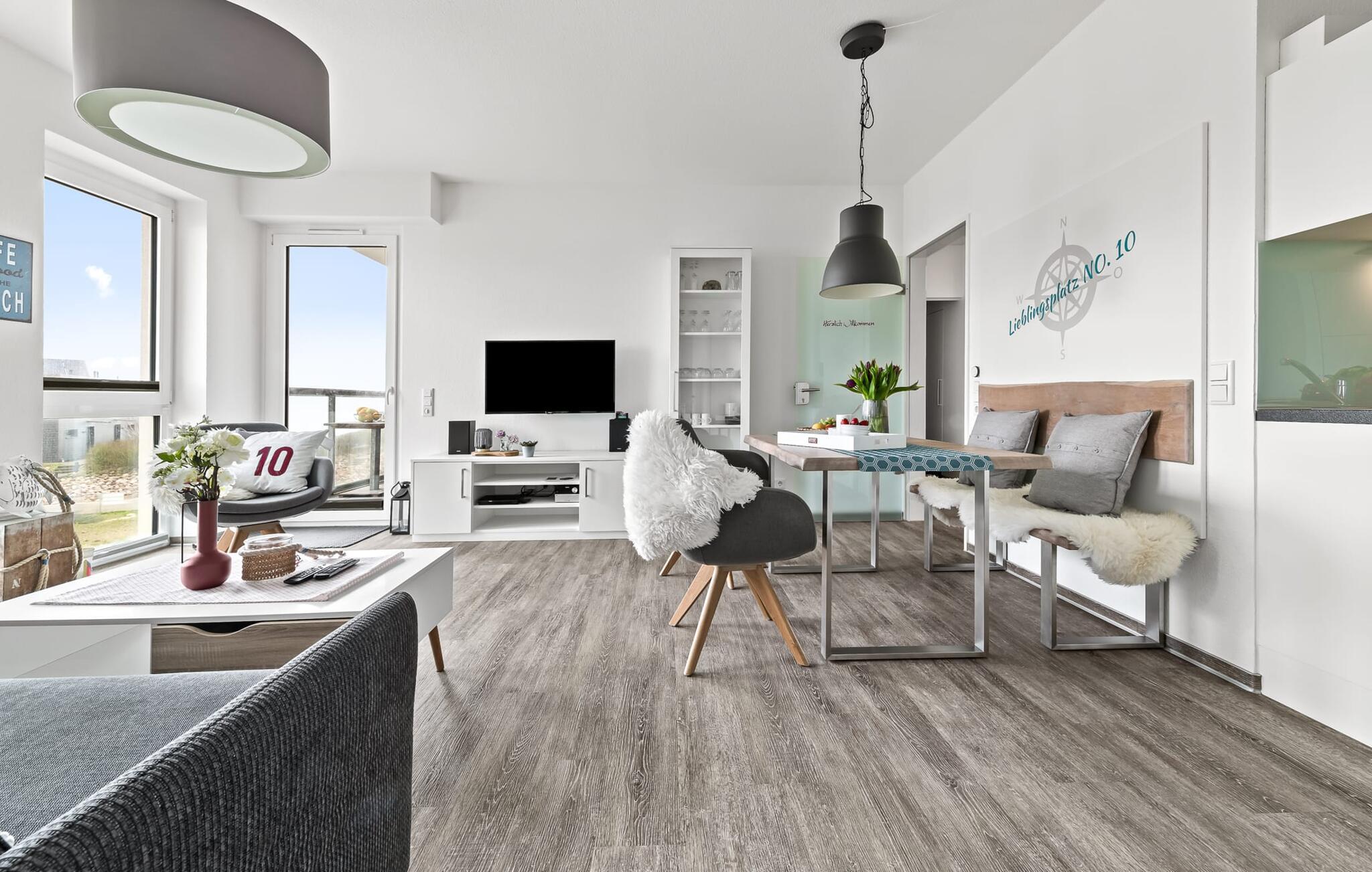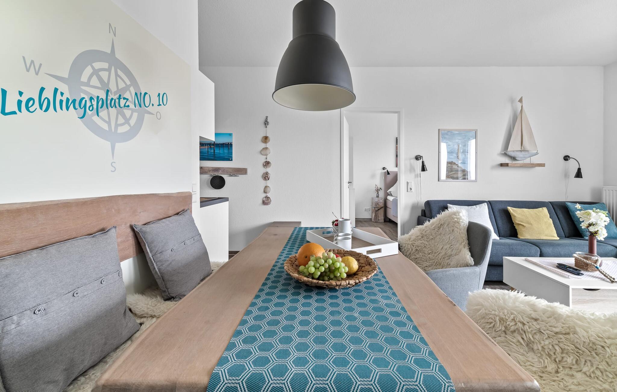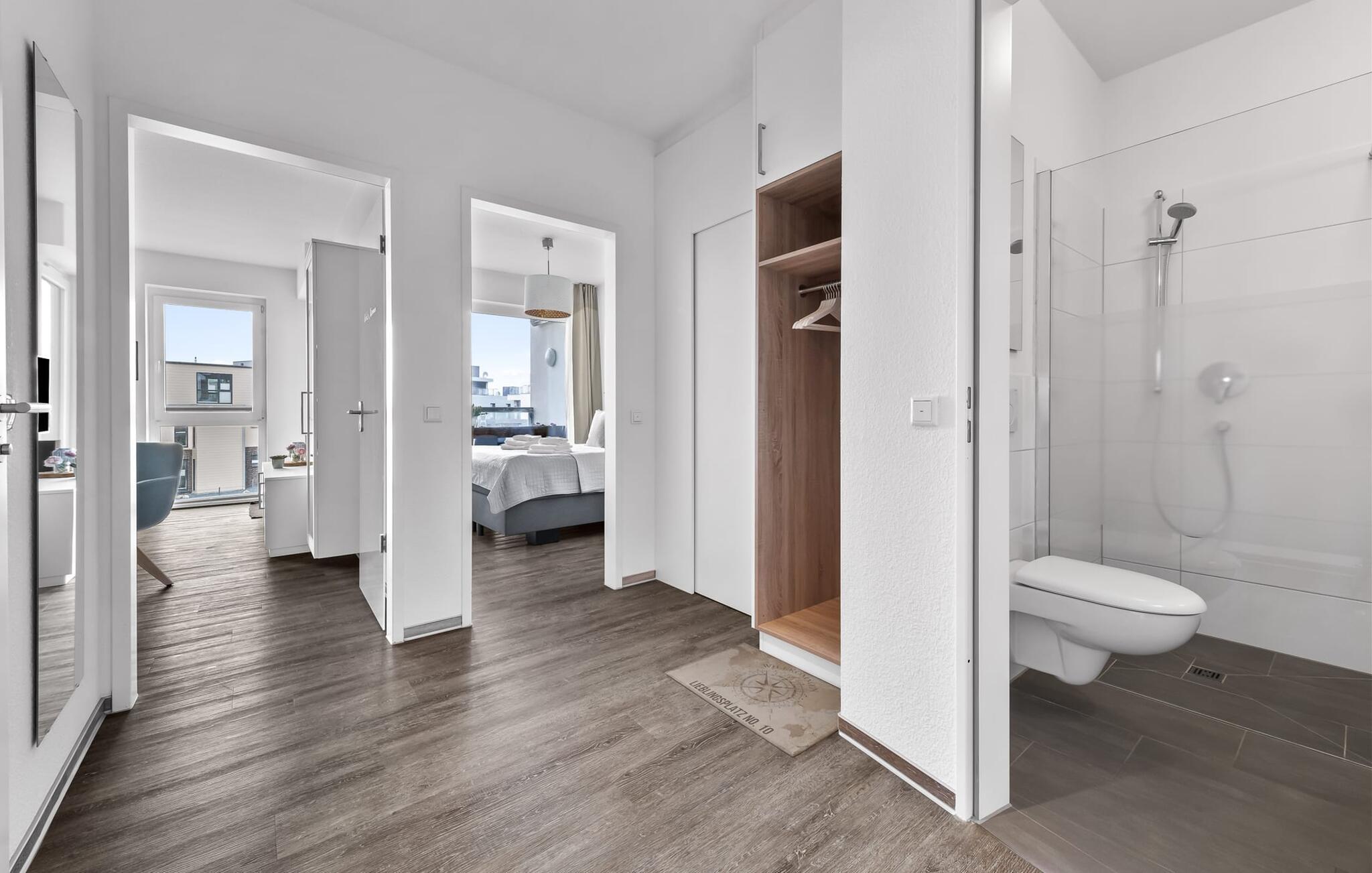 Midt i Østersøen finder I jeres ideelle tilflugtssted på et næs for at flygte fra hverdagen: Yndlingssted nr. 10. Denne eksklusive ferielejlighed ligger ved Østersøen i feriestedet Olpenitz ved Østersøen. Her, omgivet af blide bølger og den friske havbrise, åbner et betagende panorama sig foran jer. Yndlingssted nr. 10 byder på plads til op til seks personer og byder jer velkommen med to hyggelige soveværelser, udstyret med komfortable dobbelte boxmadrasser og smart-tv. Sofaen i stuen med en indbydende lang stol kan omdannes til en ekstra dobbeltseng, perfekt til afslappende nætter. Spisepladsen til seks personer i stuen skaber en harmonisk atmosfære til fælles måltider. Det fuldt udstyrede køkken, som forbinder problemfrit til opholds-/spiseområdet, inviterer jer til at fremtrylle kulinariske delikatesser. Fra hvert vindue kan I nyde den fascinerende udsigt over det omgivende vand. Loggiaen med sin charmerende hjørnebænk bliver et privat tilflugtssted for hyggelige morgener eller romantiske solnedgange for to. Et rigtigt højdepunkt og et naturligt skue. Lejligheden indeholder to badeværelser, begge med walk-in brusere, der tilbyder et ekstra strejf af luksus og komfort. Disse moderne og stilfulde badeværelser er perfekte oaser for afslapning og afrunder booplevelsen på favoritsted nr. 10 rabat. Til lejligheden hører en privat parkeringsplads, som giver jer frihed til at udforske det omkringliggende område fleksibelt. Cykelelskere har deres egen cykelkælder, inklusive gratis stikkontakter til e-cykler. Schlei/Østersøregionen tiltrækker med maleriske cykelstier, der er perfekte til lange ture i naturen. Fordyb jer i Østersøens verden, et sted, hvor hverdagen synker ned i bølgerne, og tiden ser ud til at stå stille. Oplev uforglemmelige øjeblikke og skab minder med hele familien. Vores favoritsted: På hjørnesædet på balkonen lige foran Østersøen, bedst med en kop kaffe i hånden. I kælderen er der vaskemaskine og tørretumbler til fælles brug. Betaling sker via en møntautomat. I sidebygningen af komplekset venter der gæsterne et eksklusivt pool- og wellnessområde, som naturligvis kan benyttes gratis. Dyk ned i det behageligt tempererede vand, og lad blikket glide ud over Østersøens vidder – en oplevelse for alle sanser. Velgørende saunature indbyder til ophold og giver jer dyb afslapning. Giv jer selv disse små pauser og læg hverdagens stress bag jer – til en ferie fuld af ro, nydelse og ny energi. Bemærk venligst: OstseeResort Olpenitz er meget populært, og der bygges fortsat i parken. Ikke desto mindre kan I se frem til en 5-stjernet standard og et førsteklasses ophold. Byggeaktiviteterne kommer ikke til at forstyrre jer på ferien, og derfor gives der ikke yderligere afslag i prisen.