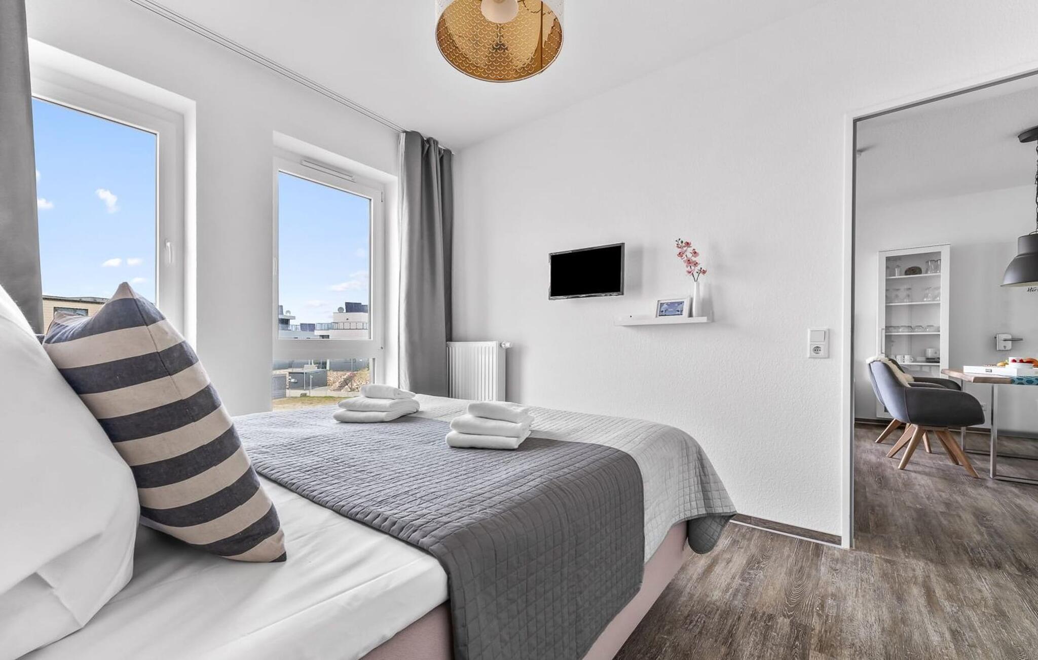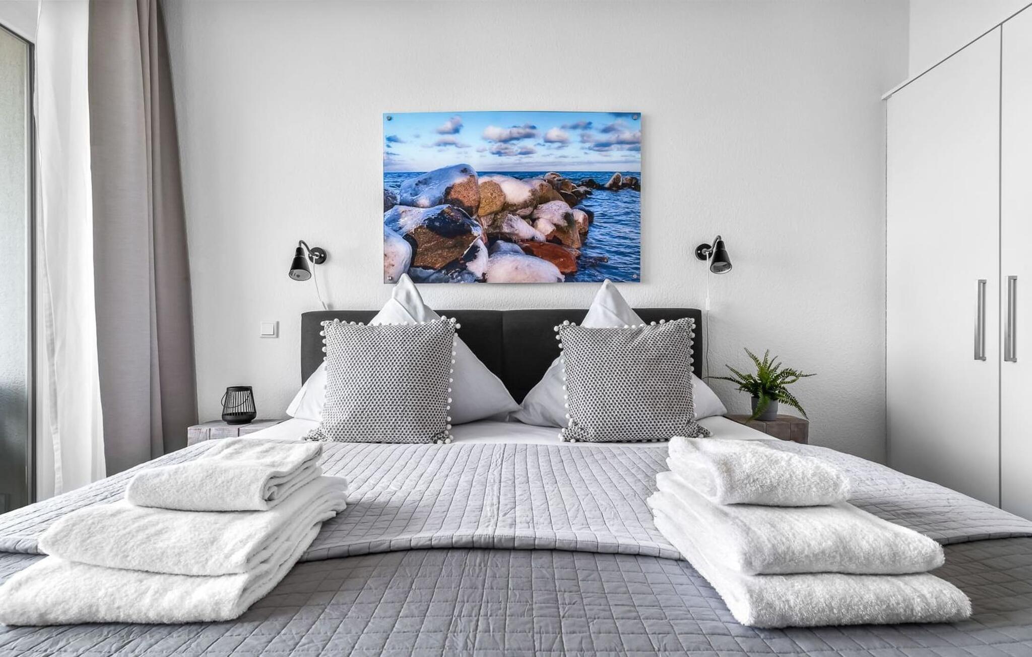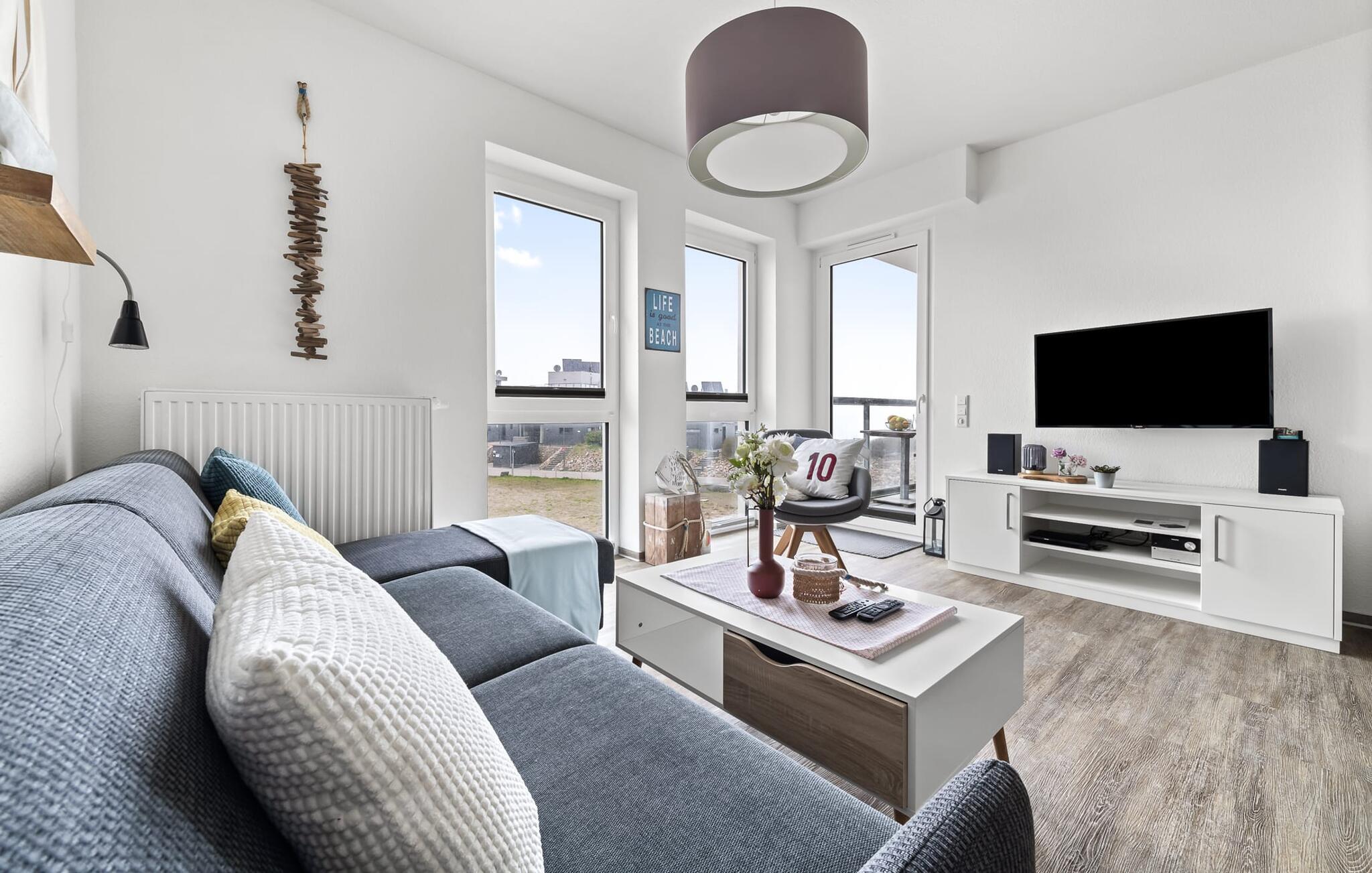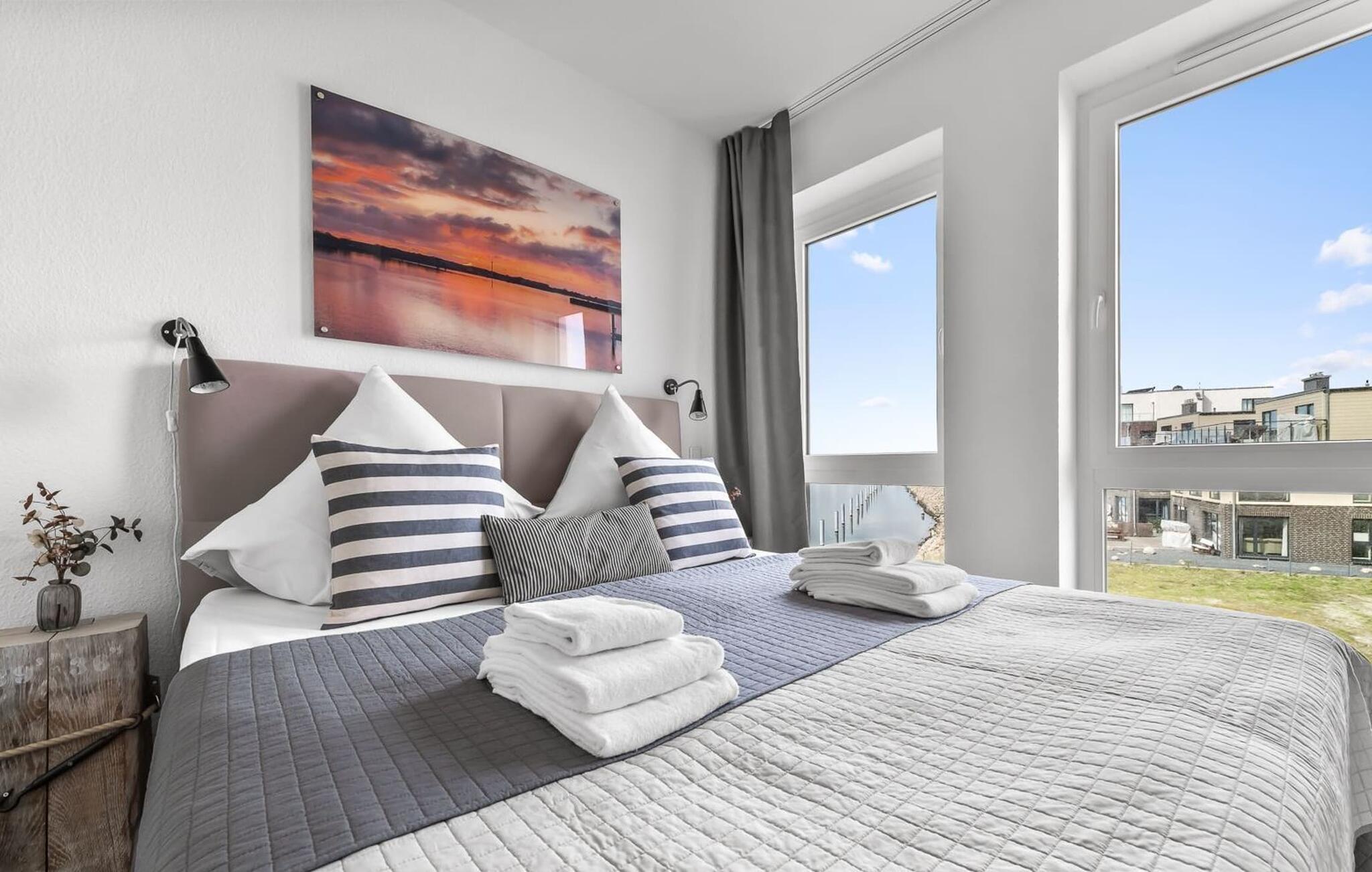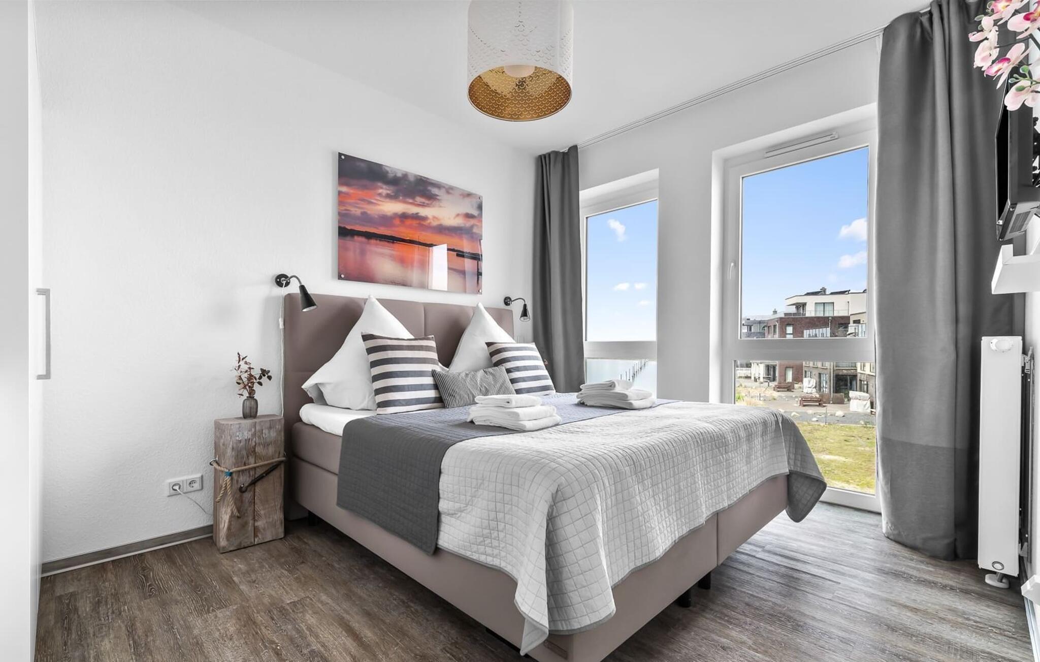 Midt i Østersøen finder I jeres ideelle tilflugtssted på et næs for at flygte fra hverdagen: Yndlingssted nr. 10. Denne eksklusive ferielejlighed ligger ved Østersøen i feriestedet Olpenitz ved Østersøen. Her, omgivet af blide bølger og den friske havbrise, åbner et betagende panorama sig foran jer. Yndlingssted nr. 10 byder på plads til op til seks personer og byder jer velkommen med to hyggelige soveværelser, udstyret med komfortable dobbelte boxmadrasser og smart-tv. Sofaen i stuen med en indbydende lang stol kan omdannes til en ekstra dobbeltseng, perfekt til afslappende nætter. Spisepladsen til seks personer i stuen skaber en harmonisk atmosfære til fælles måltider. Det fuldt udstyrede køkken, som forbinder problemfrit til opholds-/spiseområdet, inviterer jer til at fremtrylle kulinariske delikatesser. Fra hvert vindue kan I nyde den fascinerende udsigt over det omgivende vand. Loggiaen med sin charmerende hjørnebænk bliver et privat tilflugtssted for hyggelige morgener eller romantiske solnedgange for to. Et rigtigt højdepunkt og et naturligt skue. Lejligheden indeholder to badeværelser, begge med walk-in brusere, der tilbyder et ekstra strejf af luksus og komfort. Disse moderne og stilfulde badeværelser er perfekte oaser for afslapning og afrunder booplevelsen på favoritsted nr. 10 rabat. Til lejligheden hører en privat parkeringsplads, som giver jer frihed til at udforske det omkringliggende område fleksibelt. Cykelelskere har deres egen cykelkælder, inklusive gratis stikkontakter til e-cykler. Schlei/Østersøregionen tiltrækker med maleriske cykelstier, der er perfekte til lange ture i naturen. Fordyb jer i Østersøens verden, et sted, hvor hverdagen synker ned i bølgerne, og tiden ser ud til at stå stille. Oplev uforglemmelige øjeblikke og skab minder med hele familien. Vores favoritsted: På hjørnesædet på balkonen lige foran Østersøen, bedst med en kop kaffe i hånden. I kælderen er der vaskemaskine og tørretumbler til fælles brug. Betaling sker via en møntautomat. I sidebygningen af komplekset venter der gæsterne et eksklusivt pool- og wellnessområde, som naturligvis kan benyttes gratis. Dyk ned i det behageligt tempererede vand, og lad blikket glide ud over Østersøens vidder – en oplevelse for alle sanser. Velgørende saunature indbyder til ophold og giver jer dyb afslapning. Giv jer selv disse små pauser og læg hverdagens stress bag jer – til en ferie fuld af ro, nydelse og ny energi. Bemærk venligst: OstseeResort Olpenitz er meget populært, og der bygges fortsat i parken. Ikke desto mindre kan I se frem til en 5-stjernet standard og et førsteklasses ophold. Byggeaktiviteterne kommer ikke til at forstyrre jer på ferien, og derfor gives der ikke yderligere afslag i prisen.