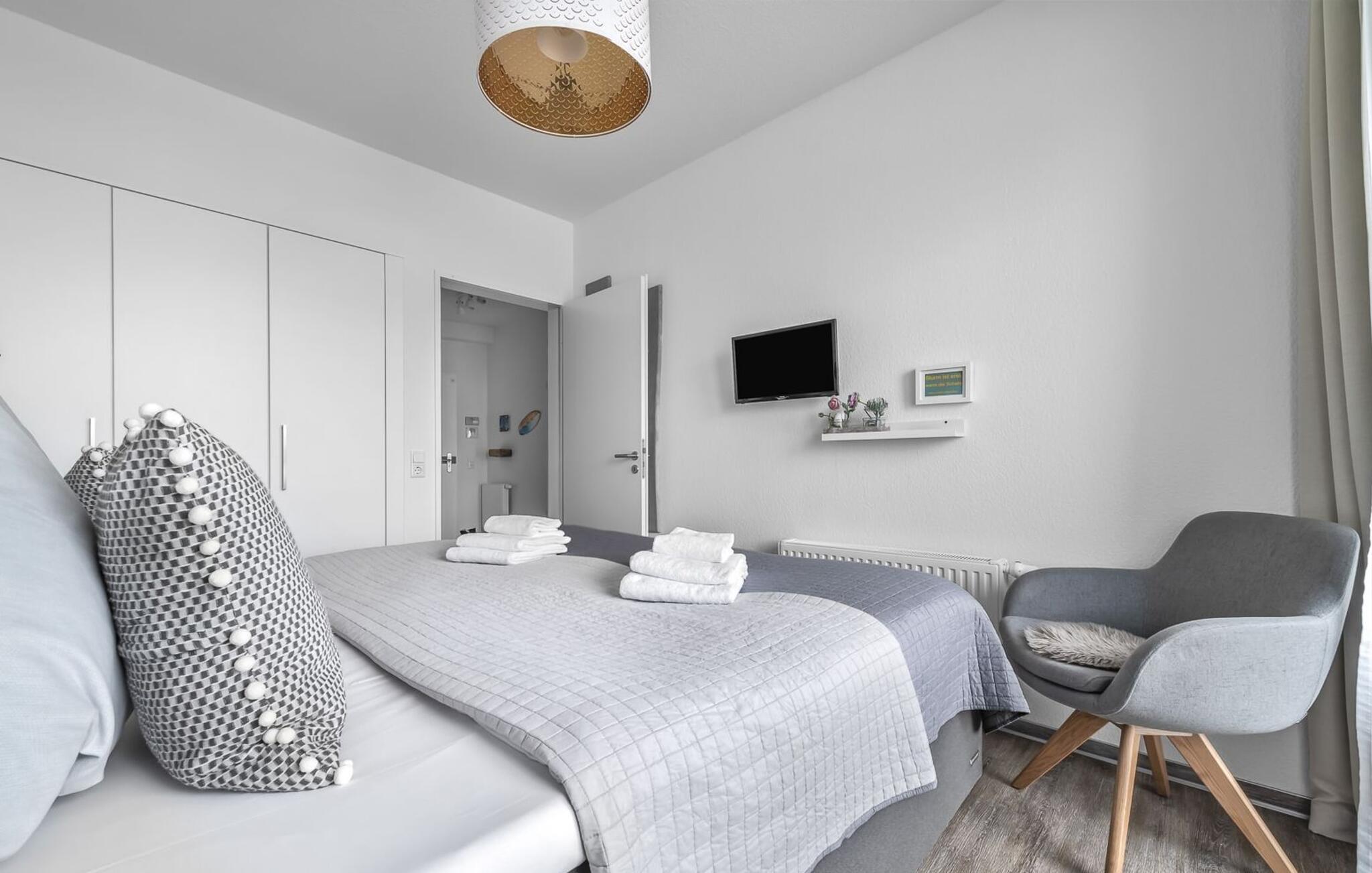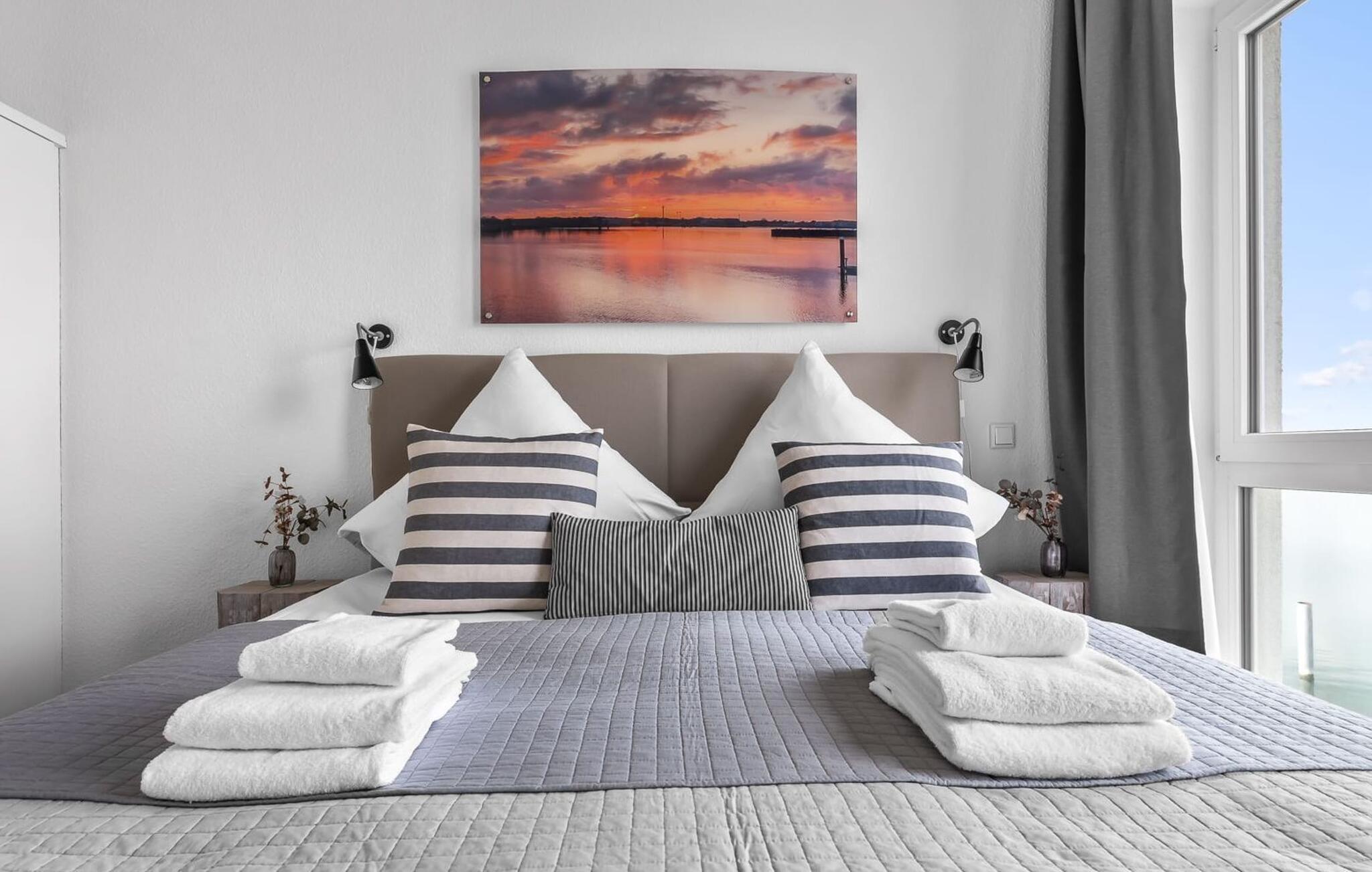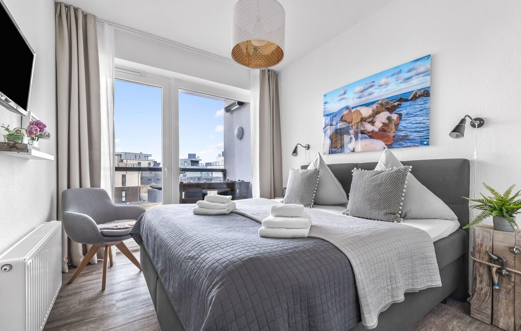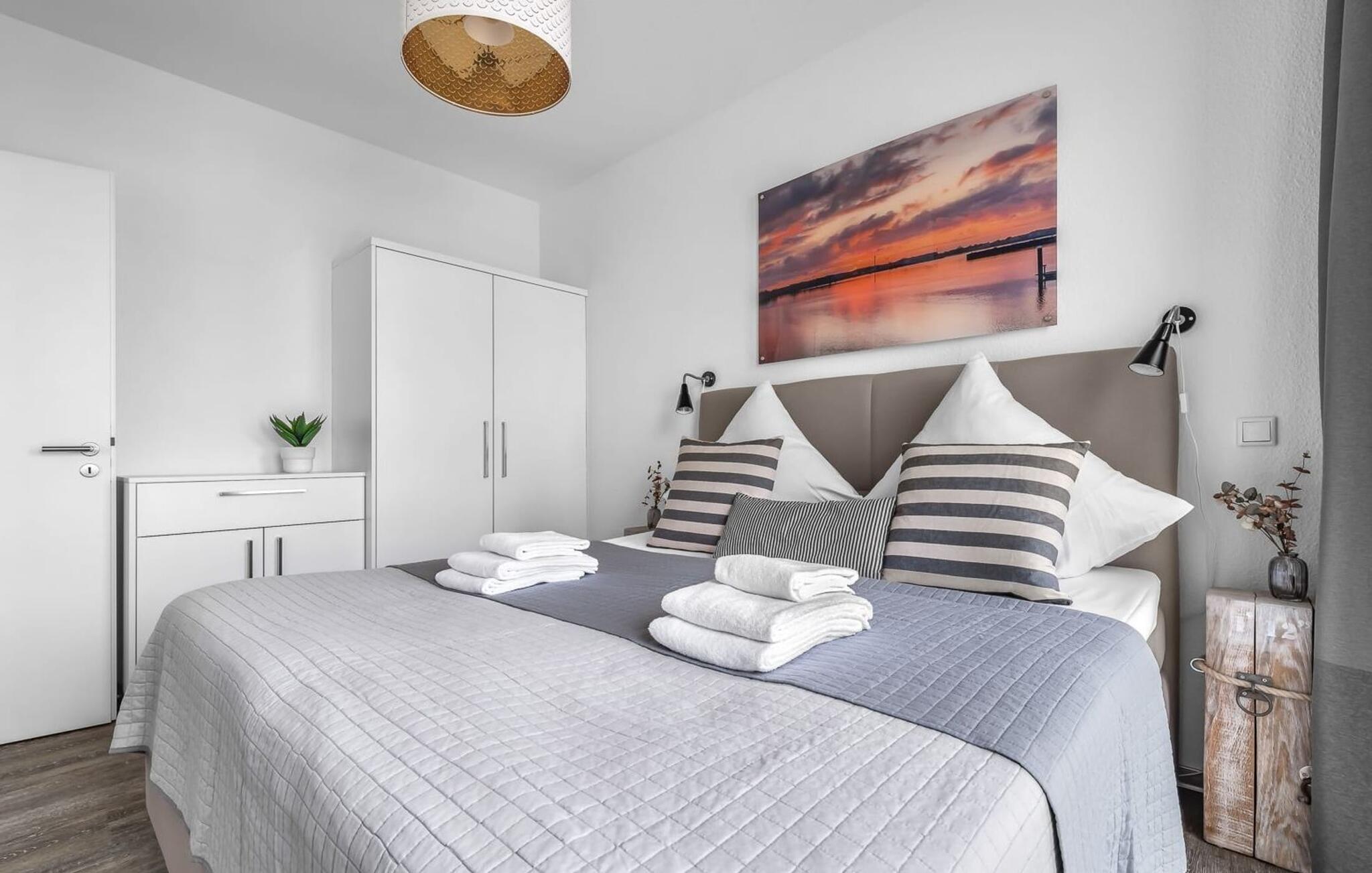 Midt i Østersøen finder I jeres ideelle tilflugtssted på et næs for at flygte fra hverdagen: Yndlingssted nr. 10. Denne eksklusive ferielejlighed ligger ved Østersøen i feriestedet Olpenitz ved Østersøen. Her, omgivet af blide bølger og den friske havbrise, åbner et betagende panorama sig foran jer. Yndlingssted nr. 10 byder på plads til op til seks personer og byder jer velkommen med to hyggelige soveværelser, udstyret med komfortable dobbelte boxmadrasser og smart-tv. Sofaen i stuen med en indbydende lang stol kan omdannes til en ekstra dobbeltseng, perfekt til afslappende nætter. Spisepladsen til seks personer i stuen skaber en harmonisk atmosfære til fælles måltider. Det fuldt udstyrede køkken, som forbinder problemfrit til opholds-/spiseområdet, inviterer jer til at fremtrylle kulinariske delikatesser. Fra hvert vindue kan I nyde den fascinerende udsigt over det omgivende vand. Loggiaen med sin charmerende hjørnebænk bliver et privat tilflugtssted for hyggelige morgener eller romantiske solnedgange for to. Et rigtigt højdepunkt og et naturligt skue. Lejligheden indeholder to badeværelser, begge med walk-in brusere, der tilbyder et ekstra strejf af luksus og komfort. Disse moderne og stilfulde badeværelser er perfekte oaser for afslapning og afrunder booplevelsen på favoritsted nr. 10 rabat. Til lejligheden hører en privat parkeringsplads, som giver jer frihed til at udforske det omkringliggende område fleksibelt. Cykelelskere har deres egen cykelkælder, inklusive gratis stikkontakter til e-cykler. Schlei/Østersøregionen tiltrækker med maleriske cykelstier, der er perfekte til lange ture i naturen. Fordyb jer i Østersøens verden, et sted, hvor hverdagen synker ned i bølgerne, og tiden ser ud til at stå stille. Oplev uforglemmelige øjeblikke og skab minder med hele familien. Vores favoritsted: På hjørnesædet på balkonen lige foran Østersøen, bedst med en kop kaffe i hånden. I kælderen er der vaskemaskine og tørretumbler til fælles brug. Betaling sker via en møntautomat. I sidebygningen af komplekset venter der gæsterne et eksklusivt pool- og wellnessområde, som naturligvis kan benyttes gratis. Dyk ned i det behageligt tempererede vand, og lad blikket glide ud over Østersøens vidder – en oplevelse for alle sanser. Velgørende saunature indbyder til ophold og giver jer dyb afslapning. Giv jer selv disse små pauser og læg hverdagens stress bag jer – til en ferie fuld af ro, nydelse og ny energi. Bemærk venligst: OstseeResort Olpenitz er meget populært, og der bygges fortsat i parken. Ikke desto mindre kan I se frem til en 5-stjernet standard og et førsteklasses ophold. Byggeaktiviteterne kommer ikke til at forstyrre jer på ferien, og derfor gives der ikke yderligere afslag i prisen.