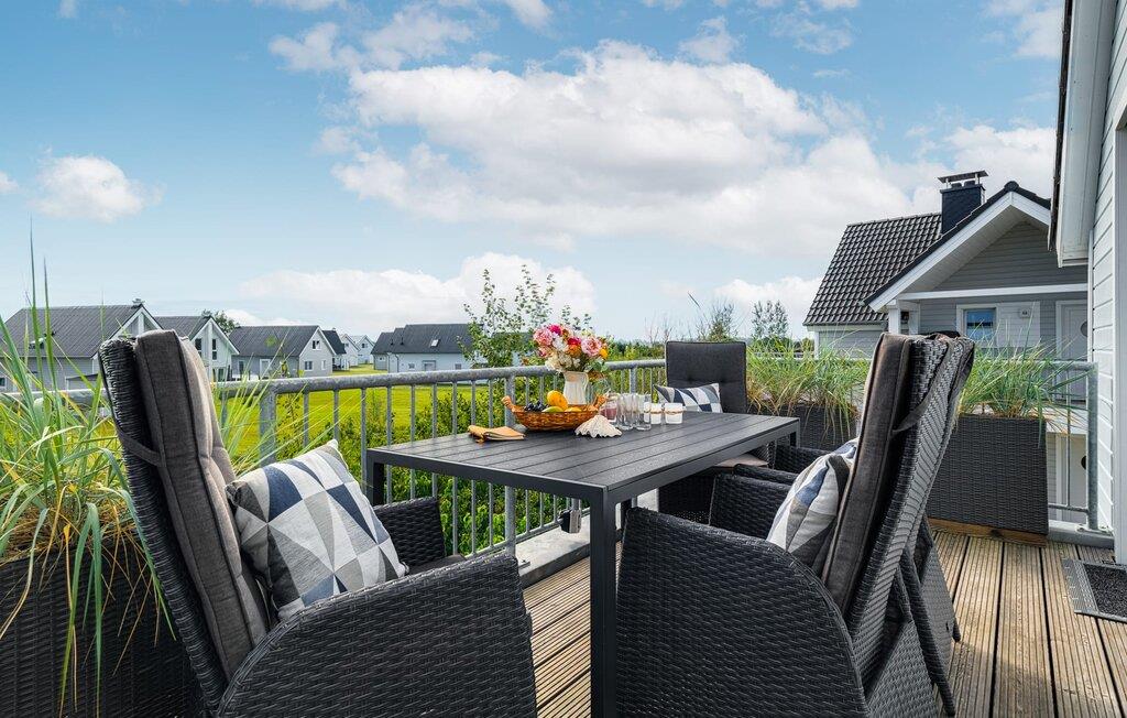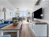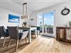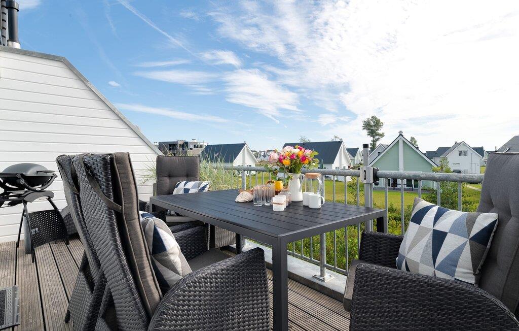 Ferielejlighedens opholds- og spisestue ligger badet i lys, med panoramavindue fra gulv til loft ud mod de tilstødende altaner på begge sider. En lille oase til at afslutte den travle dag på jeres ferie og nyde hyggelige grillaftener.