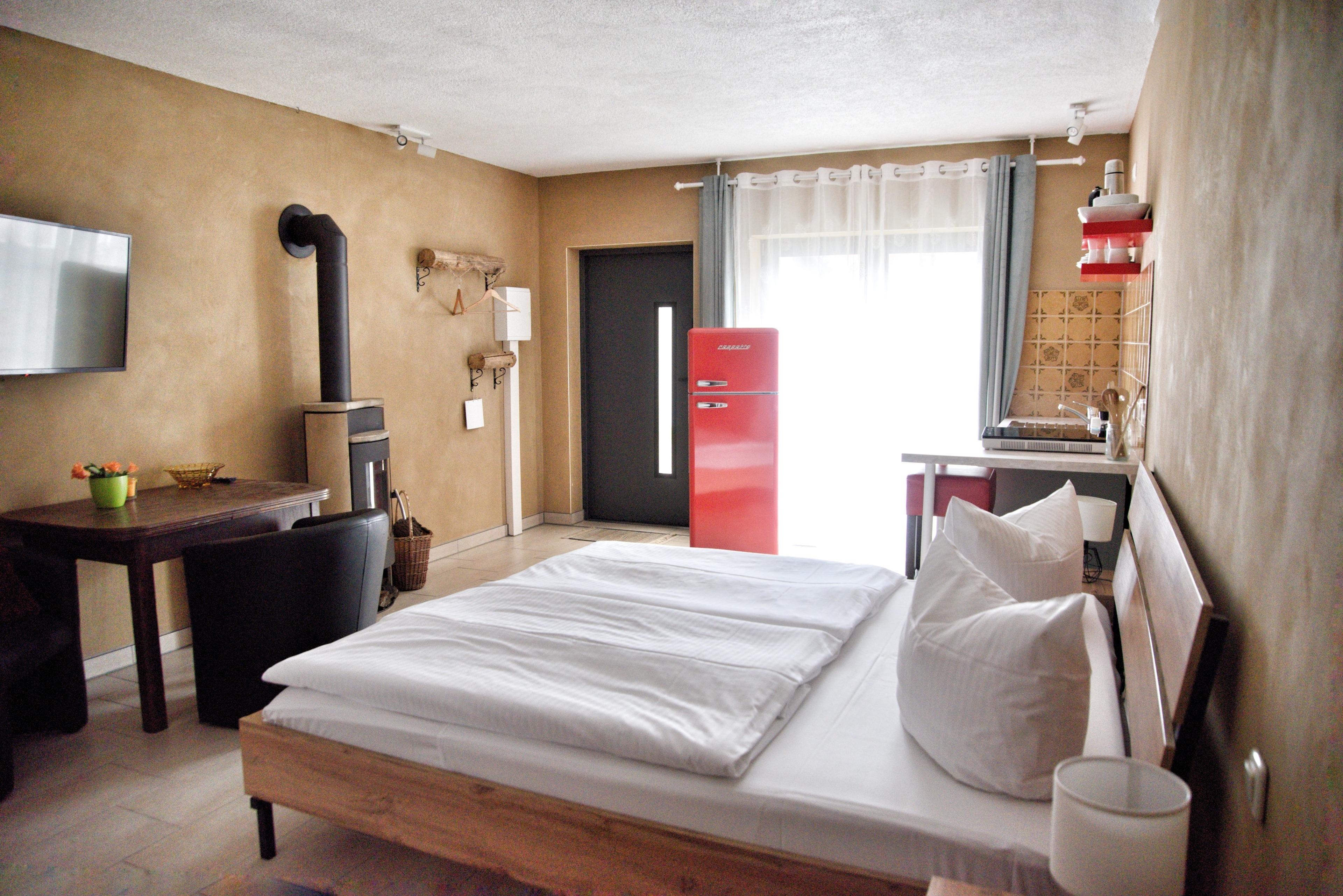 Ihr Studio ist mit einem großen Doppelbett ausgestattet. Weiterhin stehen Ihnen ein Fernseher, ein Esstisch mit gemütlichen Cocktailsesseln, eine Garderobe und eine Küchenzeile zur Verfügung. In der Küche erwartet Sie ein Induktions-Kochfeld, eine Mikrowelle, ein Geschirrspüler und eine große Kühl- Gefrierkombination. Geschirr und Küchenutensilien sind natürlich auch für Sie vorhanden.