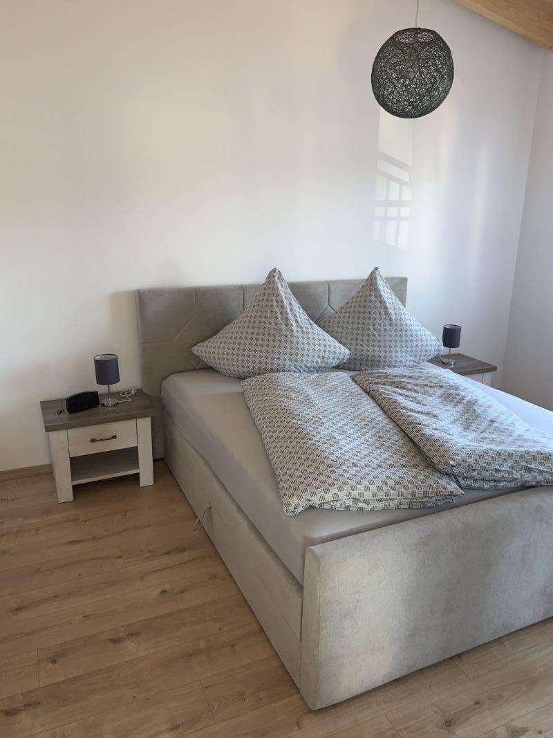 Schlafen: Die Ferienwohnung verfügt über ein Schlafzimmer mit hochwertigem Boxspringbett (180x200), sowie über eine weitere hochwertige Schlafgelegenheit im Wohnzimmer.