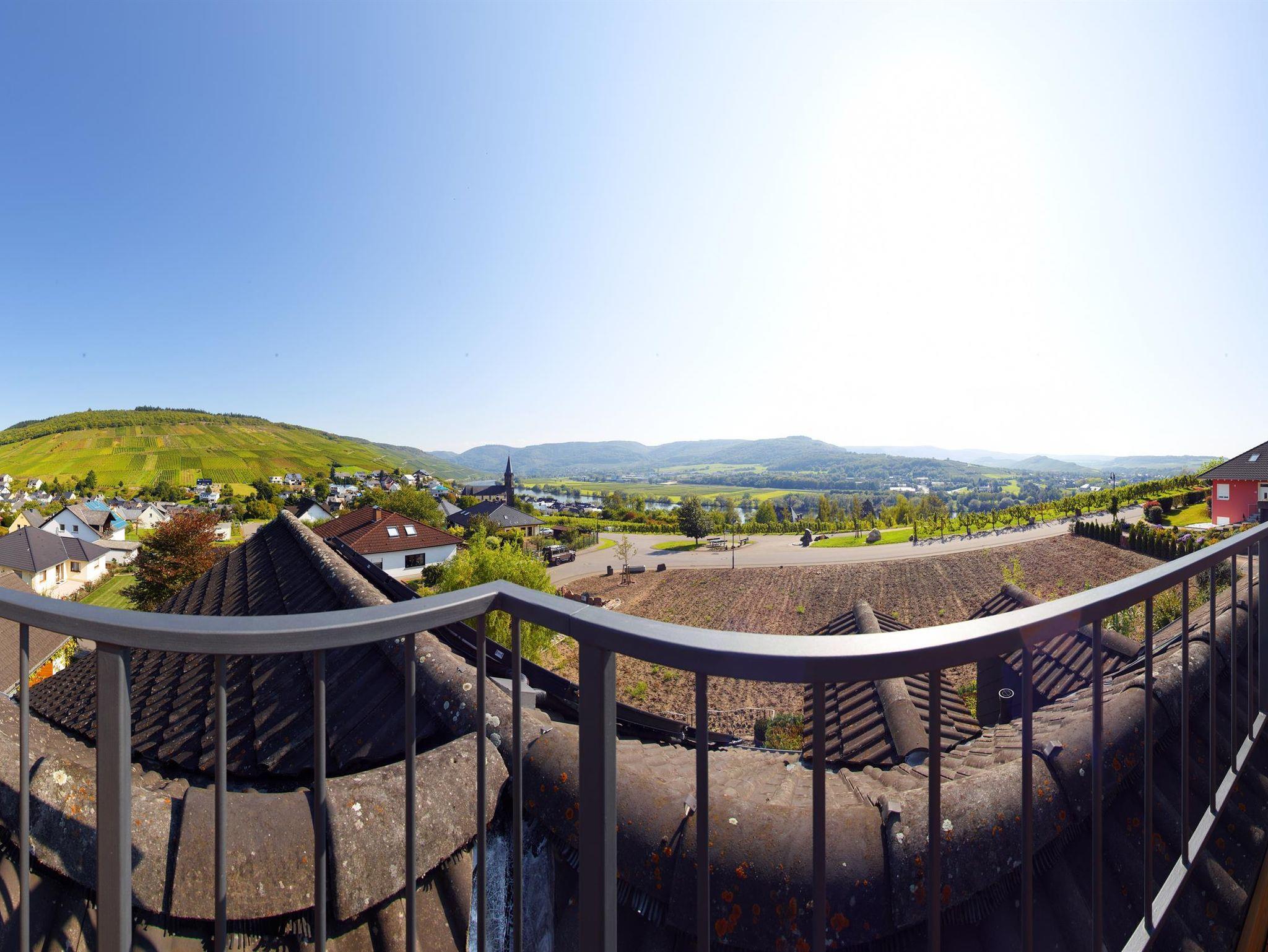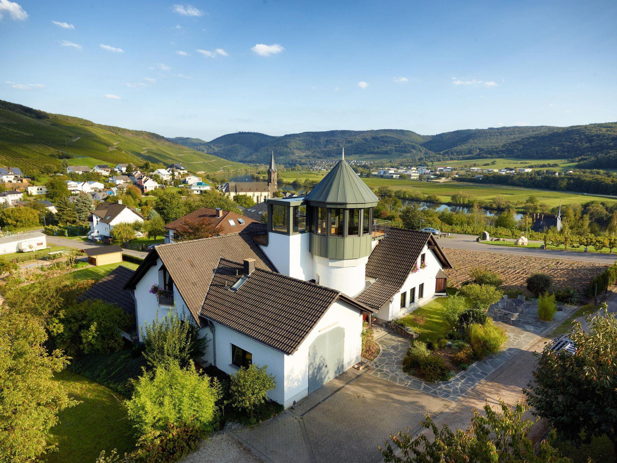 Nach einem Tag Wandern oder Fahrradfahren können Sie im Garten oder im Panorama-Turm oder auf der fantastischen Dachterrasse entspannen und ein hervorragendes Glas Wein vom eigenen mehrfach ausgezeichneten Weingut genießen und ins Moseltal blicken.