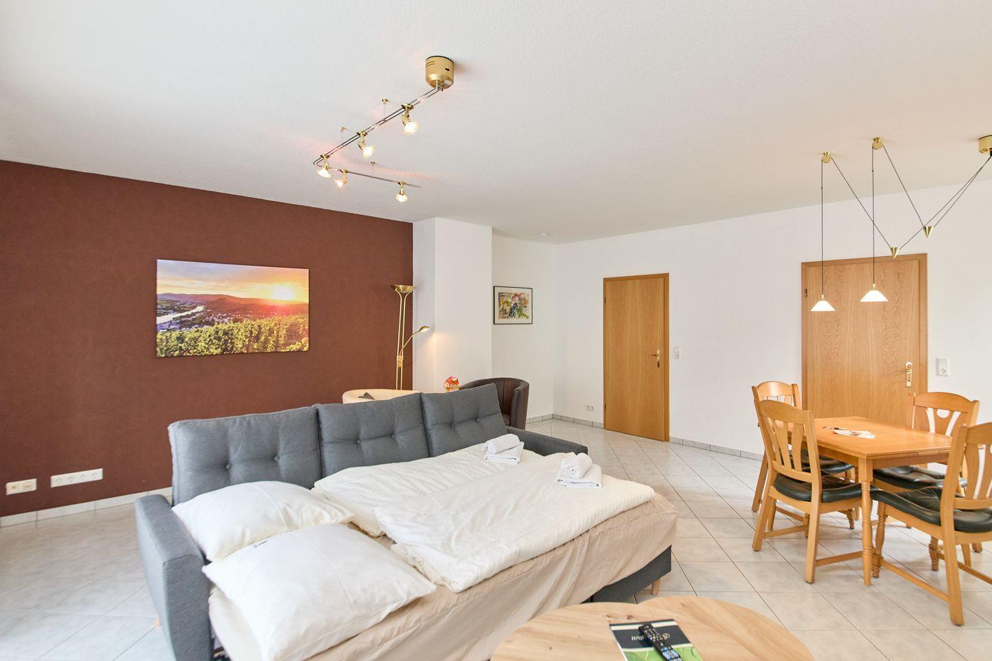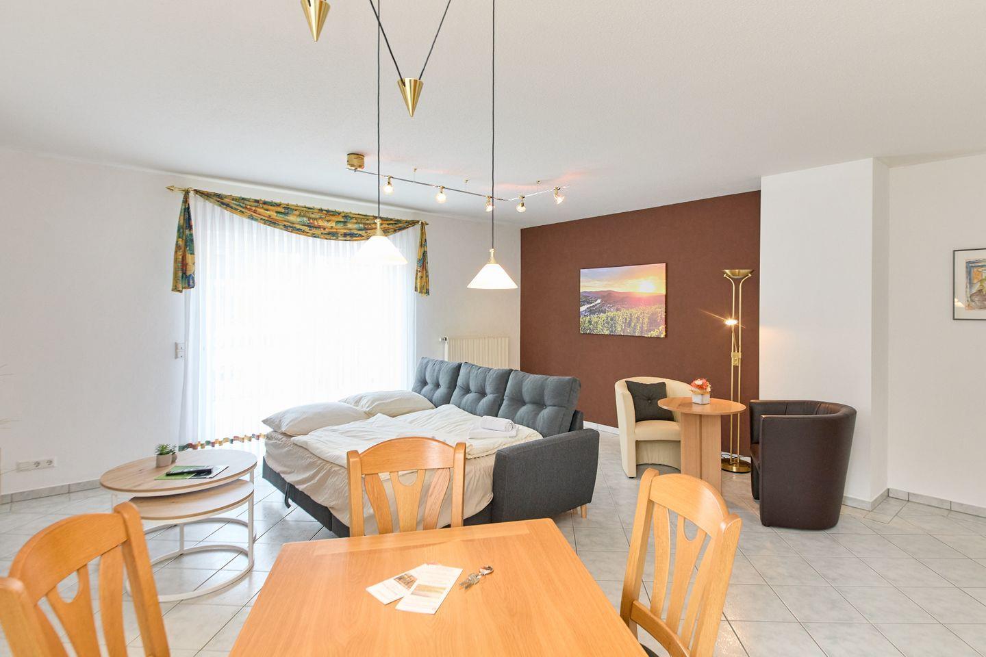 Die Fewo Heldensicht befindet sich im Erdgeschoss und zeichnet sich durch ihre praktische und durchdachte Raumaufteilung aus. Mit einem Schlafzimmer und einem zusätzlichen Wohnbereich, der auch als Schlafmöglichkeit genutzt werden kann, erleben Sie hier höchsten Komfort. Das ansprechende Wohnzimmer ist mit einer Sofaecke, einem Esstisch und modernem Entertainment ausgestattet, darunter zwei Fernseher mit internationalen Kanälen – perfekt für gemütliche Abende nach einem erlebnisreichen Tag.