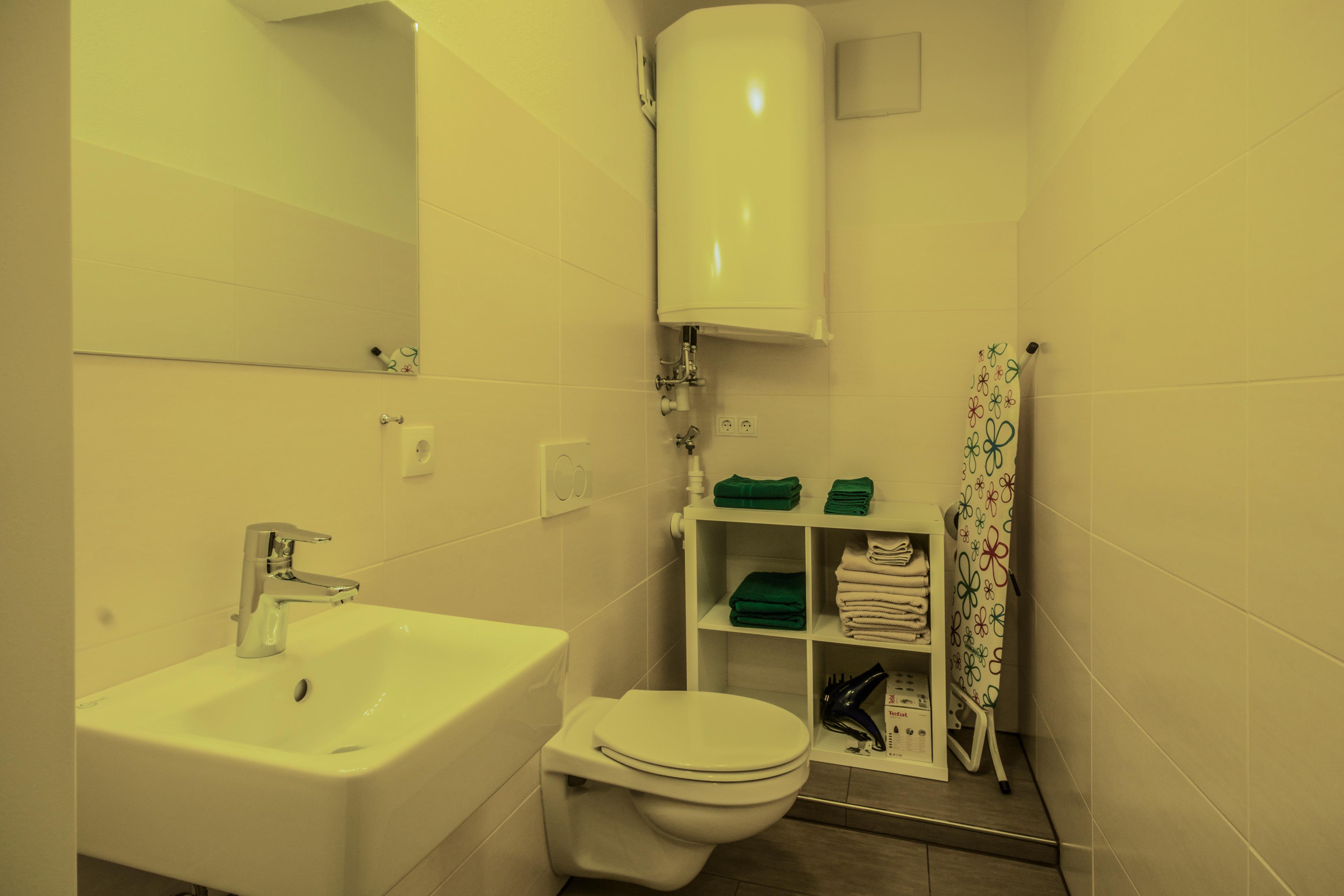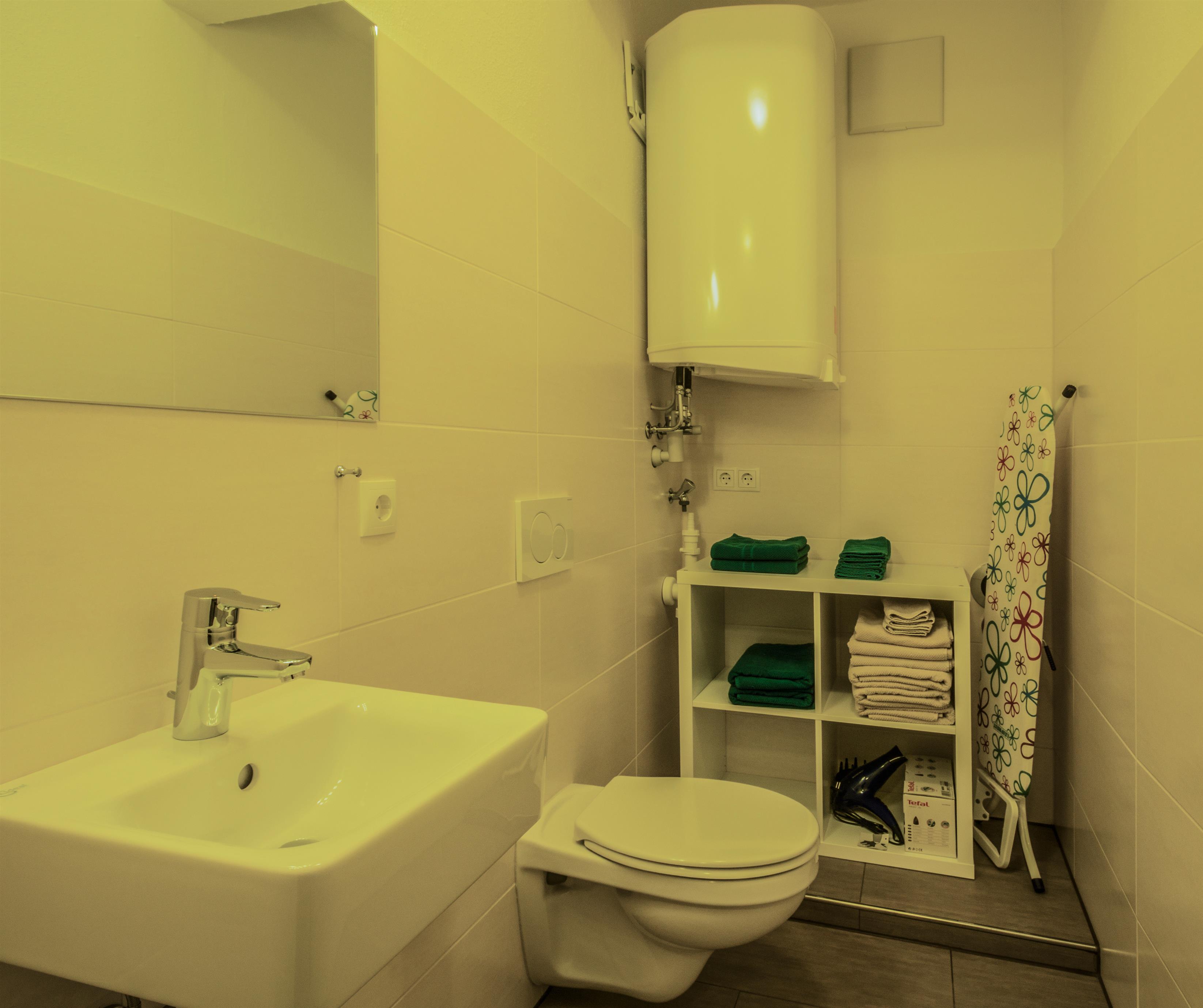Im großen Badezimmer finden Sie 2 Waschbecken, einen Handtuchwärmer und eine Wannendusche. Dazu gibt es ein separates WC.