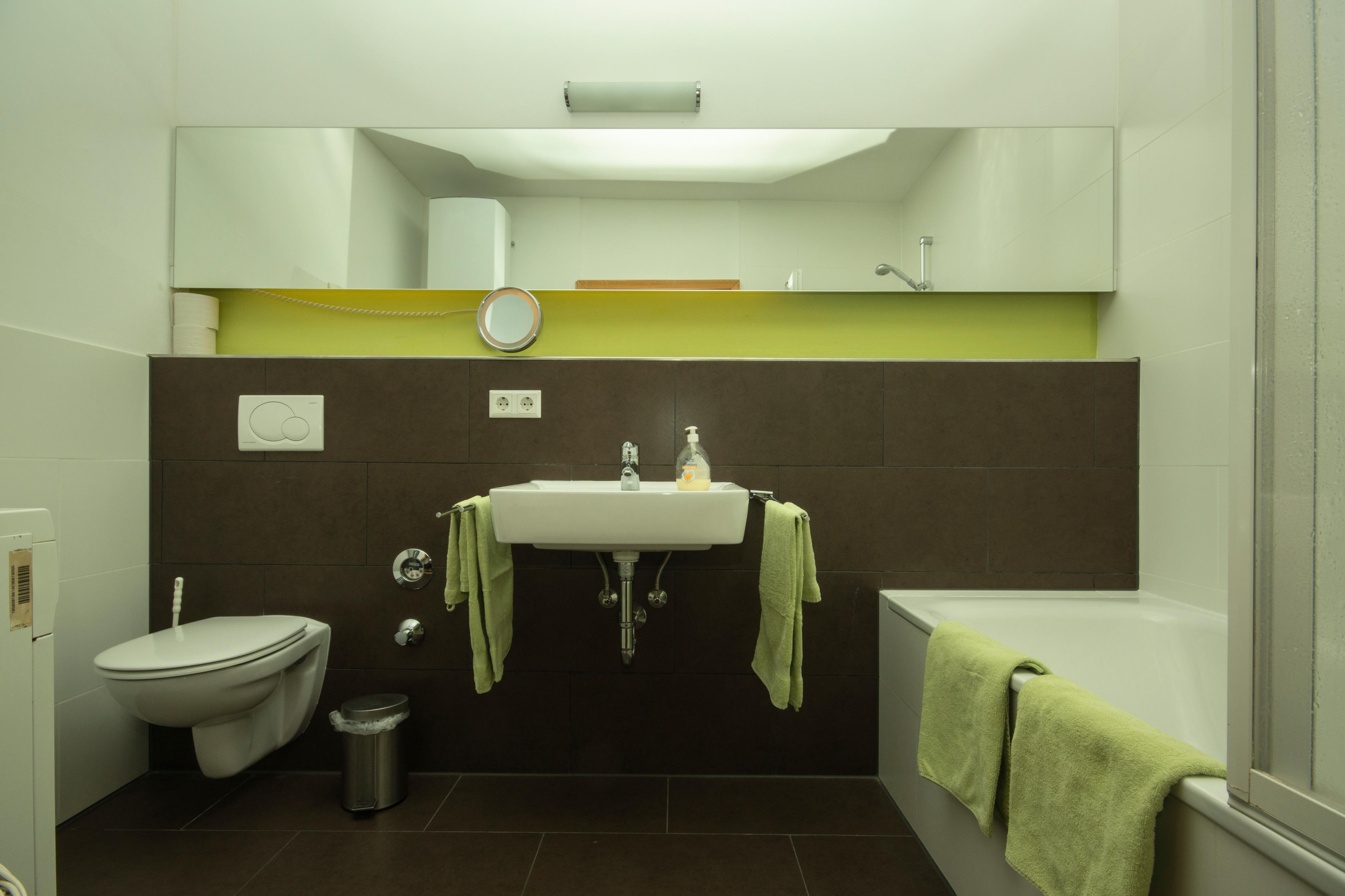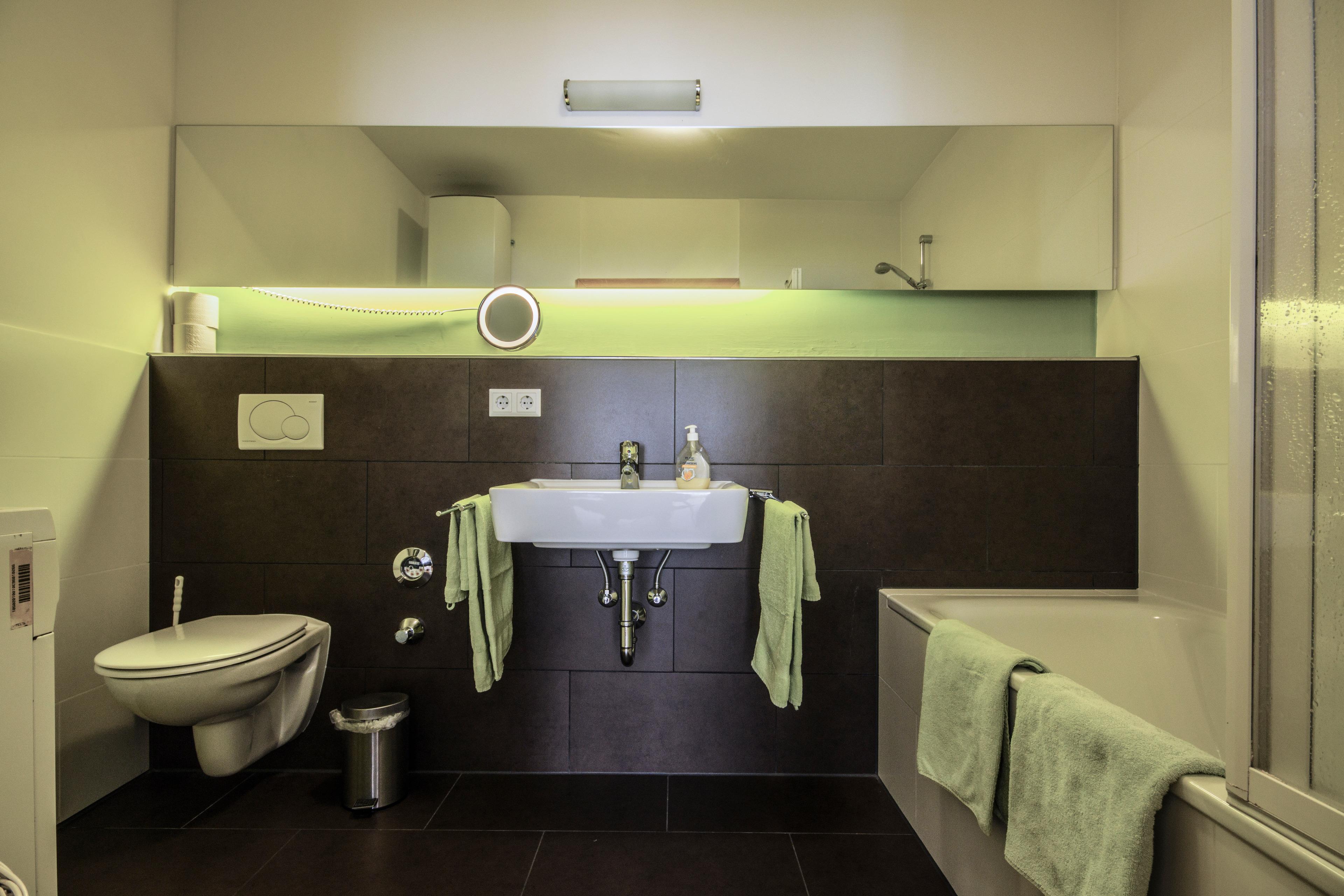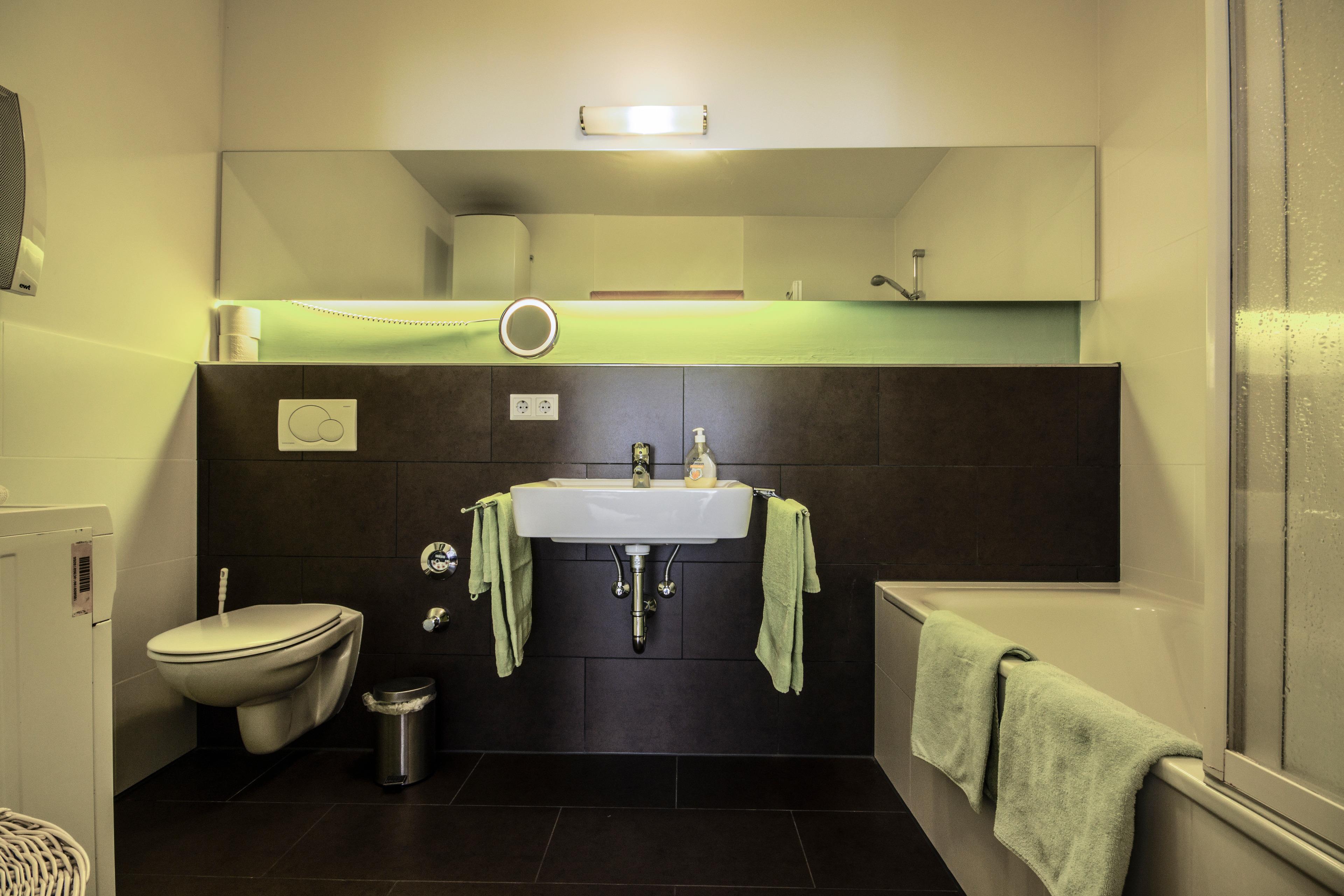 Im Privatbereich erwarten Sie ein wohldimensioniertes Schlafzimmer mit Doppelbett sowie ein modernes Wohlfühlbad mit Duschwanne und Waschmaschine.