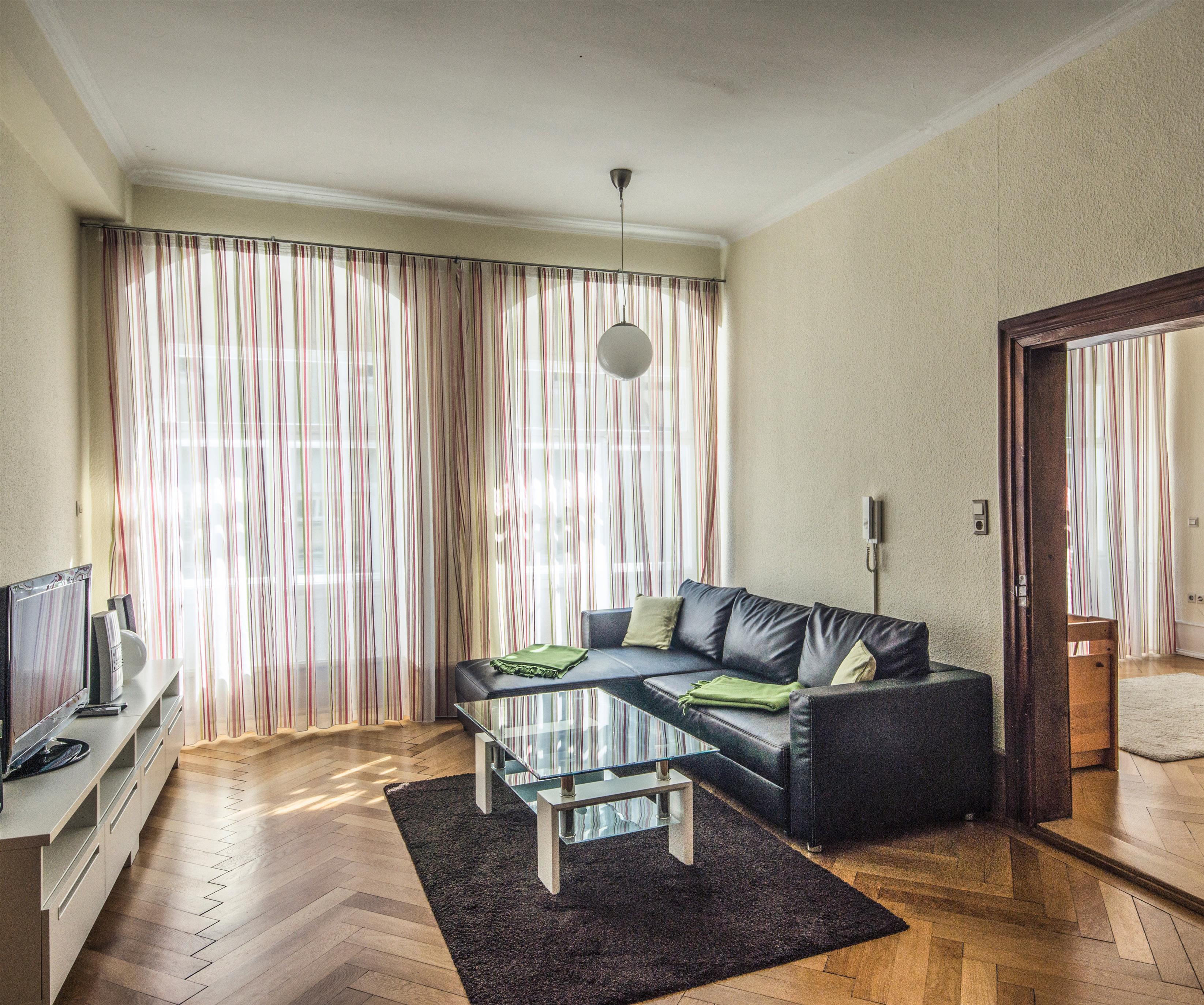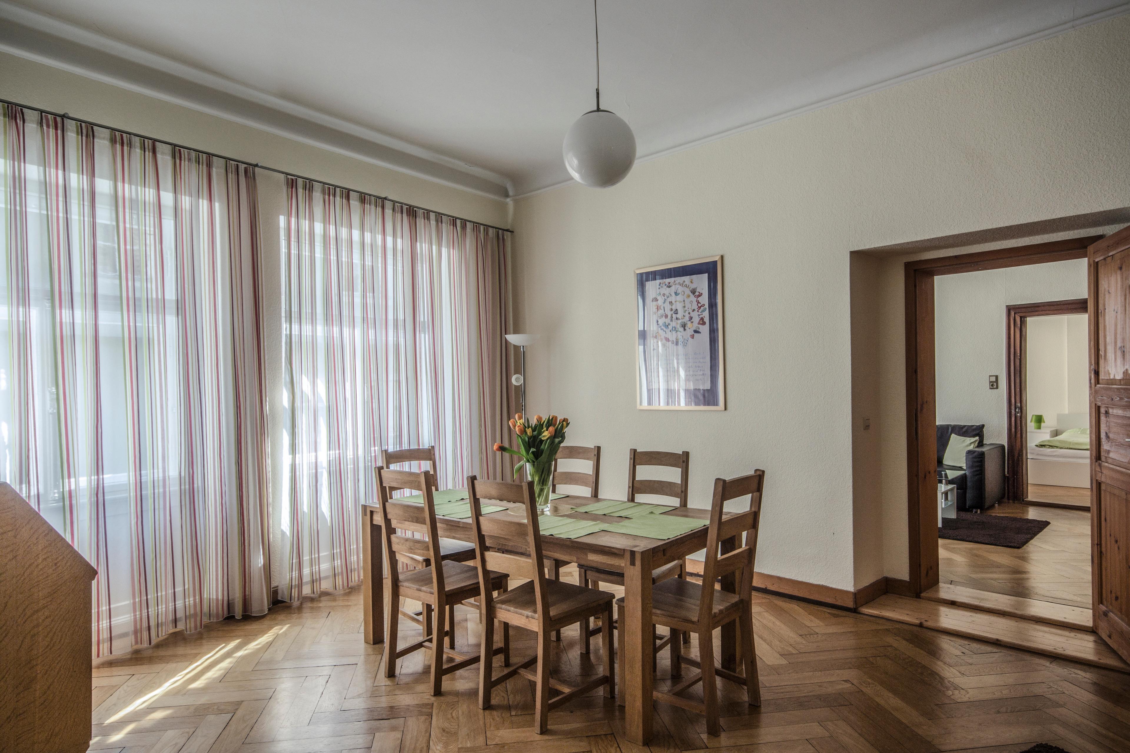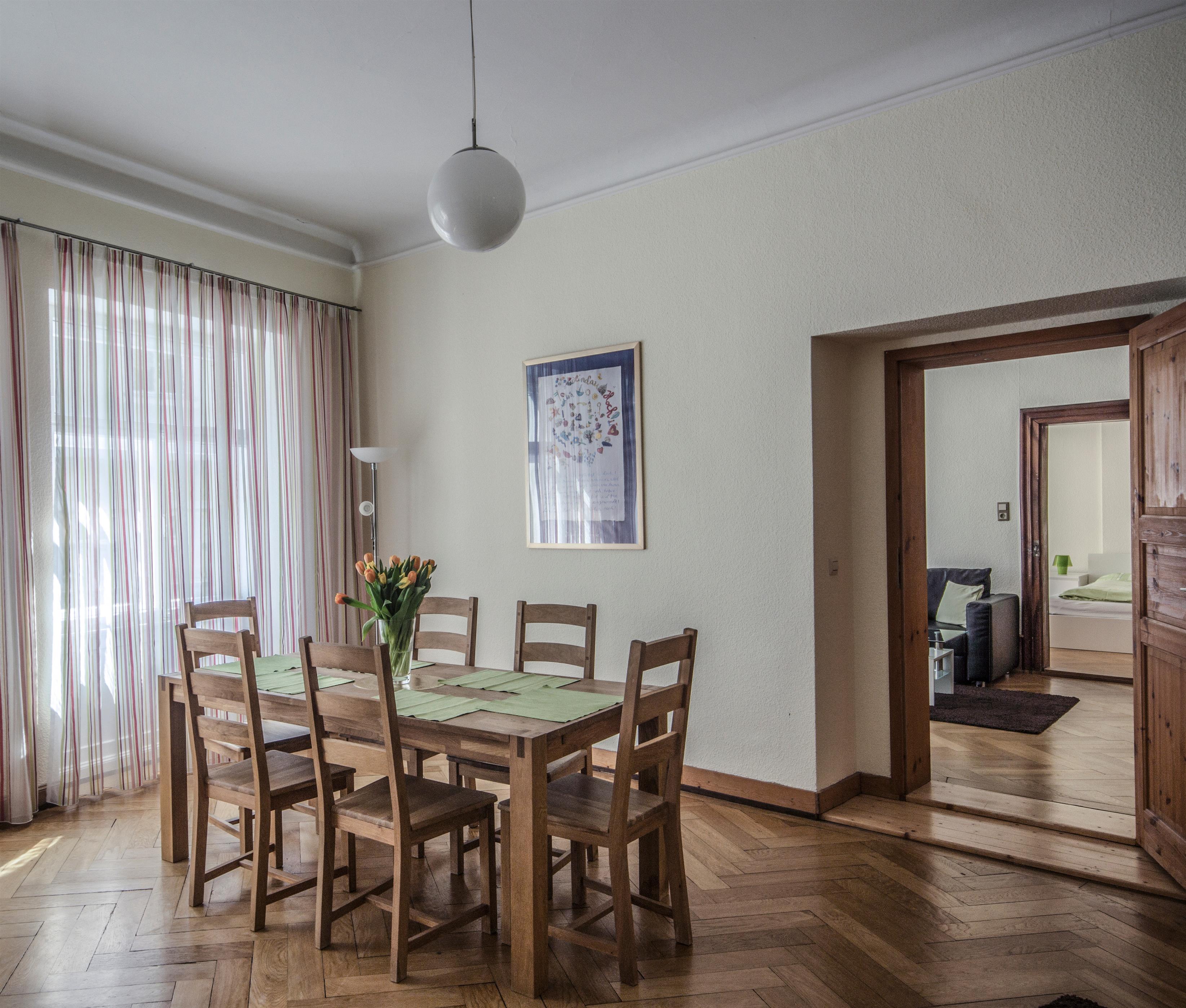 Ein großes, modernes Esszimmer mit offener Küche ist das gemütliche Herzstück dieser Wohnung. Wenn Sie die Geräumigkeit eines Altbaus lieben, werden Sie sich hier wohlfühlen.