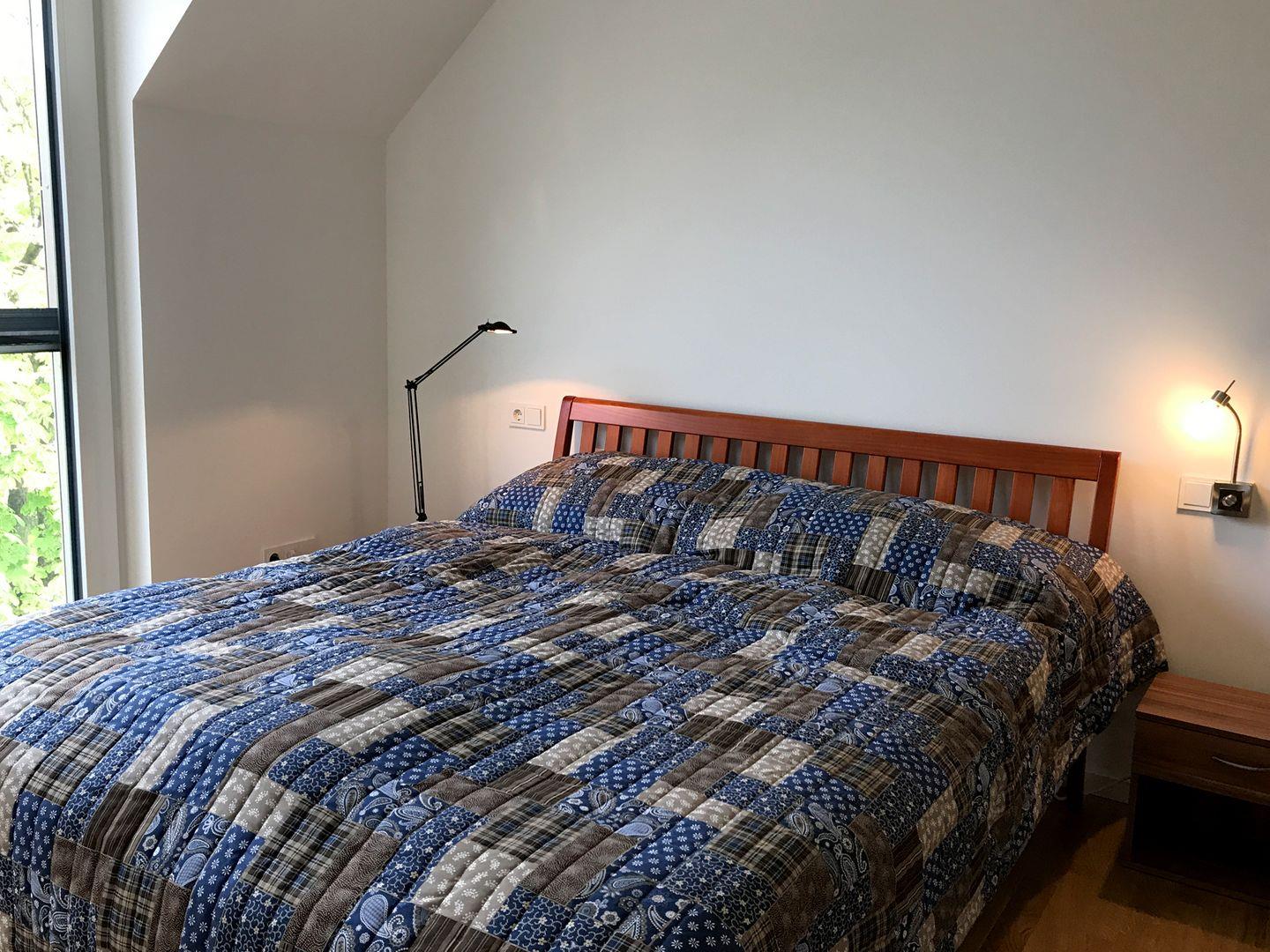 Das Schlafzimmer ist mit einem Doppelbett, kleinem Sekretär und Kommode eingerichtet. Dreifach isolierverglaste Fenster mit elektrisch gesteuerten Jalousien sorgen für erholsamen Schlaf, während ein modernes Belüftungssystem automatisch für ein angenehmes Raumklima sorgt. Direkt neben dem Schlafzimmer befindet sich ein modernes Duschbad mit ebenerdiger Dusche sowie einer Waschmaschine mit Trocknerfunktion. Vom Flur aus gelangen Sie in den begehbaren Kleiderschrank.