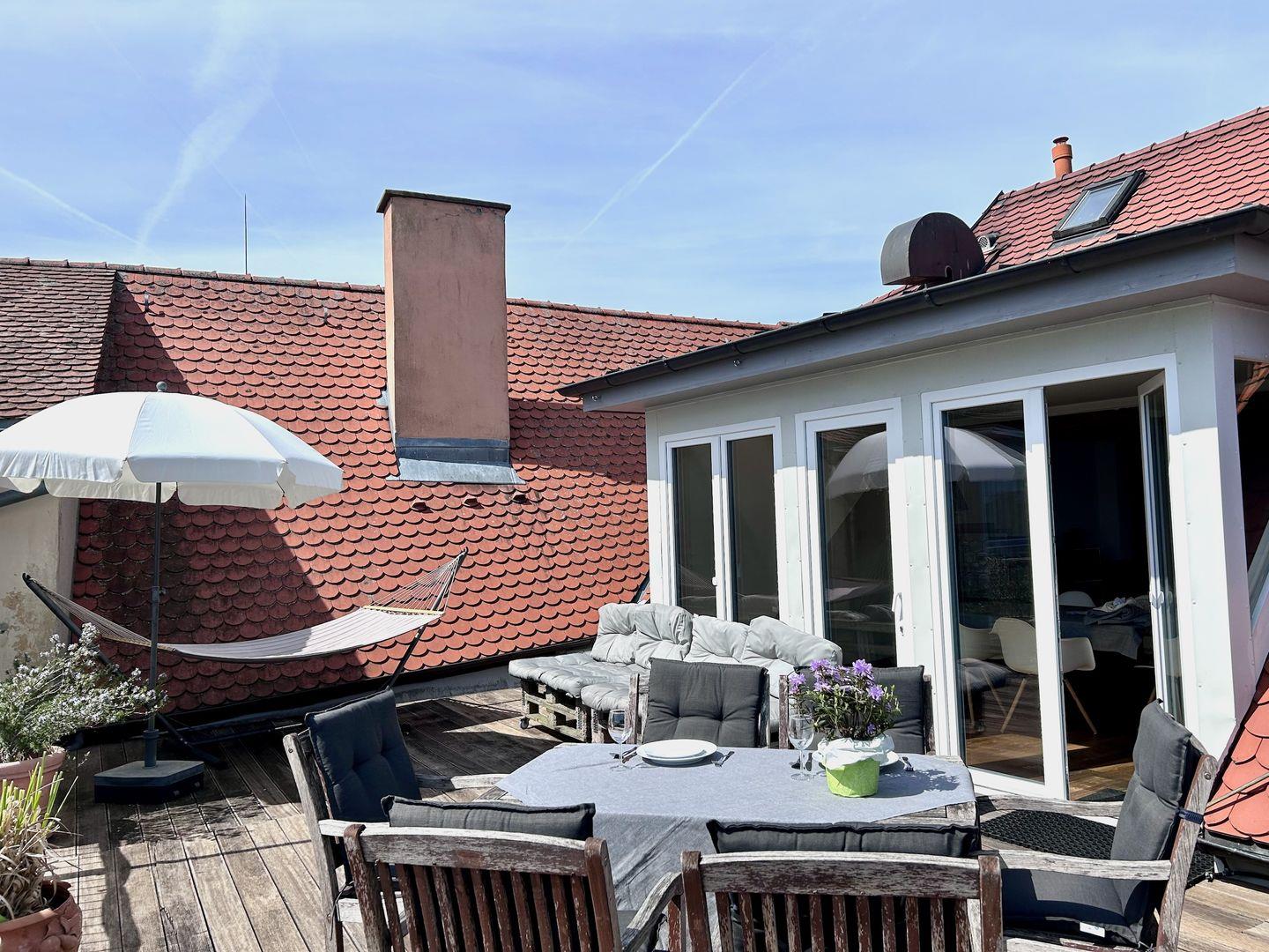 Tolle Maisonette-Ferienwohnung in der Altstadt von Lindau im 3. und 4. Stock mit zwei Schlafzimmern und zwei großzügigen Dachterrassen, die einen außergewöhnlichen Blick auf See und Berge bieten.