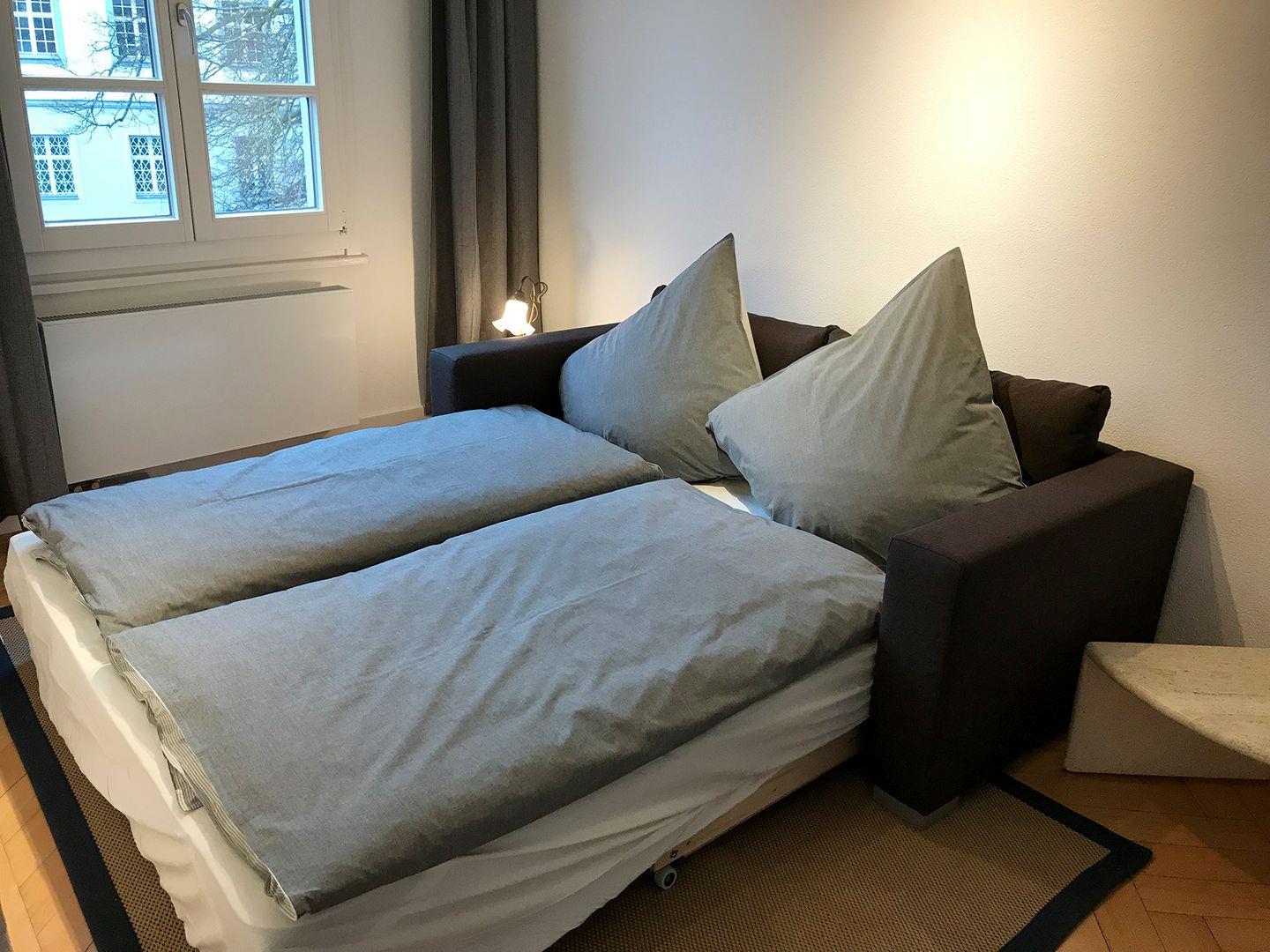 Die ca. 140 m² große Wohnung erstreckt sich über 3,5 Zimmer und verfügt über einen großen Wohn- und Essbereich mit integrierter Küche sowie zwei vom Wohnzimmer zugängliche Dachterrassen. Die Unterkunft bietet Platz für 4 bis 6 Personen: ein Doppelbett im Schlafzimmer, eine Schlafcouch im Durchgangszimmer und eine weitere Schlafcouch im Wohnbereich. Aufgrund der Treppensituation ist die Wohnung nicht für Menschen mit Gehbehinderung oder Kleinkinder geeignet. Das Hauptbadezimmer mit Badewanne befindet sich in der Nähe der Schlafzimmer, im oberen Stock steht ein weiteres Bad mit Dusche und WC zur Verfügung.