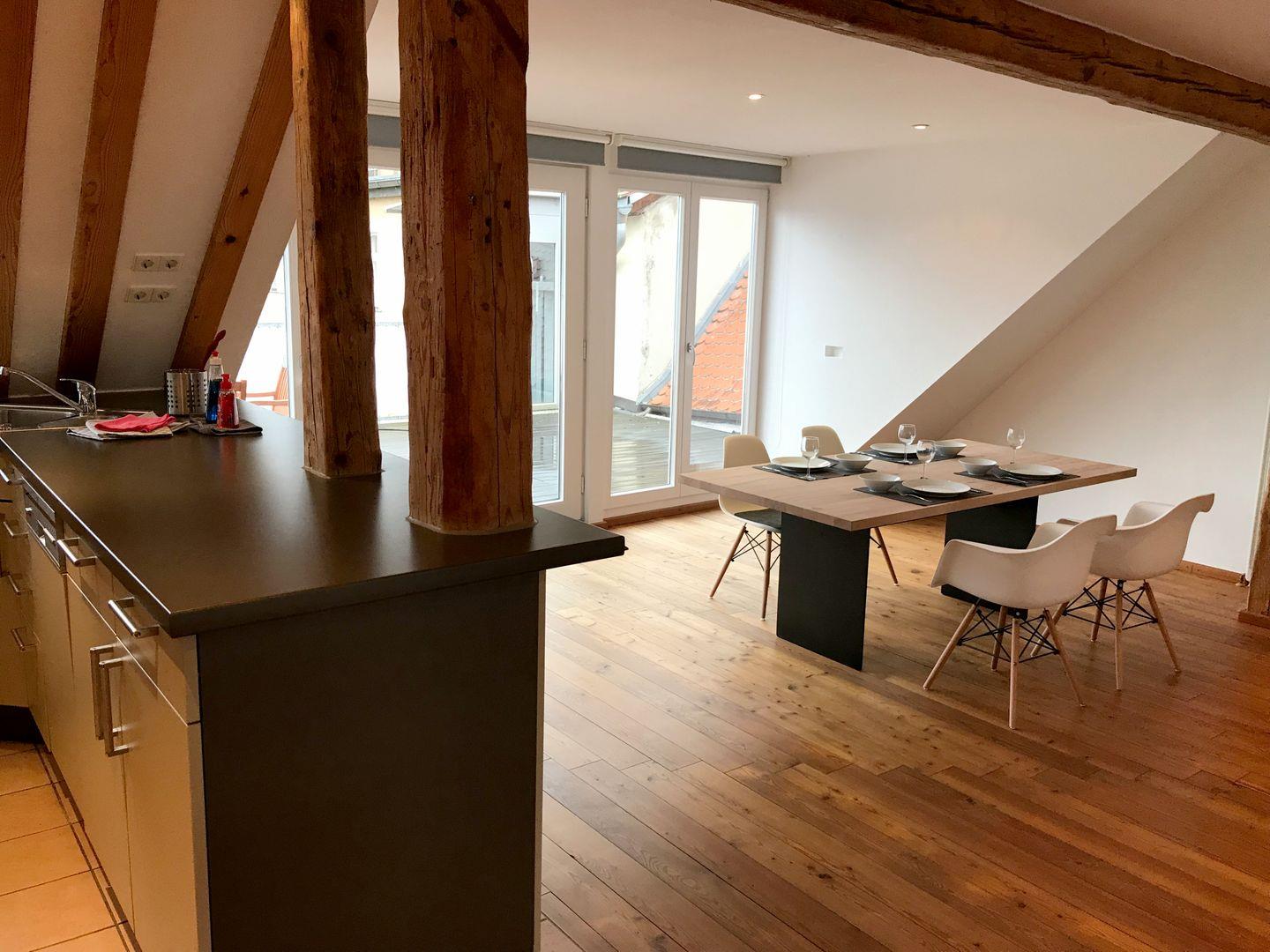 Nach einem erlebnisreichen Tag am See können Sie in der schönen Wohnküche ein Menü zubereiten und es zusammen mit einem Glas Wein auf der Dachterrasse mit Blick über Lindau und den Bodensee genießen. Bis zum Hafen sind es nur knapp 300 m, zum Bahnhof und zur nächsten Badestelle ca. 400 m. Fahrräder lassen sich am ca. 100 m entfernten, festinstallierten Fahrradständer beim Theater abstellen.
