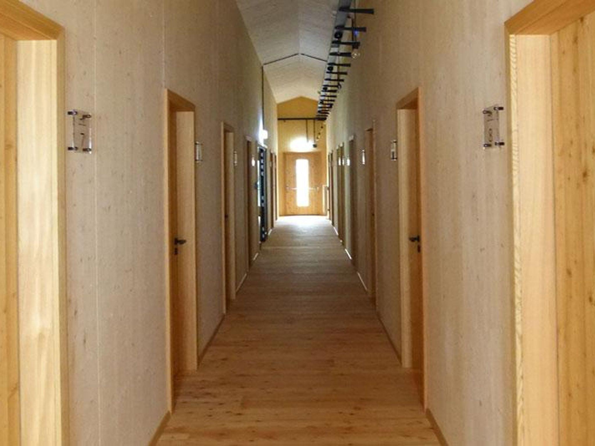 Zimmer sind mit Stockbetten, Sitzgelegenheit u. Steckdosen ausgestattet.