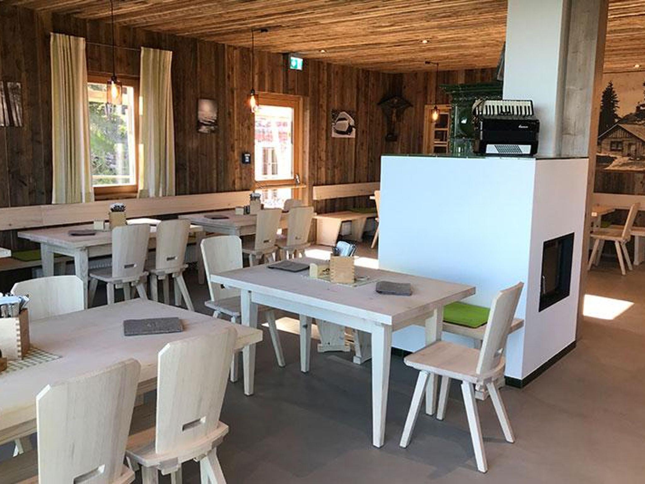 heller Gastraum mit Panoramafenster und Kachelofen.
