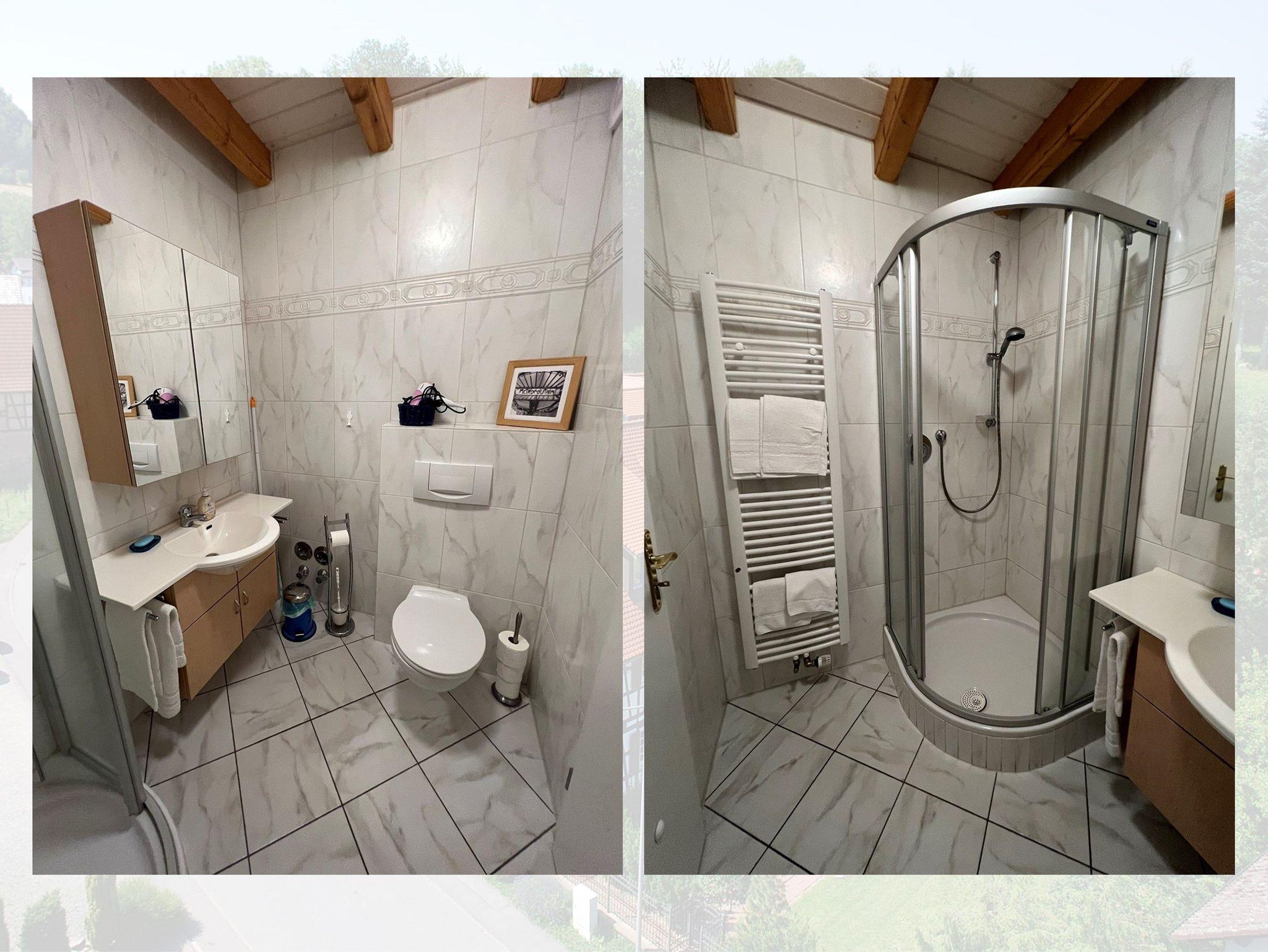 Das Badezimmer ist mit einer Dusche und WC ausgestattet und bietet den Komfort, den Sie nach einem langen Tag benötigen.