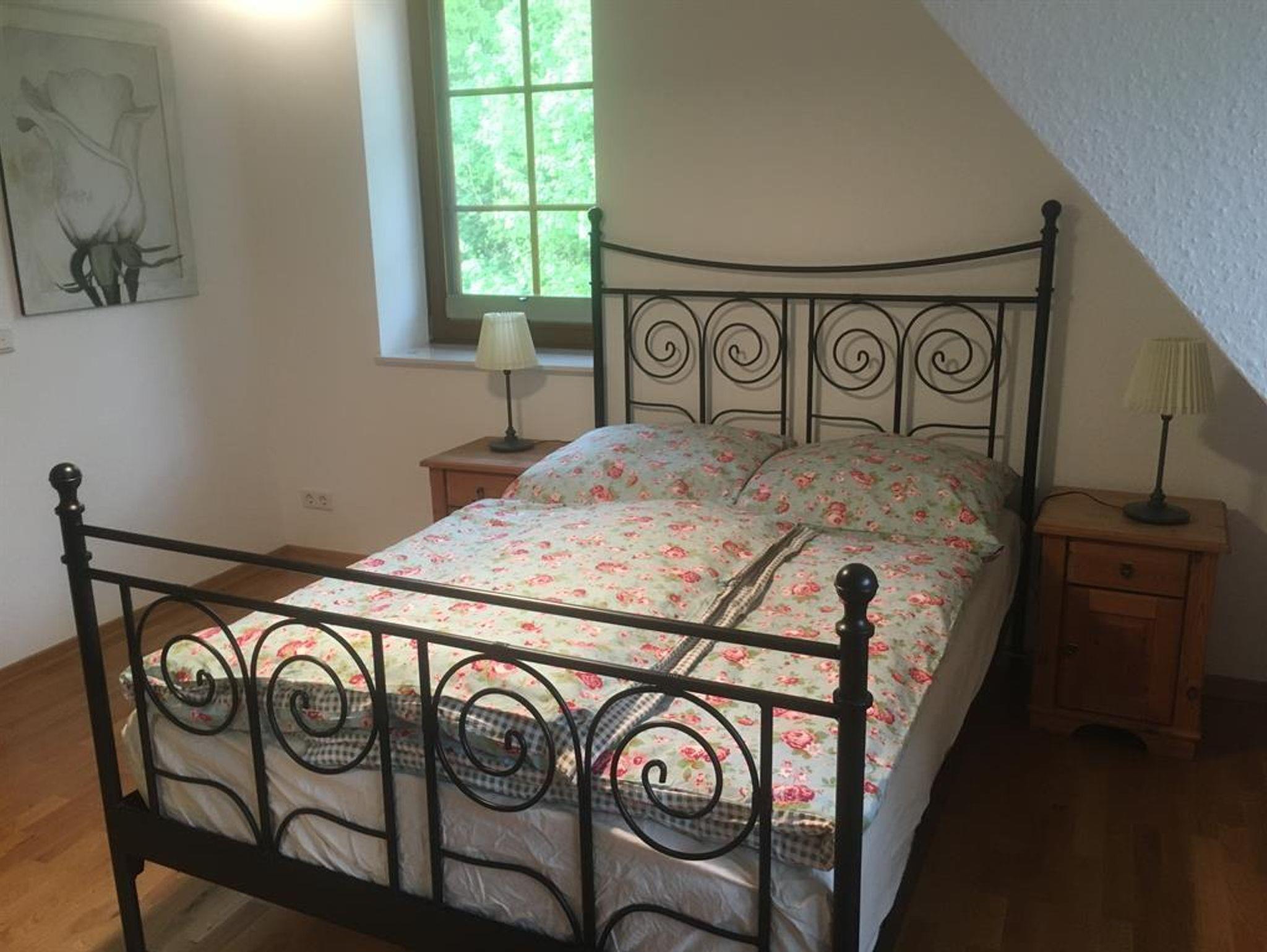 Buchbar ist sie als Kleine Ferienwohnung für 1-3 Personen (1 Schlafzimmer mit Doppelbett und angrenzendem Bad mit Dusche/WC, 1 Einzelbett im DG) oder als Große Ferienwohnung für 1-6 Personen (2 Schlafzimmer jeweils mit Doppelbett und angrenzendem Bad mit Dusche/WC, 1 Doppelbett im DG).