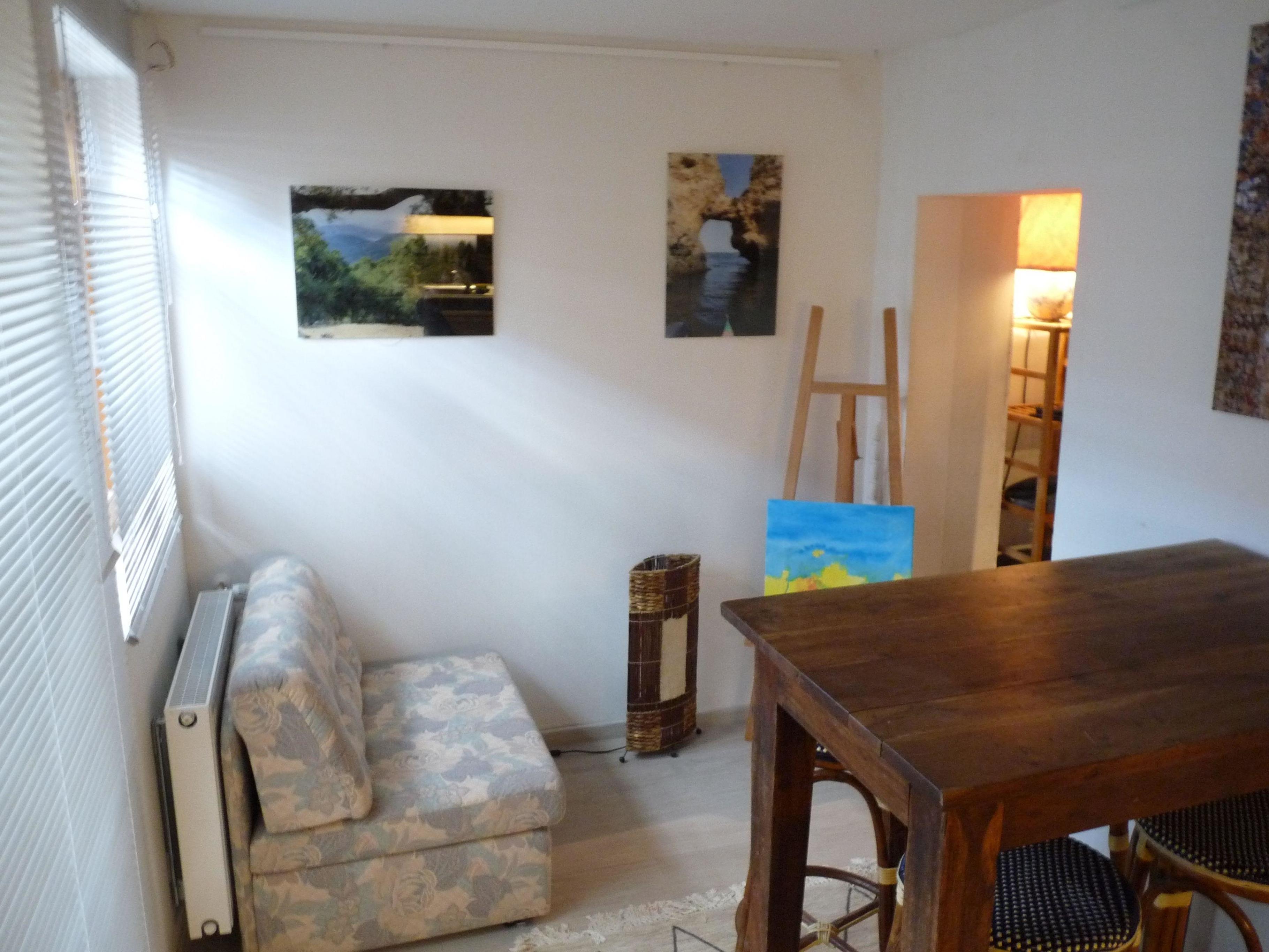 Das Atelierloft ist neu renoviert und sehr gemütlich eingerichtet mit meinen Künstlerfotos an den Wänden, Staffeleien mit Bildern im Raum